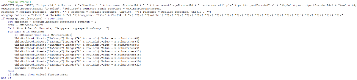 Привет! В парсере Delux есть кусок кода который парсит турнирку, хочу добавить турнирное положение с прошлых сезонов. Я с excel на Вы, может кто скинуть пример запроса(он ниже) с уже подставленными данными. oXMLHTTP.Open "GET", "https://d." & Sourcer & "x/feed/ss_1_" & tournamentEncodedId & "_" & tournamentStageEncodedId & "_table_overall?hp1=" & participantEncodedIds1 & "&hp2=" & participantEncodedIds2 & "&e=" & id, False Может смогу методом тыка по аналогии поменять код.