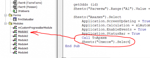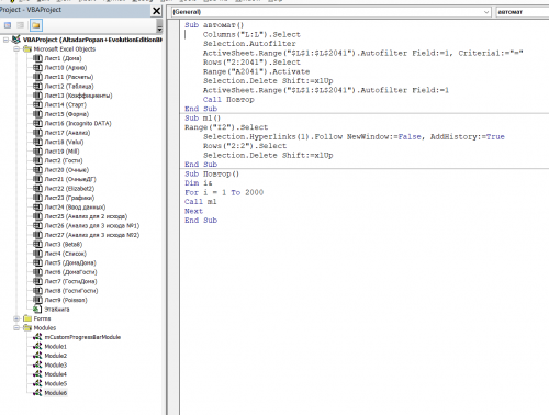 Добрый день! 1. Заходим в макросы и добавляем этот код в любой Module: Sub автомат() Columns("L:L").Select Selection.Autofilter ActiveSheet.Range("$L$1:$L$2041").Autofilter Field:=1, Criteria1:="=" Rows("2:2041").Select Range("A2041").Activate Selection.Delete Shift:=xlUp ActiveSheet.Range("$L$1:$L$2041").Autofilter Field:=1 Call Повтор End Sub Sub m1() Range("I2").Select On Error GoTo eh Selection.Hyperlinks(1).Follow NewWindow:=False, AddHistory:=True Rows("2:2").Select Selection.Delete Shift:=xlUp eh: Exit Sub End Sub Sub Повтор() Dim i& For i = 1 To 2000 Call m1 Next End Sub 2. В Module1 ищем макрос "Sub getGame(id As String)", мотаем в самый его конец и добавляем 2 строчки кода перед End Sub: Call ТоАрхив Sheets("Список").Select 3. В Module5 ищем макрос Sub ТоАрхив() и комментим или удаляем последнюю строку MsgBox "ДОБАВЛЕНО!.": 4. Добавляем кнопку и назначаем ей макрос - автомат Конец) p.s. Если вы сами не изменяли названия макросов, то всё должно сработать. Сделайте копию своей таблицы и потренируйтесь на ней.