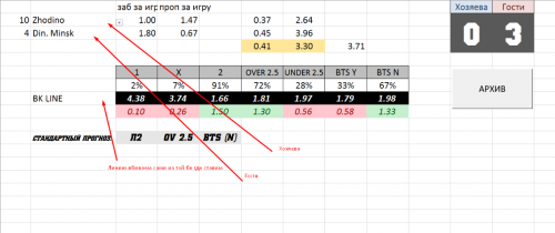 простенький калькулятор на основе так называемого "LГ" метода. что это за зверь? это альтернативная методика нахождения предполагаемого счета. нечто подобное я видел в некоторых турецких программах, немного подкорректировал и изменил до мега простоты. если так погонять, то выдает иногда очень интересные результаты. Нужно тестирование, ну если кто то автоматизирует процесс будет только в плюс..ну а если не зайдет, то и смысла нет в ней копаться... короче от меня чисто авторская разработка. таблицы брать только с сайта бетэксплорер /www.betexplorer.com пример: жмем сюда, чтобы вставить табицу выбираем команды которые играют и вбиваем линию. прогноз готов) тестим, делимся результатами) СИСТЕМА.xlsm