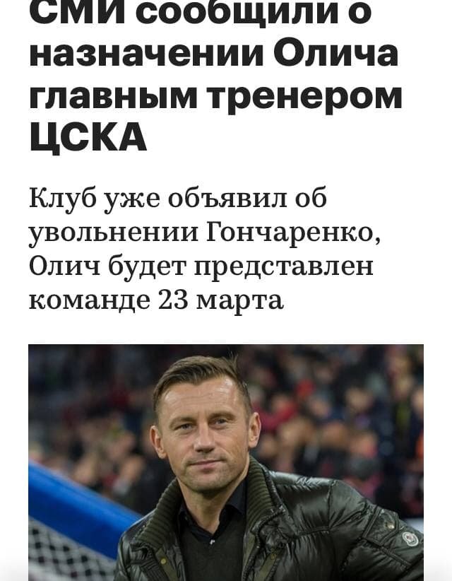 Win 110 Опубликовано 22 марта, 2021 Поделиться Опубликовано 22 марта, 2021 Ивица Олич подписал контракт с ЦСКА Уже завтра специалист будет представлен команде в качестве главного тренера! ЦСКА согласовал назначение экс-форварда клуба Ивицы Олича на пост главного тренера основной команды. Об этом «Чемпионату» сообщили два источника, не связанных друг с другом. «Олич и ЦСКА обсуждают финальные детали», — сказал один из источников «Чемпионату». Второй подтвердил эту информацию и добавил, что объявление появится в ближайшие дни. Ивица Олич выступал за ЦСКА в качестве футболиста с 2003 по 2006 год. 41-летний хорват провёл за «армейцев» 112 матчей и забил 41 гол. Сейчас он входит в тренерский штаб сборной Хорватии и занимает должность ассистента главного тренера. Подробнее на «Чемпионате»: https://www.championat.com/football/news-4299823-cska-soglasoval-naznachenie-olicha-na-post-glavnogo-trenera.html?utm_source=copypaste Цитата Ссылка на комментарий https://brcbet.com/topic/14057-smi-soobschili-o-naznachenii-olicha-glavnym-trenerom-tsska/ Поделиться на другие сайты Поделиться