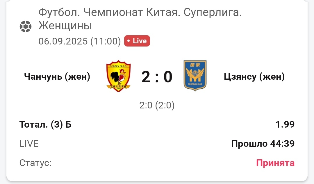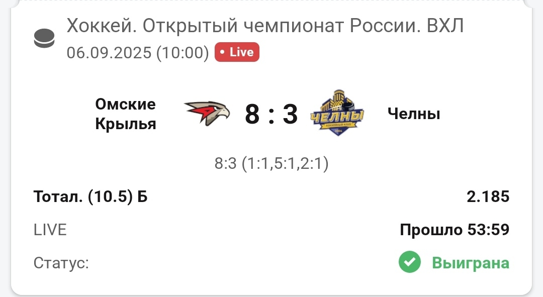 Постоянный JokerbetsAi 151 Опубликовано 28 сентября, 2025 Автор Постоянный Поделиться Опубликовано 28 сентября, 2025 Totals line: 0.5 • P(Over)=99% | P(Under)=1% • EV Over: 0.683 | EV Under: -0.979 Рекомендации по тоталам: • Totals: Over 0.5 — EV=0.683, P(Over)=99% Краткий комментарий: Система рекомендует ставить на победу хозяев (П1) из-за высокой вероятности их победы (71%) и положительного ожидаемого значения (EV=0.272). Также ставка на тотал больше 0.5 выглядит крайне надежной с вероятностью 99% и высоким EV=0.683. Цитата Ссылка на комментарий https://brcbet.com/topic/226336-ograblenie-bukmekera-sezon-3/page/58/#findComment-513365 Поделиться на другие сайты Поделиться
