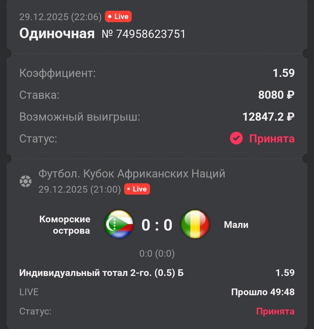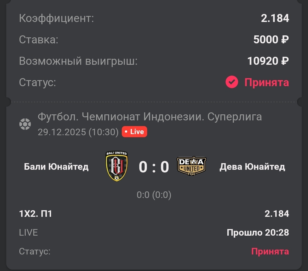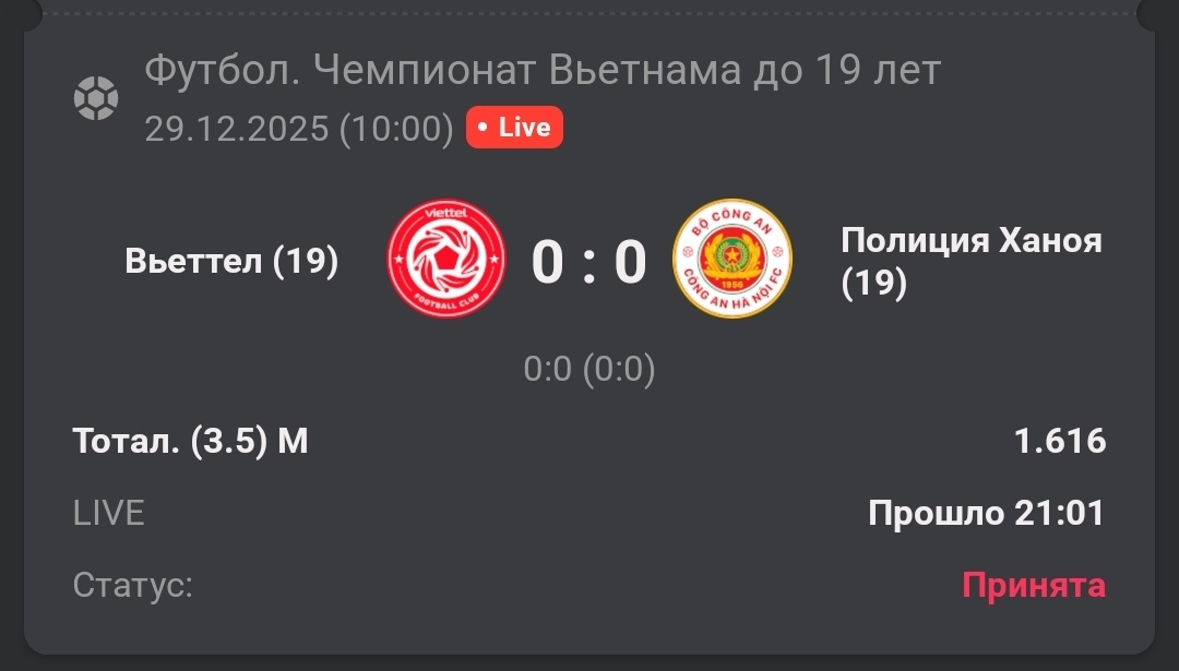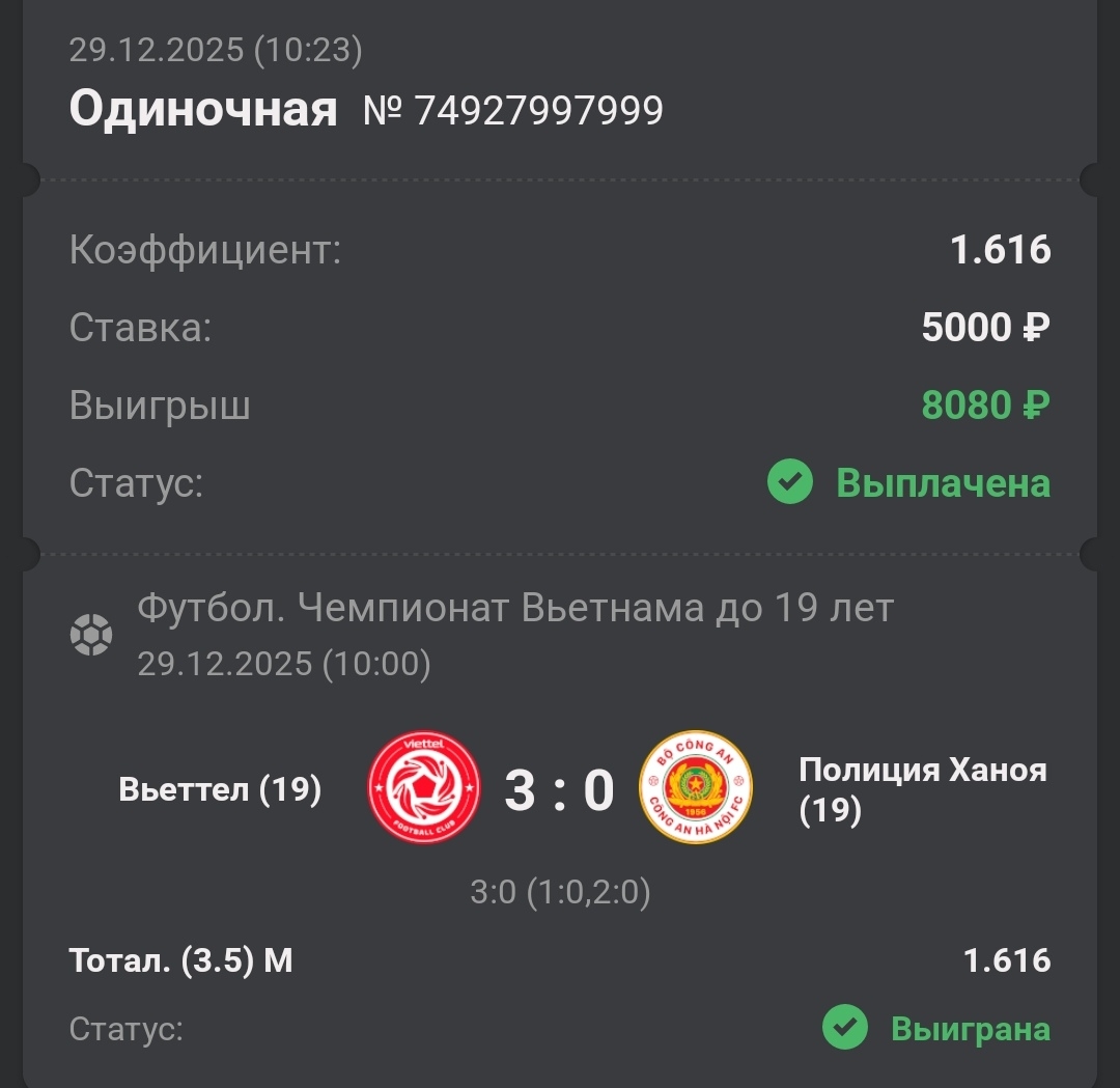 Постоянный JokerbetsAi 151 Опубликовано 29 декабря, 2025 Автор Постоянный Поделиться Опубликовано 29 декабря, 2025 11 часов назад, JokerbetsAi сказал: Марафон 1. 5000рублей ТМ 3.5 Банк 8080 руб Цитата Ссылка на комментарий https://brcbet.com/topic/226336-ograblenie-bukmekera-sezon-3/page/58/#findComment-518703 Поделиться на другие сайты Поделиться