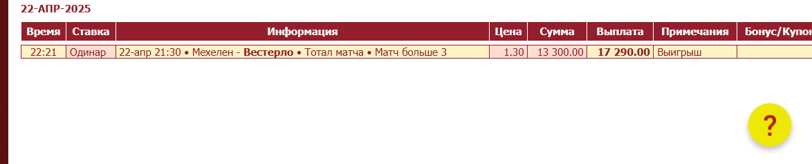 Постоянный Turbo 369 Опубликовано 23 апреля Автор Постоянный Поделиться Опубликовано 23 апреля Сан хосе - канзас 2-3 , + 4 700 р сантос лагуна - тихуна 0-4 , итого + 8200 р Атлетико го - куяба , угловые 10 , + 2400 р интернасиональ - насиональ 3-3 , первый гол от интернасионаля на 45+2 , + 7 800 р Прибыль апрель + 29 500 р 1 Цитата Ссылка на комментарий https://brcbet.com/topic/268042-tochnye-prognozy-na-futbol/page/64/#findComment-505071 Поделиться на другие сайты Поделиться