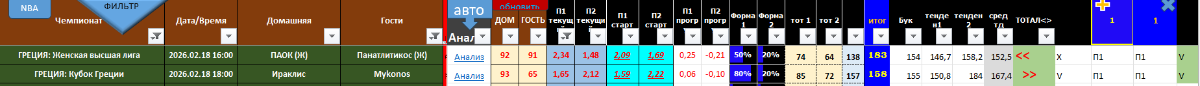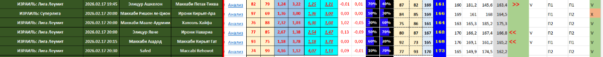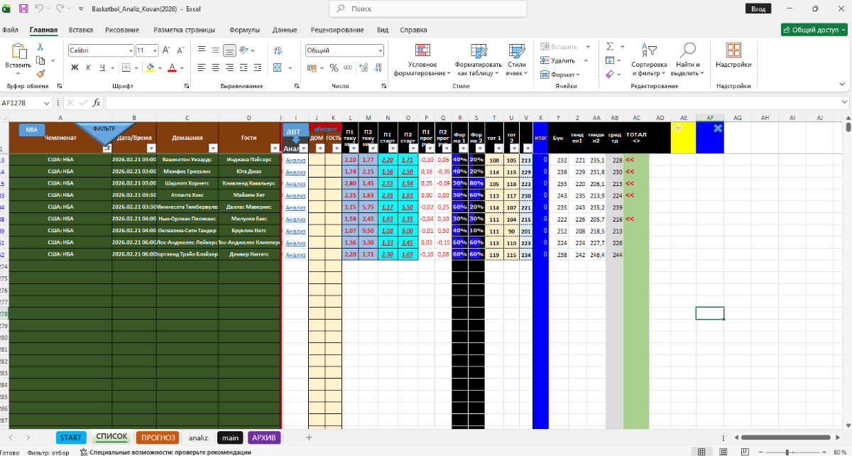 kovan 2 094 Опубликовано 19 февраля Автор Поделиться Опубликовано 19 февраля Программа в процессе настройки: смените формулу в ячейках AG это проверка совпал-ли прогноз П1,П2 с итогом игры: =ЕСЛИ(X2=0; ""; ЕСЛИ(AE2=AF2; "V"; "X")) формулу записываем для ячейки AG2, потом щёлкаем нижний угол ячейки и протягиваем вниз ячеек на 300-500 2 Цитата Ссылка на комментарий https://brcbet.com/topic/381113-basketbol-analizi_fx-mod-kovan/page/51/#findComment-520760 Поделиться на другие сайты Поделиться