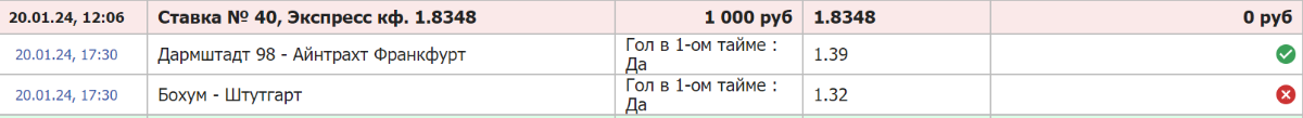 20.01.24, 17:30 Дармштадт 98 - Айнтрахт Франкфурт 1-й тайм забьет - Айнтрахт Франкфурт : Да КЭФ 1.90