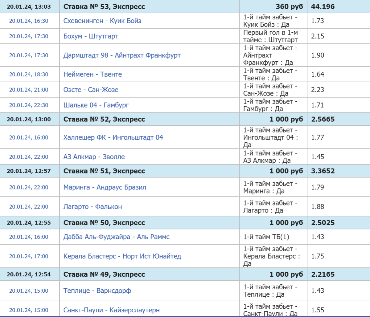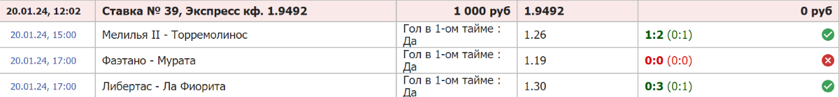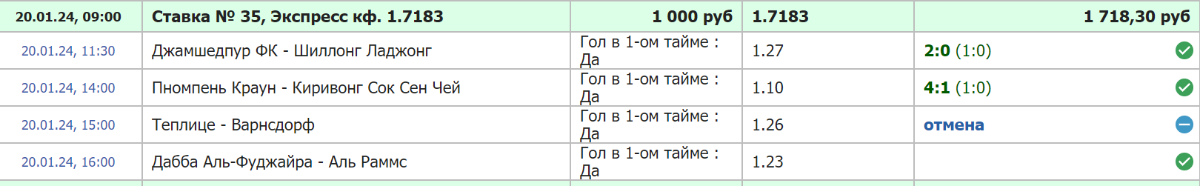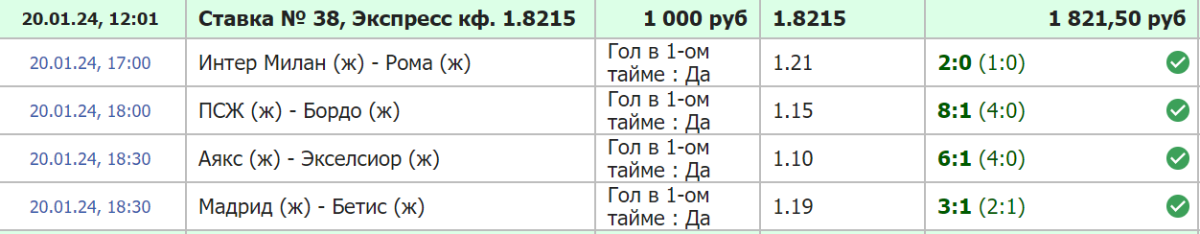 25 ставок на ГОЛ в 1-м тайме, из них 4 не зашли, 1 отменен матч, 20 зашла.