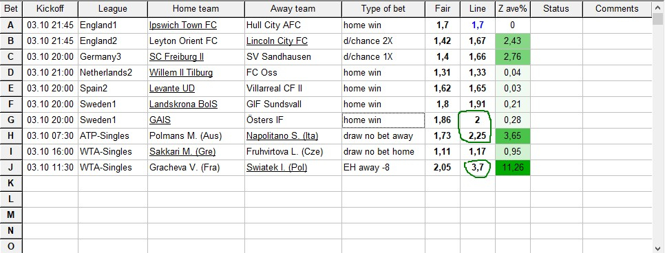 Koyaanisquatsi Hopi 99 Опубликовано 3 октября, 2023 Поделиться Опубликовано 3 октября, 2023 Вчерашние результаты еще не обновились, выкладываю пока таблицу на сегодняшний день. 03.10.23. Кто то пробовал ставить в лайве по этой проге? есть результат? Цитата Ссылка на комментарий https://brcbet.com/topic/42-odds-wizard/page/65/#findComment-391236 Поделиться на другие сайты Поделиться