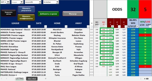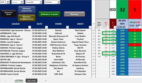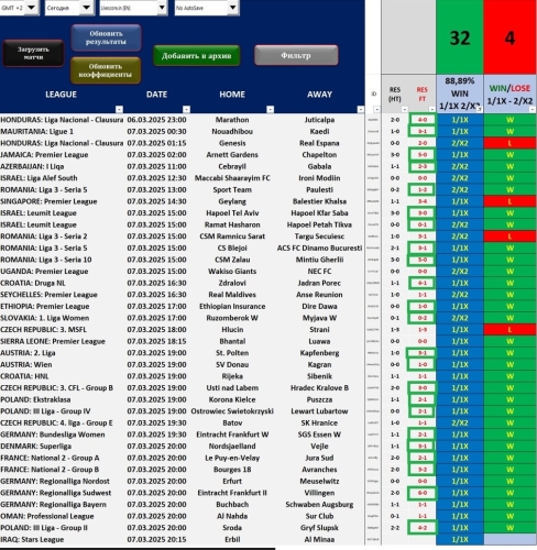 Hacker 114 Опубликовано 7 сентября, 2024 Поделиться Опубликовано 7 сентября, 2024 2 часа назад, Druskoking777 сказал: Еще один пример фильтра более 2,5 целей. 4 столбца, которые я обвел красной рамкой, должны фильтровать более 65 %. Я отфильтровал коэффициенты на тотал более 2,5 голов. 1,40 или выше Применяя этот фильтр, на данный момент выполнено 17 матчей, и только 3 ошибки отмечены красным. По тоталу: из 36 событий ( 32+,2-,2 в игре ) при кф. от 1.4. Кф. от 1.7 и выше: 4+ ( без минусов ) 3 Цитата Ссылка на комментарий https://brcbet.com/topic/429302-football-elizabet_-plus_pro-beton3in1-2024/#findComment-487754 Поделиться на другие сайты Поделиться