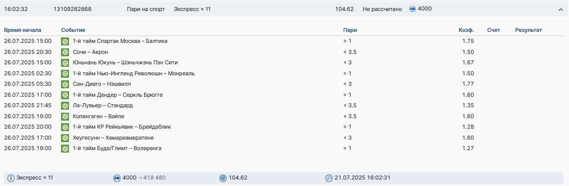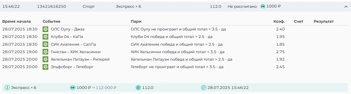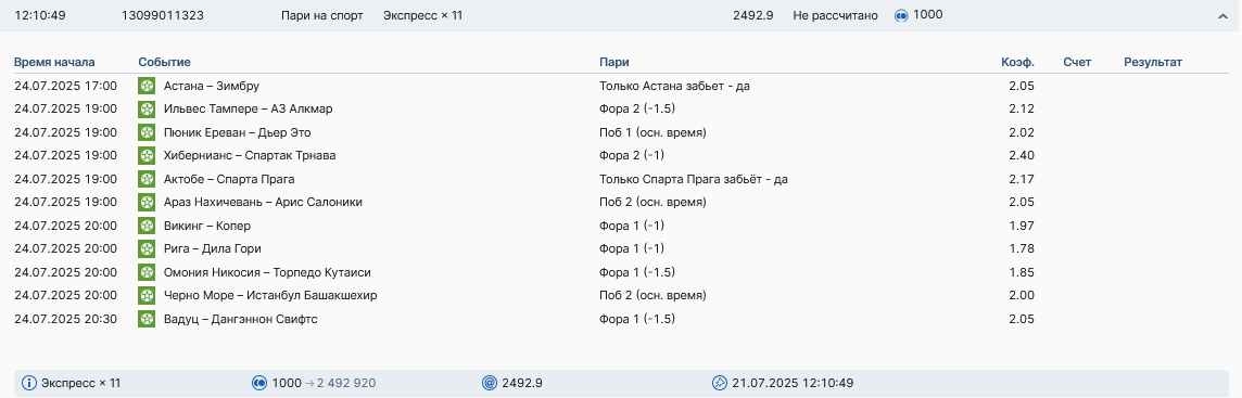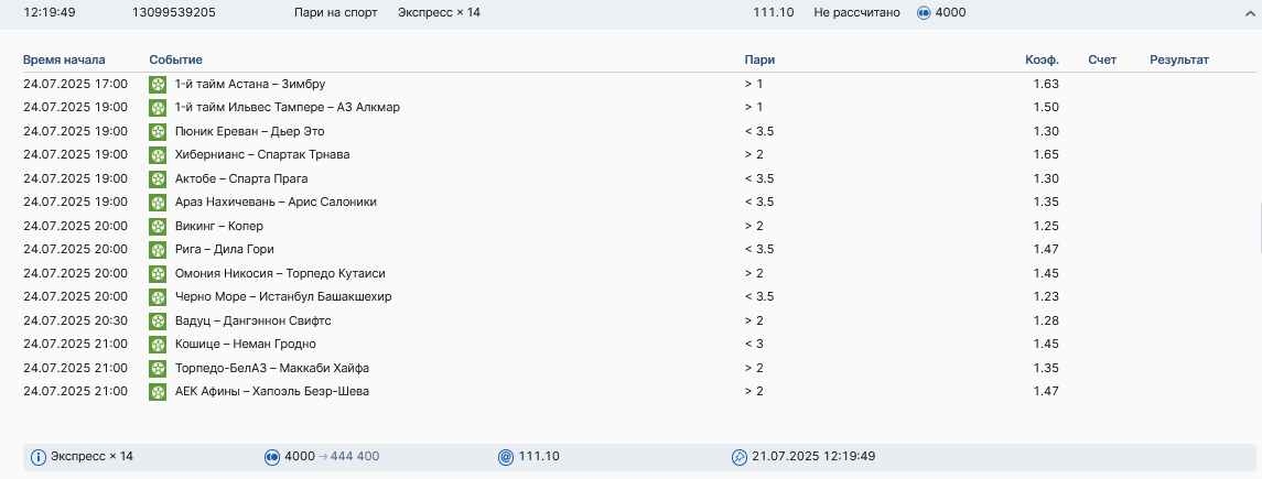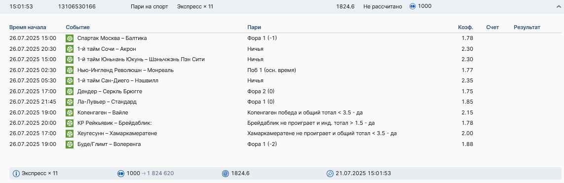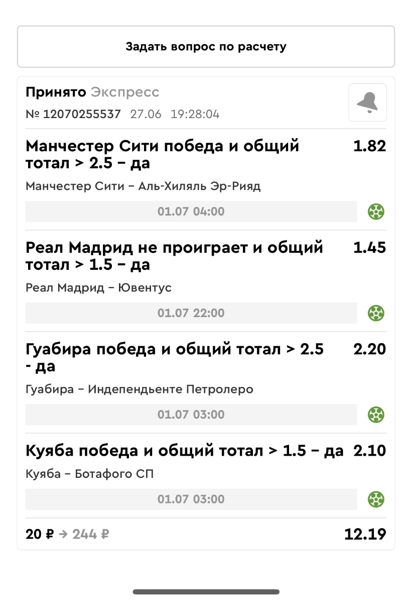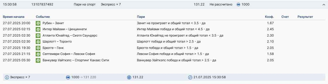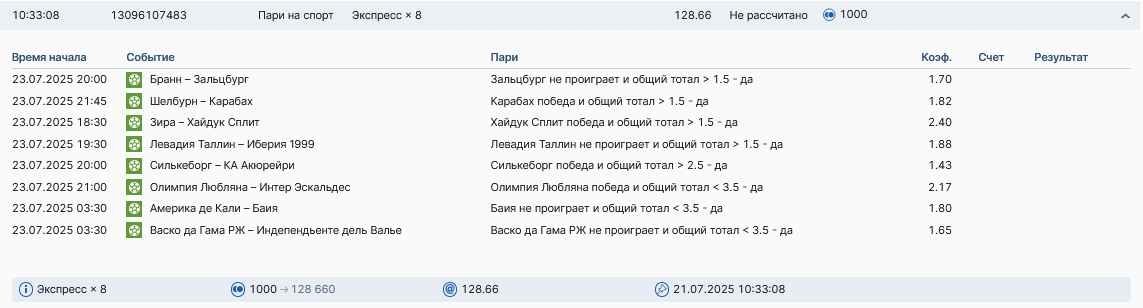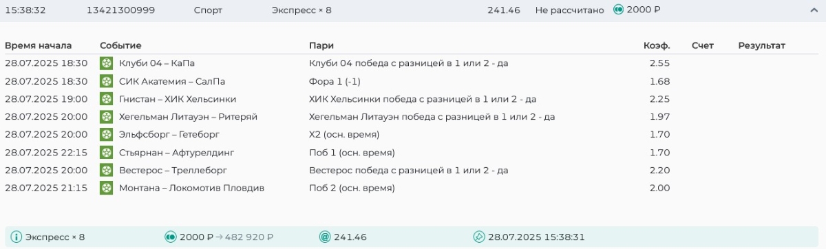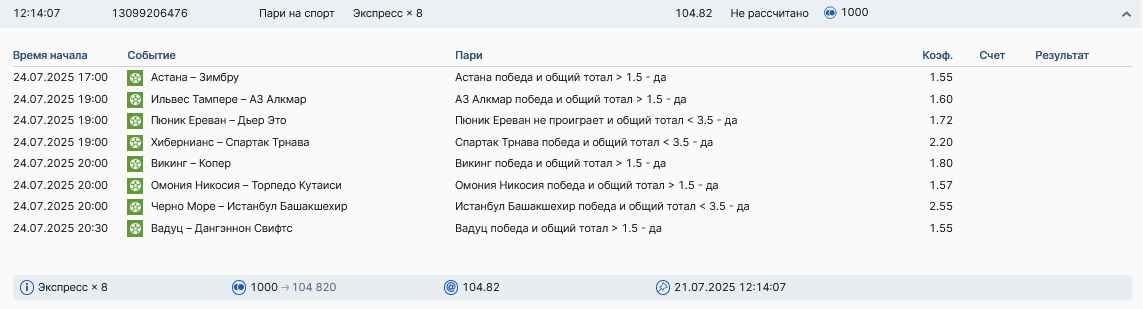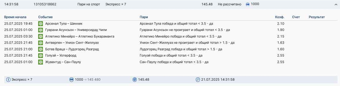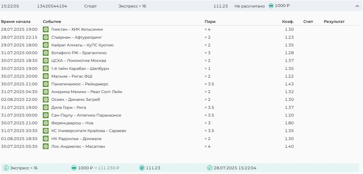 Koyaanisquatsi Hopi 98 Опубликовано 28 июля Автор Поделиться Опубликовано 28 июля На прошлой неделе все экспрессы проиграны, за неделю - 60 000, за год по экспрессам - 778 500 ₽, за июль - 245 000. Экспрессы с проставлением на неделю вперед себя не оправдывают, возвращаемся к системе ежедневных экспрессов. Экспрессы на 28.07.25 а так же недельные экспрессы до 03.08.25. Цитата Ссылка на комментарий https://brcbet.com/topic/429498-master-klass-po-razdevaniyu-bukmekera-tolko-fevral/page/23/#findComment-509428 Поделиться на другие сайты Поделиться