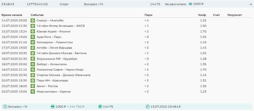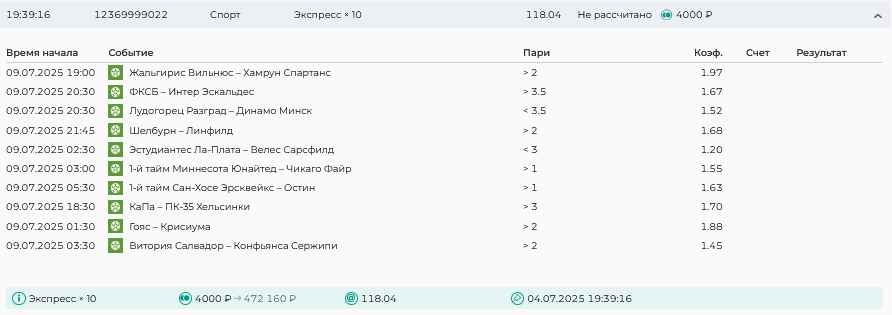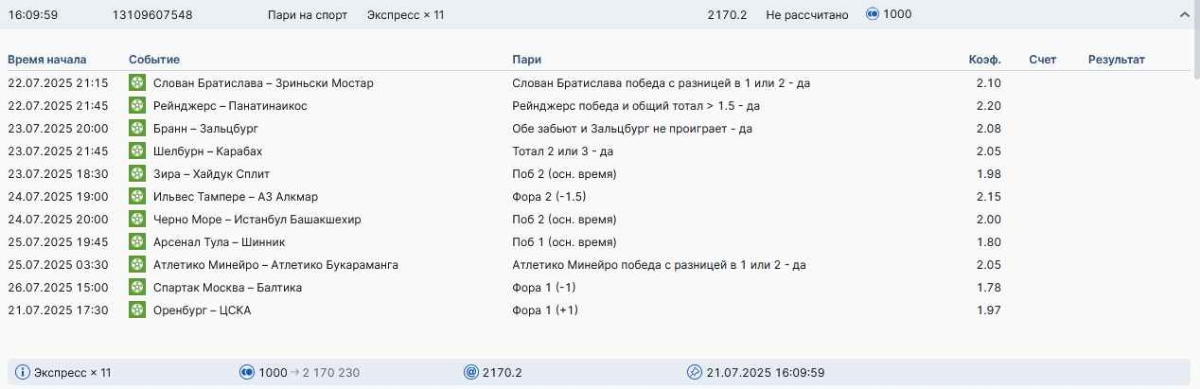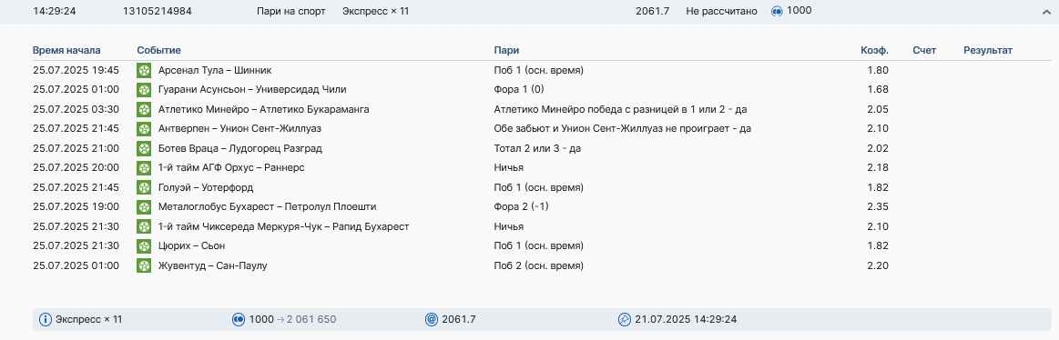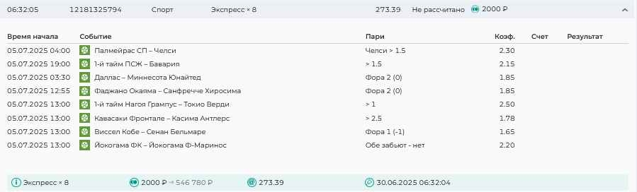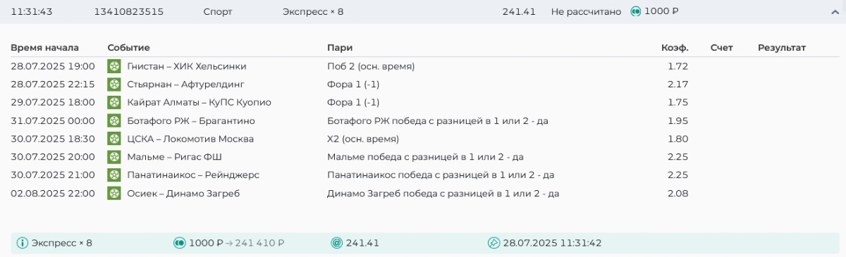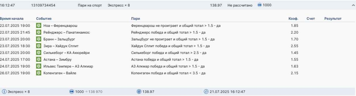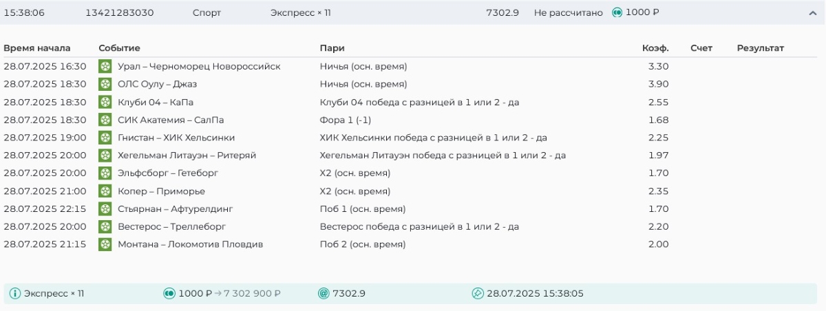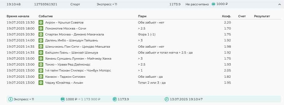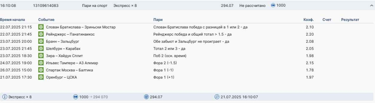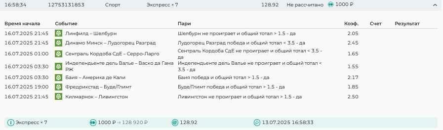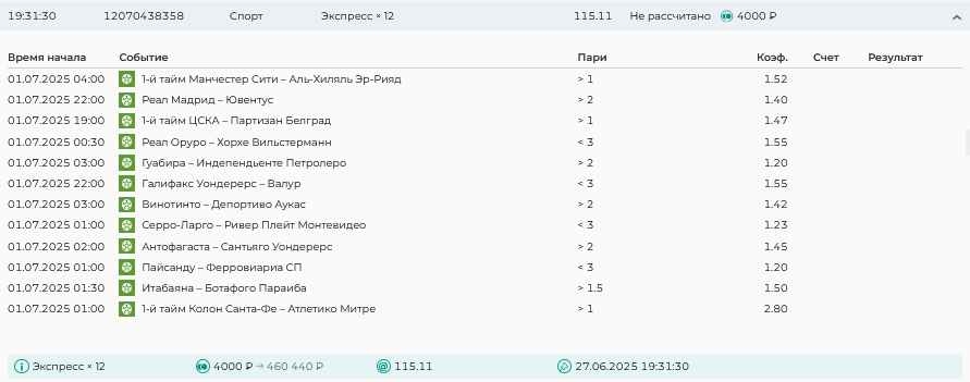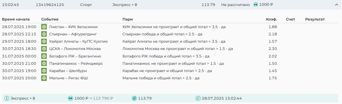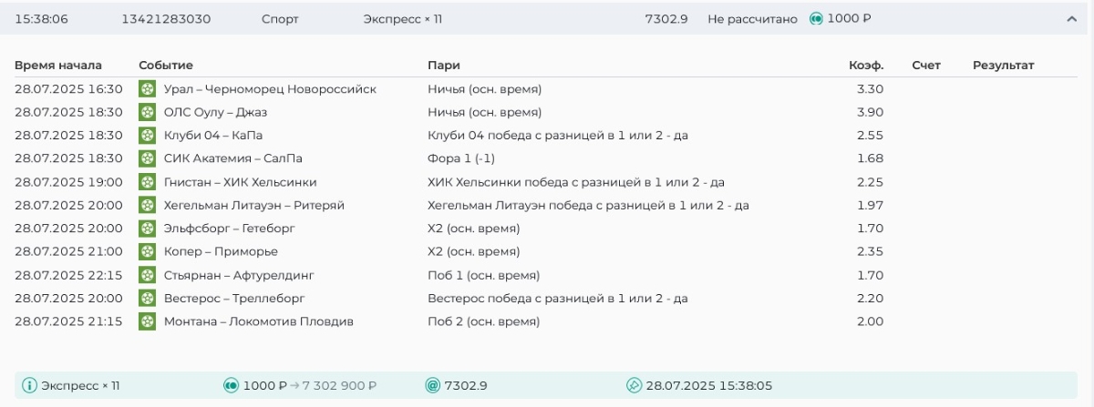 Koyaanisquatsi Hopi 98 Опубликовано 28 июля Автор Поделиться Опубликовано 28 июля На прошлой неделе все экспрессы проиграны, за неделю - 60 000, за год по экспрессам - 778 500 ₽, за июль - 245 000. Экспрессы с проставлением на неделю вперед себя не оправдывают, возвращаемся к системе ежедневных экспрессов. Экспрессы на 28.07.25 а так же недельные экспрессы до 03.08.25. Цитата Ссылка на комментарий https://brcbet.com/topic/429498-master-klass-po-razdevaniyu-bukmekera-tolko-fevral/page/23/#findComment-509428 Поделиться на другие сайты Поделиться