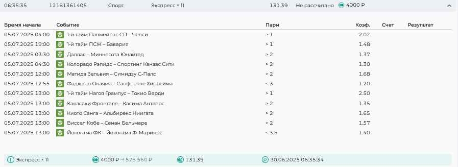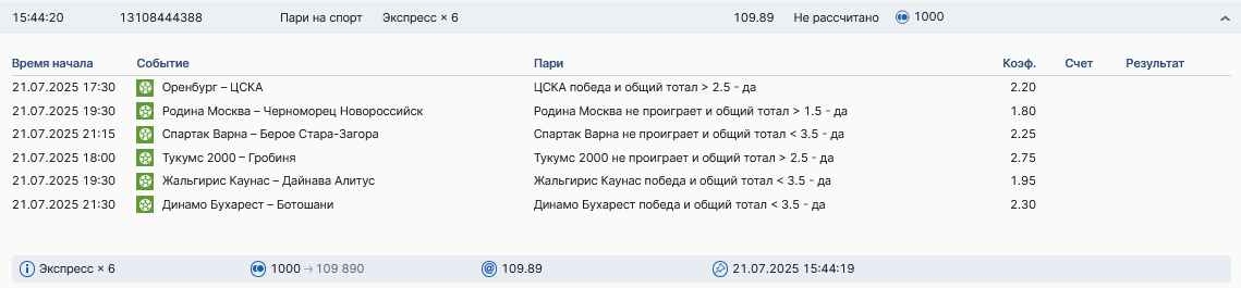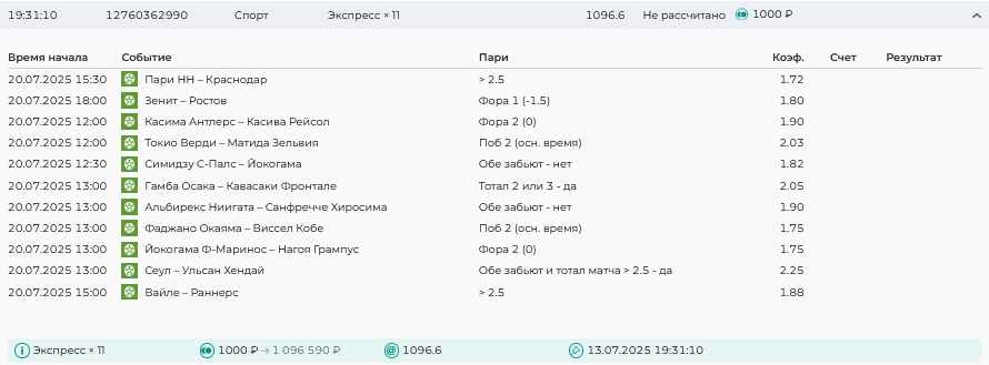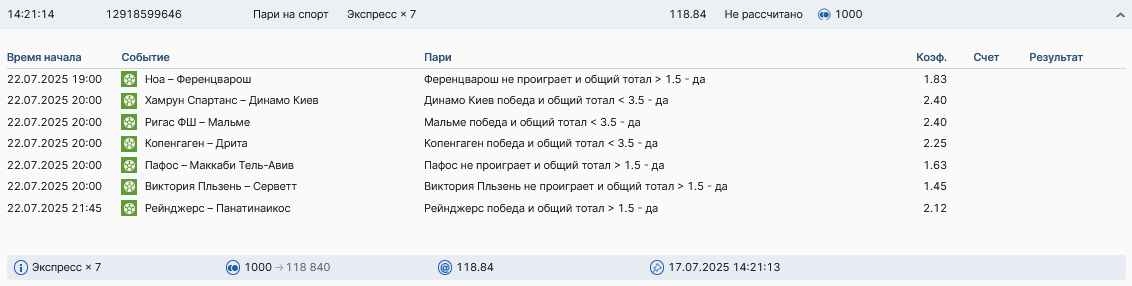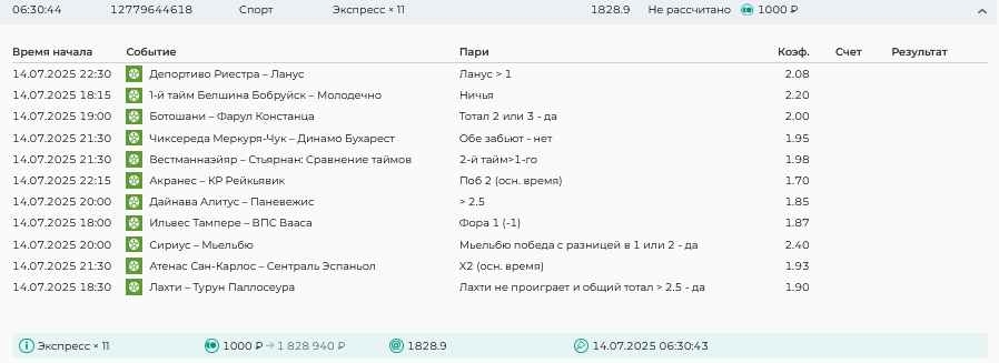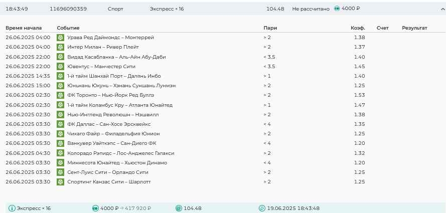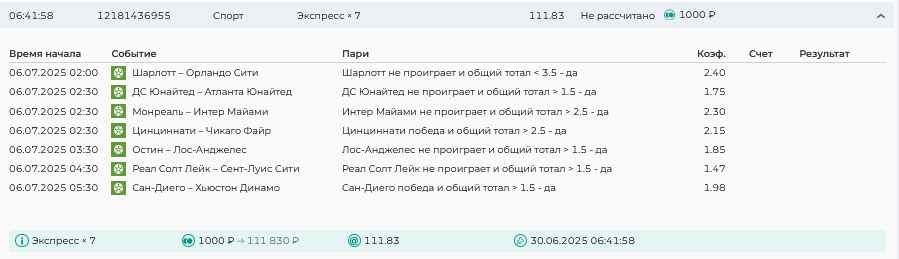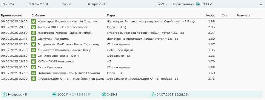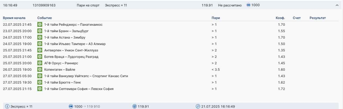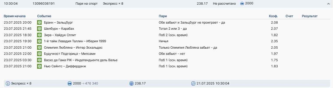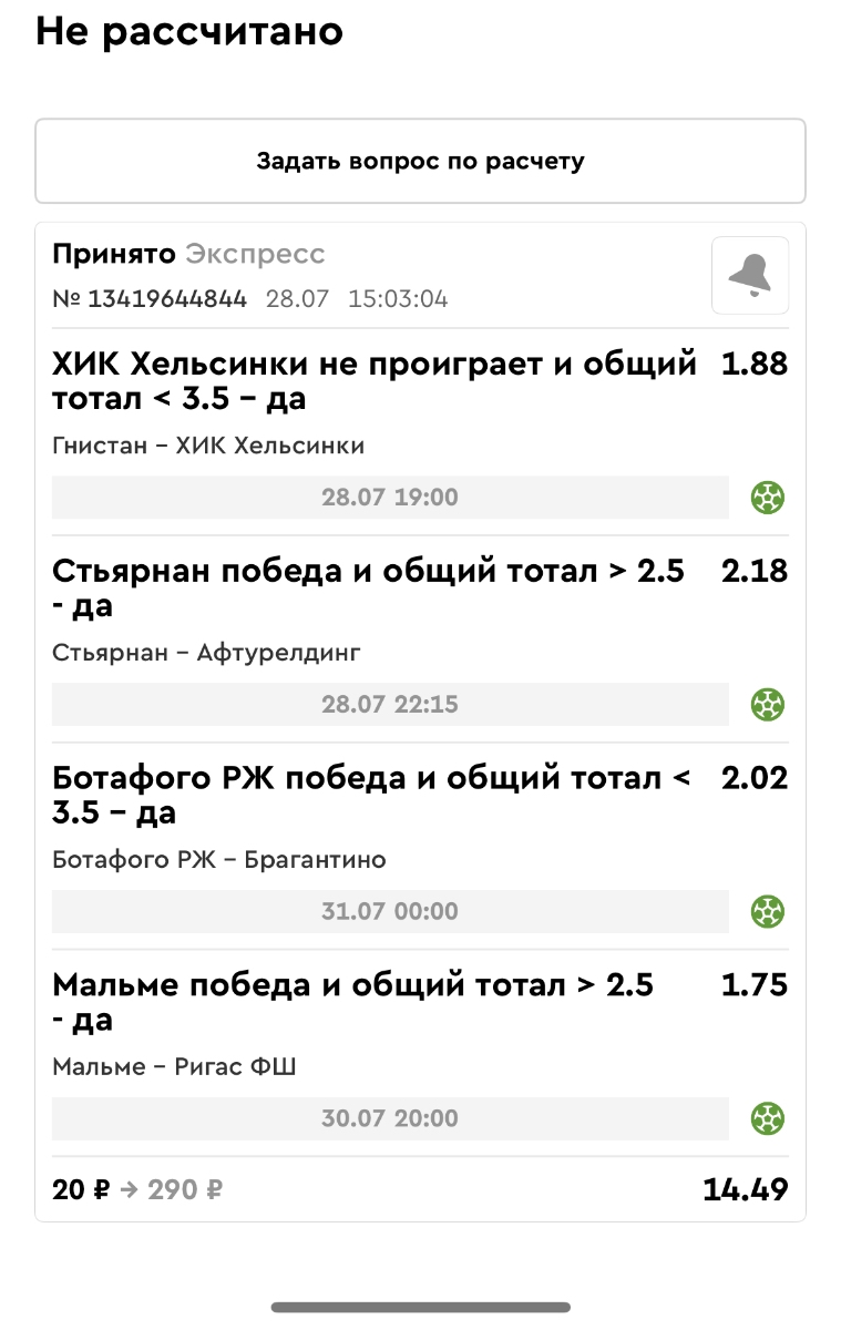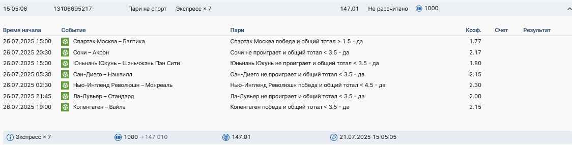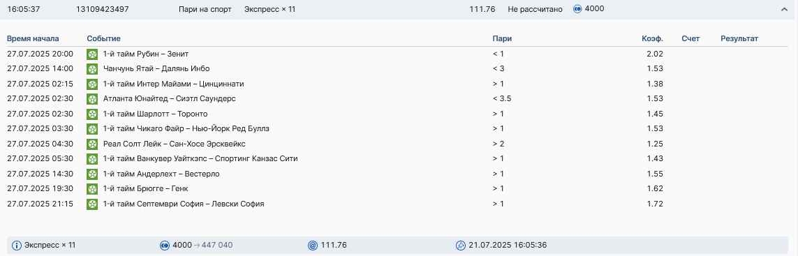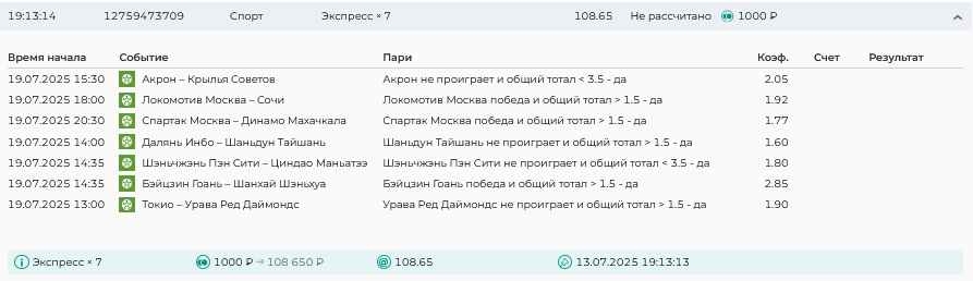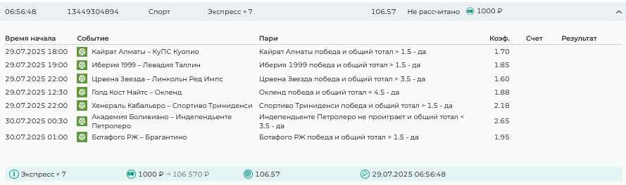 Koyaanisquatsi Hopi 98 Опубликовано 28 июля Автор Поделиться Опубликовано 28 июля На прошлой неделе все экспрессы проиграны, за неделю - 60 000, за год по экспрессам - 778 500 ₽, за июль - 245 000. Экспрессы с проставлением на неделю вперед себя не оправдывают, возвращаемся к системе ежедневных экспрессов. Экспрессы на 28.07.25 а так же недельные экспрессы до 03.08.25. Цитата Ссылка на комментарий https://brcbet.com/topic/429498-master-klass-po-razdevaniyu-bukmekera-tolko-fevral/page/23/#findComment-509428 Поделиться на другие сайты Поделиться