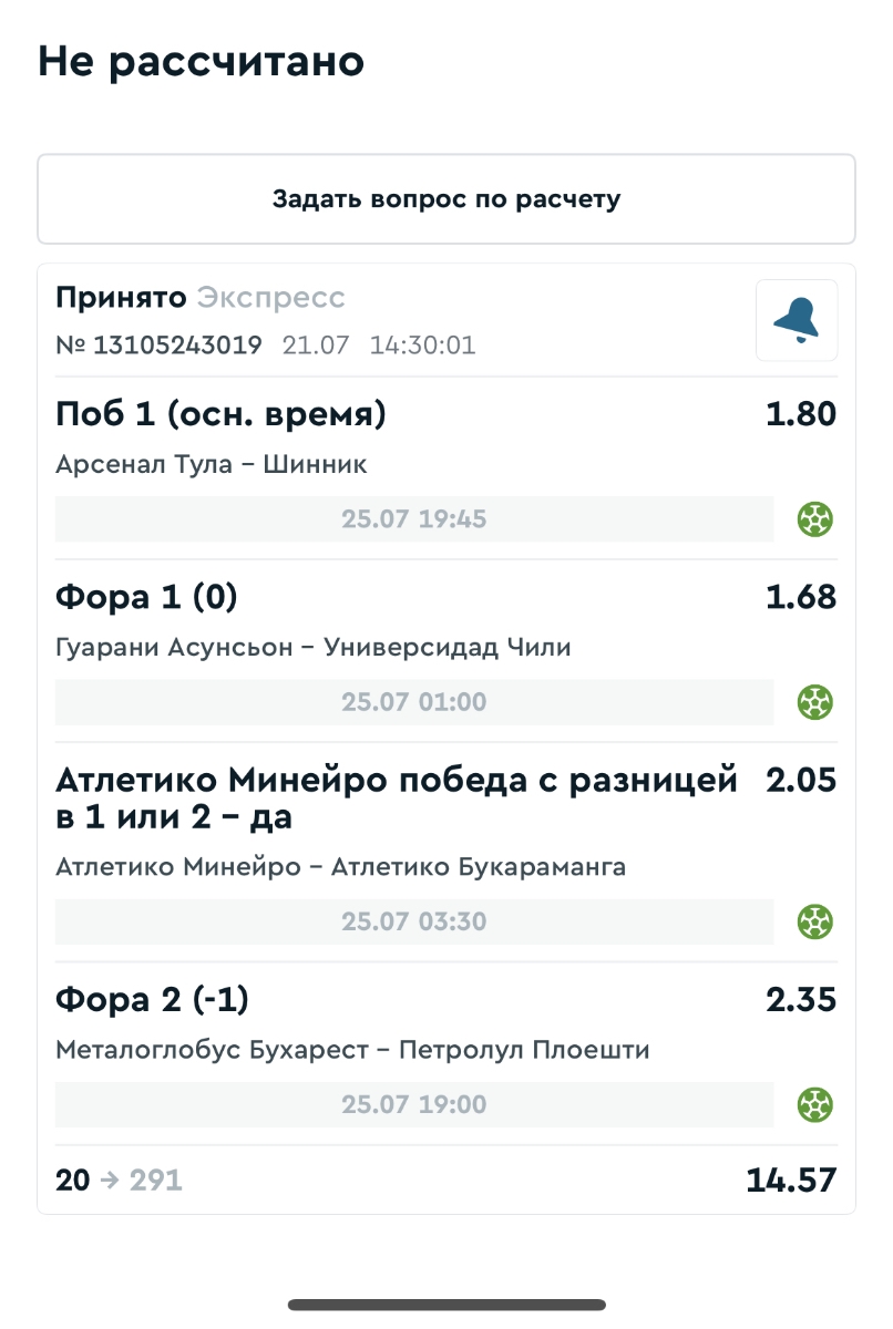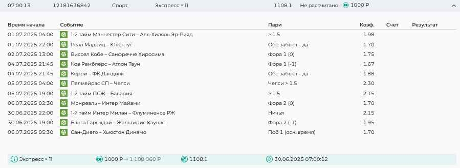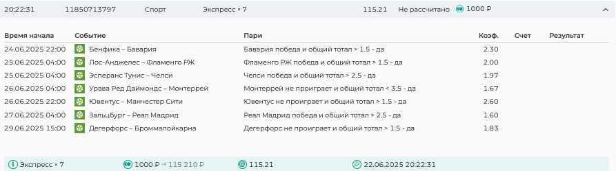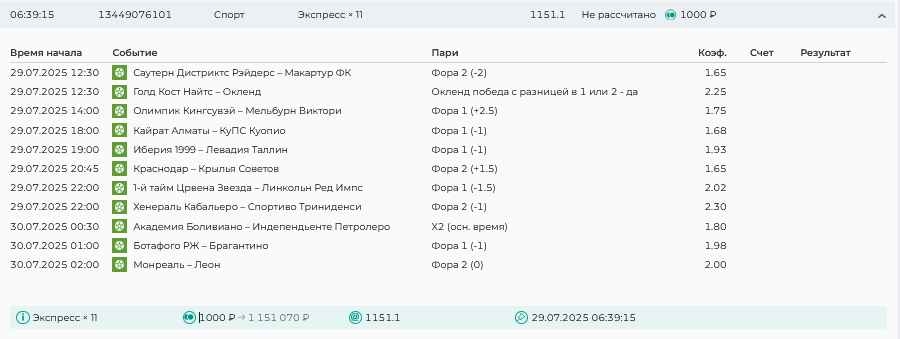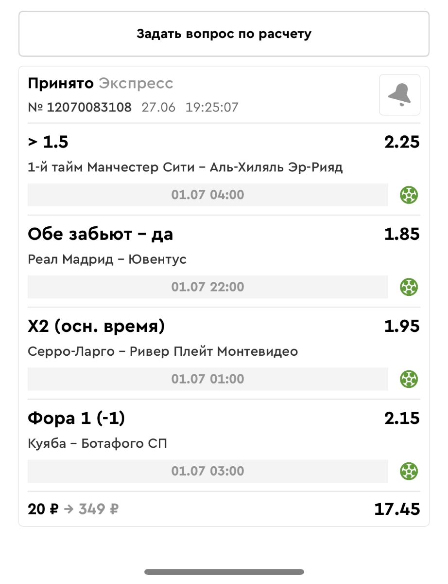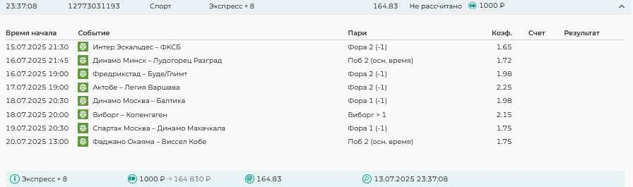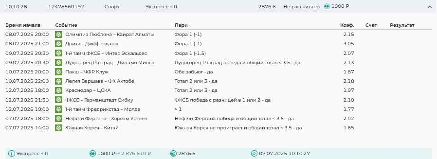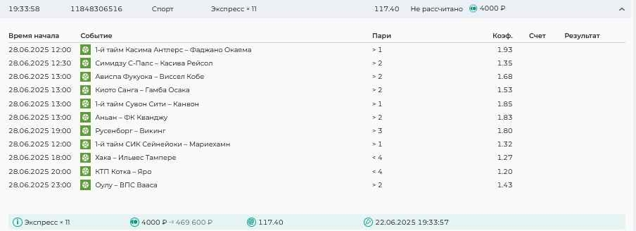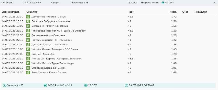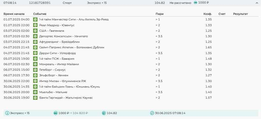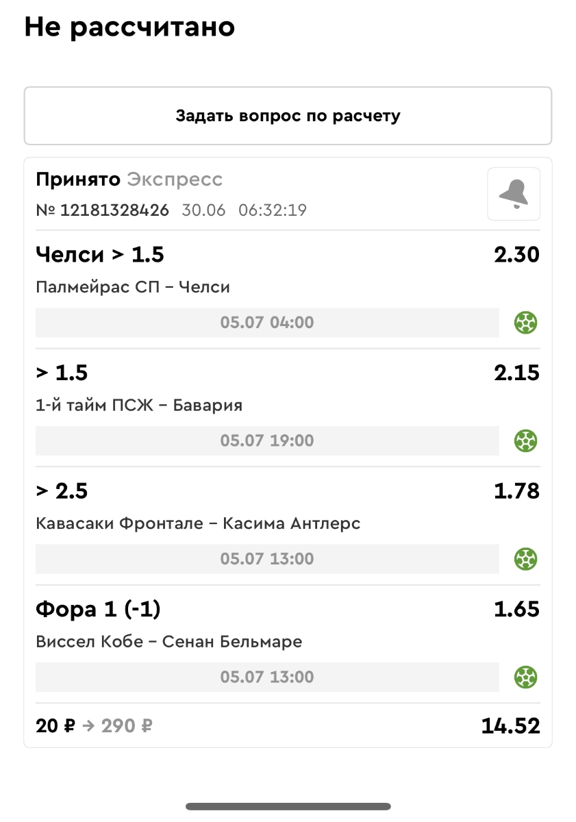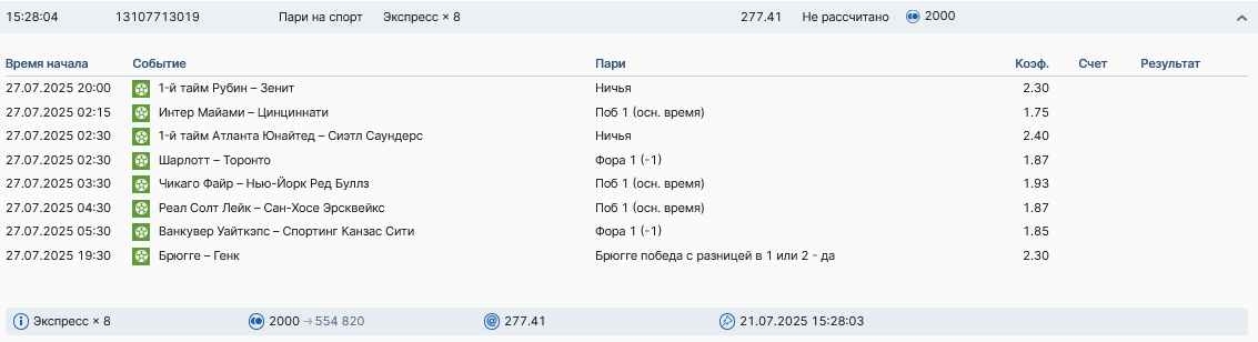 Koyaanisquatsi Hopi 98 Опубликовано 28 июля Автор Поделиться Опубликовано 28 июля На прошлой неделе все экспрессы проиграны, за неделю - 60 000, за год по экспрессам - 778 500 ₽, за июль - 245 000. Экспрессы с проставлением на неделю вперед себя не оправдывают, возвращаемся к системе ежедневных экспрессов. Экспрессы на 28.07.25 а так же недельные экспрессы до 03.08.25. Цитата Ссылка на комментарий https://brcbet.com/topic/429498-master-klass-po-razdevaniyu-bukmekera-tolko-fevral/page/23/#findComment-509428 Поделиться на другие сайты Поделиться