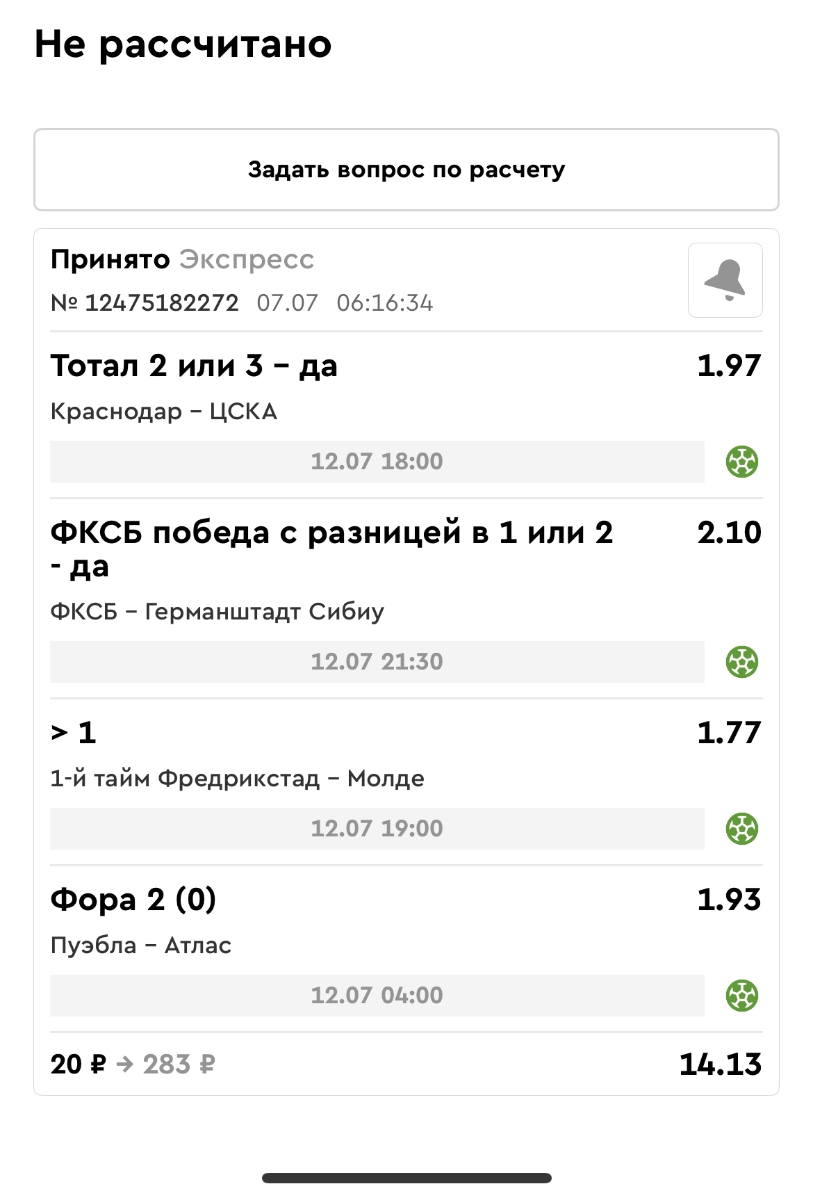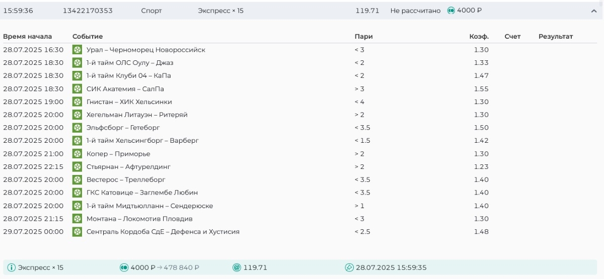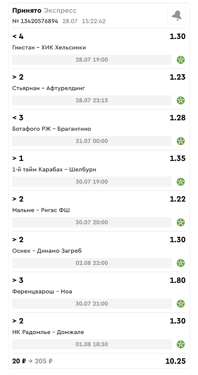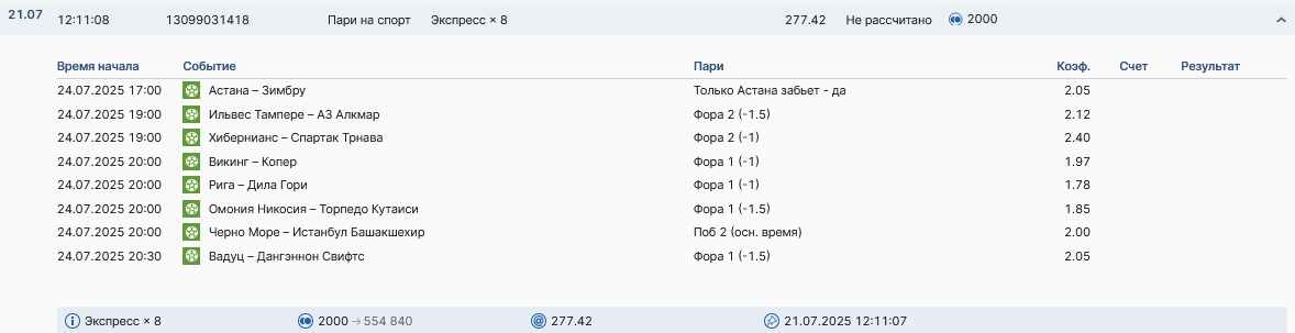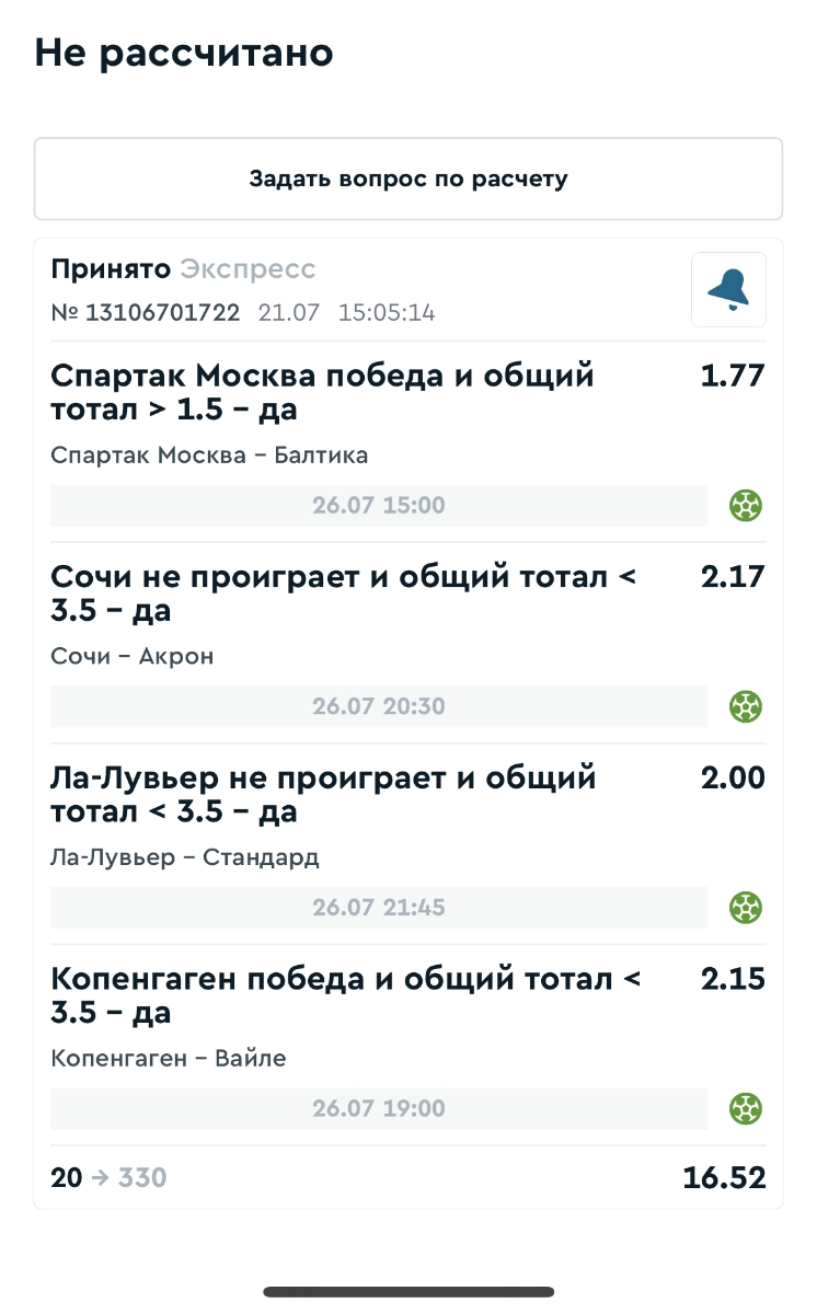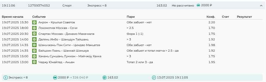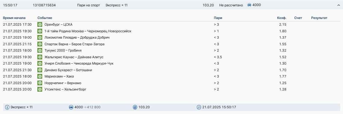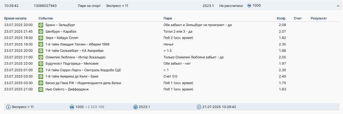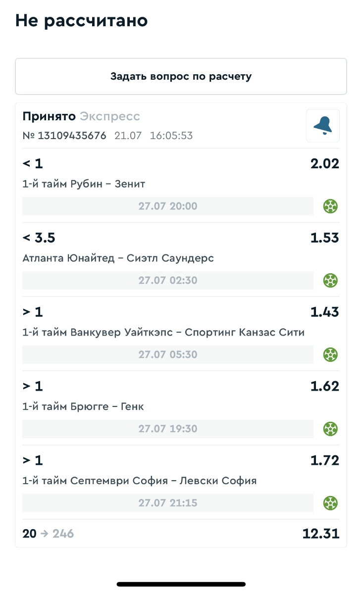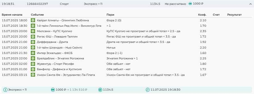 Koyaanisquatsi Hopi 98 Опубликовано 28 июля Автор Поделиться Опубликовано 28 июля На прошлой неделе все экспрессы проиграны, за неделю - 60 000, за год по экспрессам - 778 500 ₽, за июль - 245 000. Экспрессы с проставлением на неделю вперед себя не оправдывают, возвращаемся к системе ежедневных экспрессов. Экспрессы на 28.07.25 а так же недельные экспрессы до 03.08.25. Цитата Ссылка на комментарий https://brcbet.com/topic/429498-master-klass-po-razdevaniyu-bukmekera-tolko-fevral/page/23/#findComment-509428 Поделиться на другие сайты Поделиться