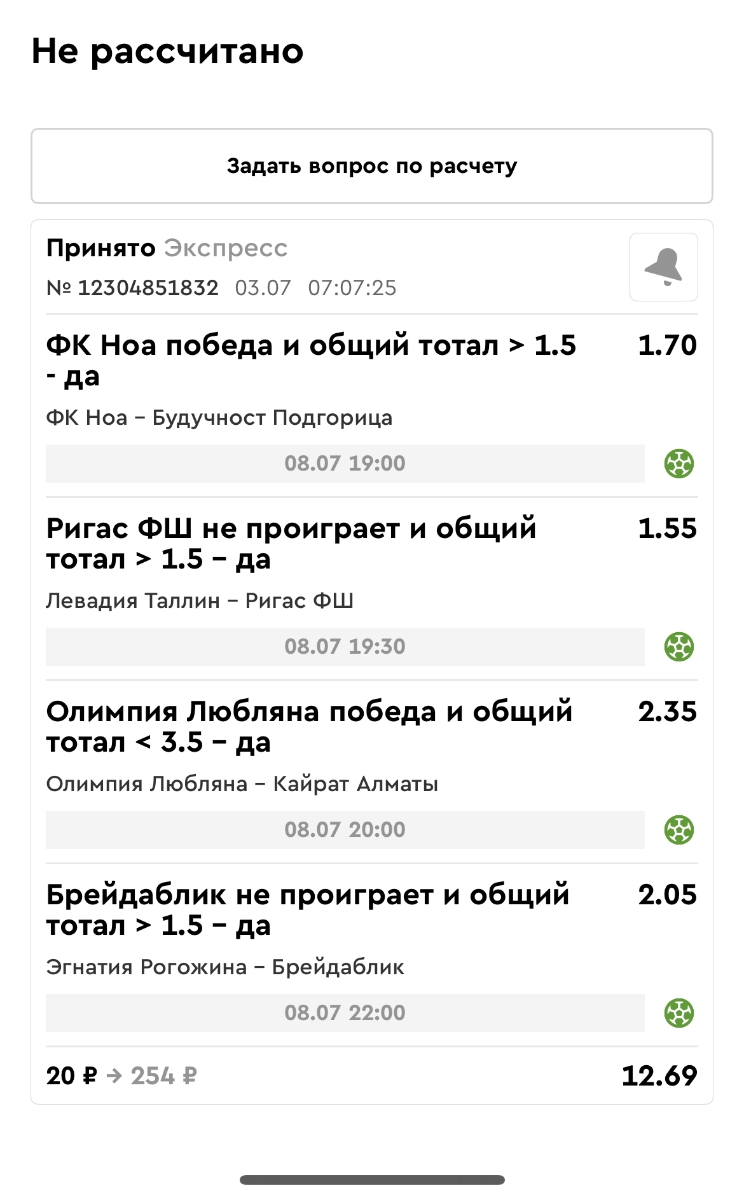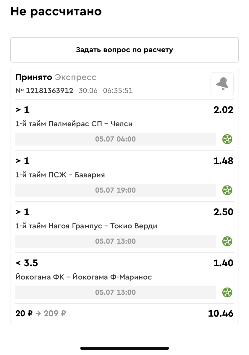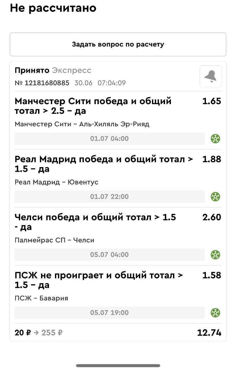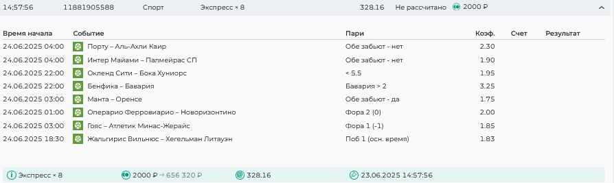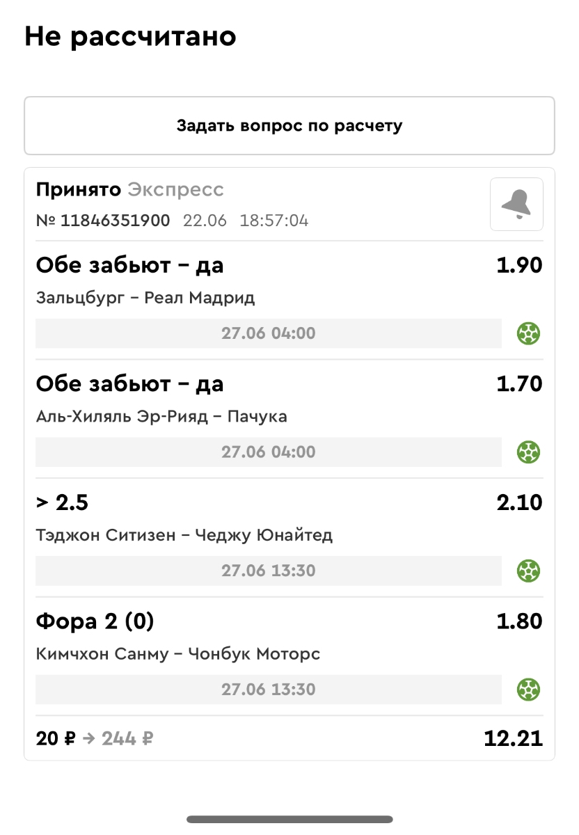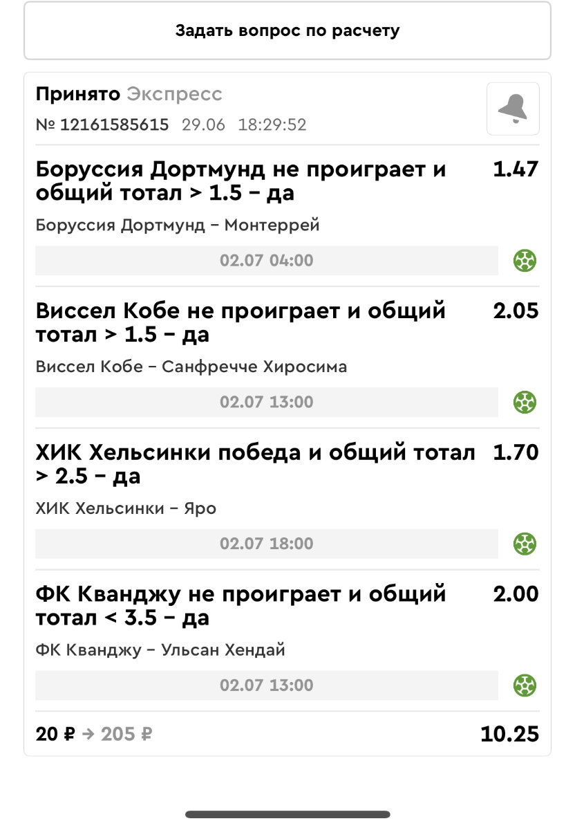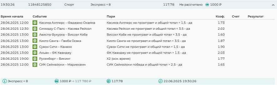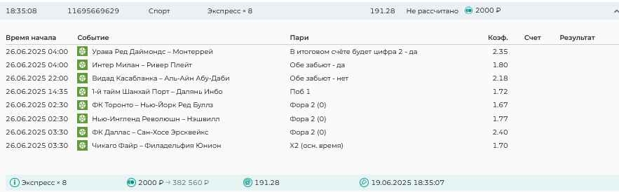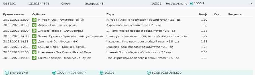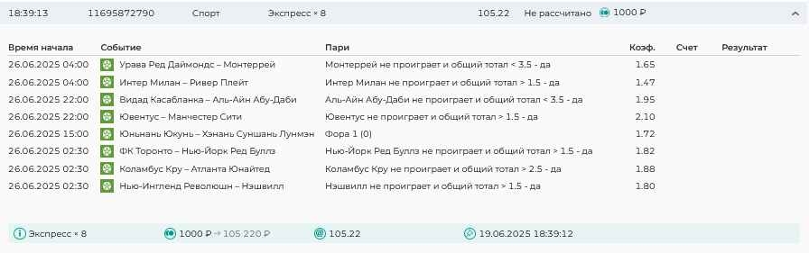 Koyaanisquatsi Hopi 98 Опубликовано 23 июня Автор Поделиться Опубликовано 23 июня Мини экспрессы ежедневные с 16.06.25 по 22.06.25 все проиграли кроме одного мини тотала и двух мини экспрессов8 выиграли с возвратами , их проставляем сегодня! Итого банк -134 ₽ за неделю; +5074₽ +1,48%! Мини экспрессы на эту неделю с 23.06.25 по 29.05.25 Цитата Ссылка на комментарий https://brcbet.com/topic/429498-master-klass-po-razdevaniyu-bukmekera-tolko-fevral/page/23/#findComment-508429 Поделиться на другие сайты Поделиться