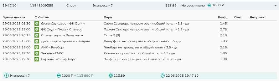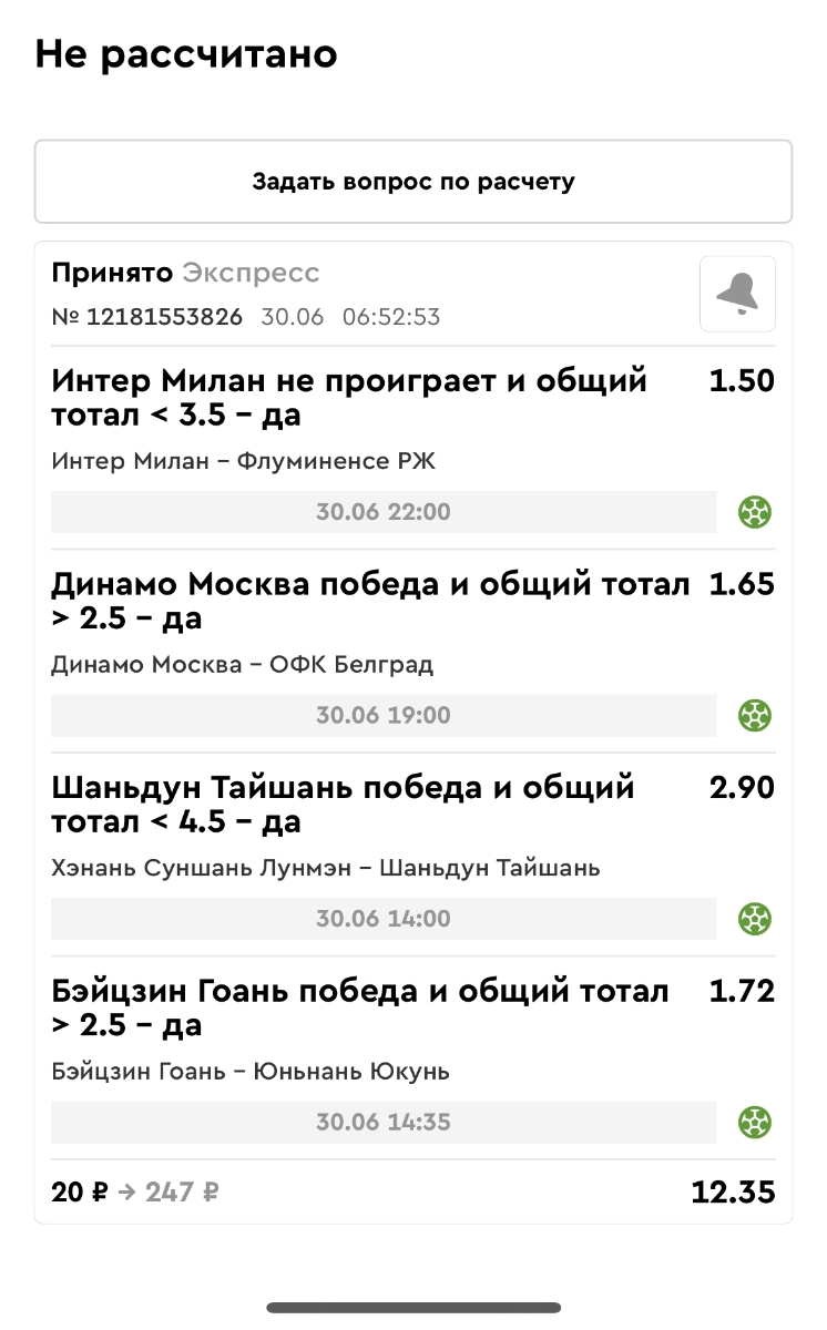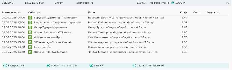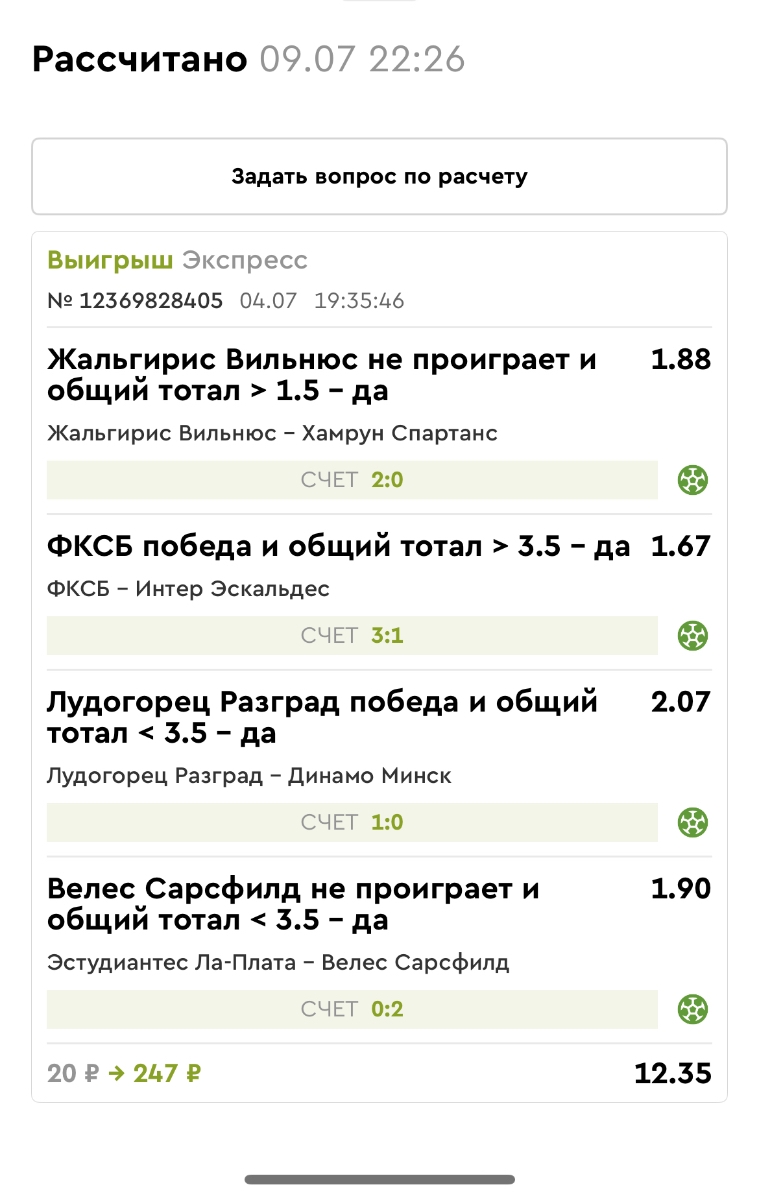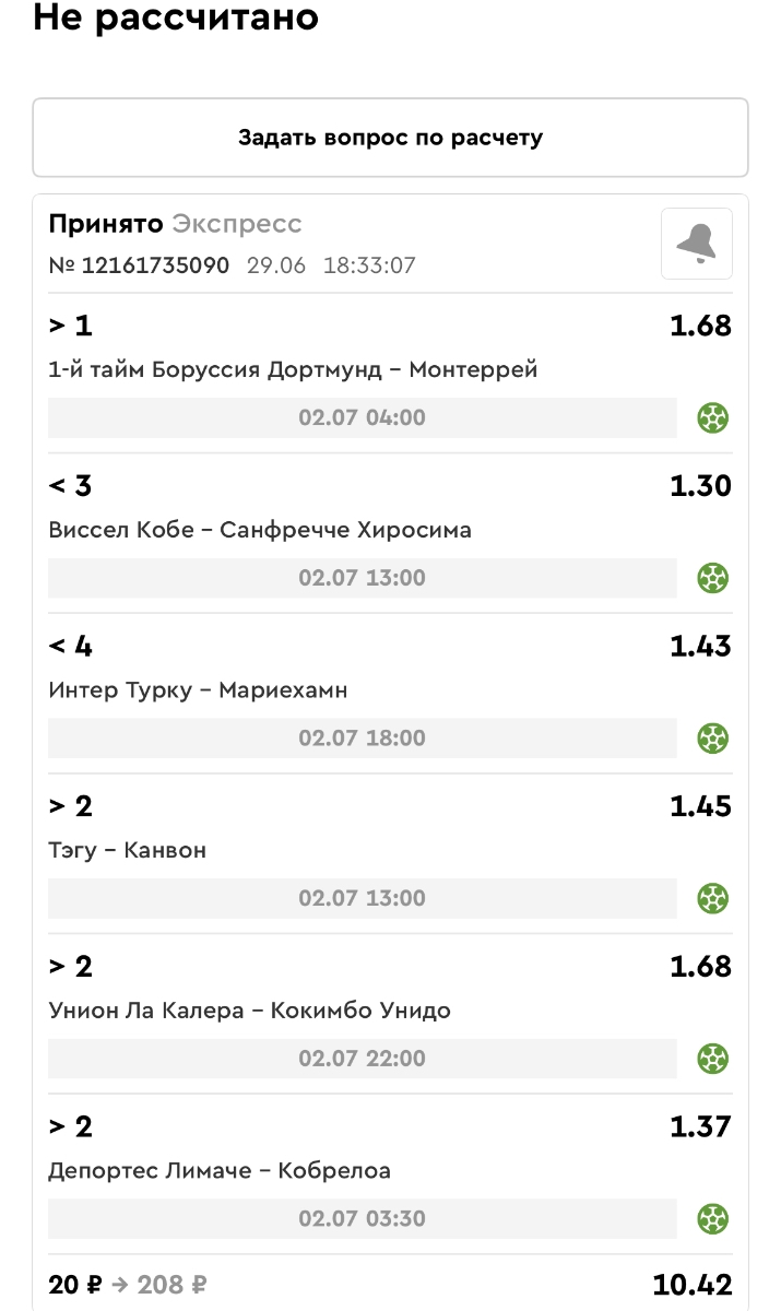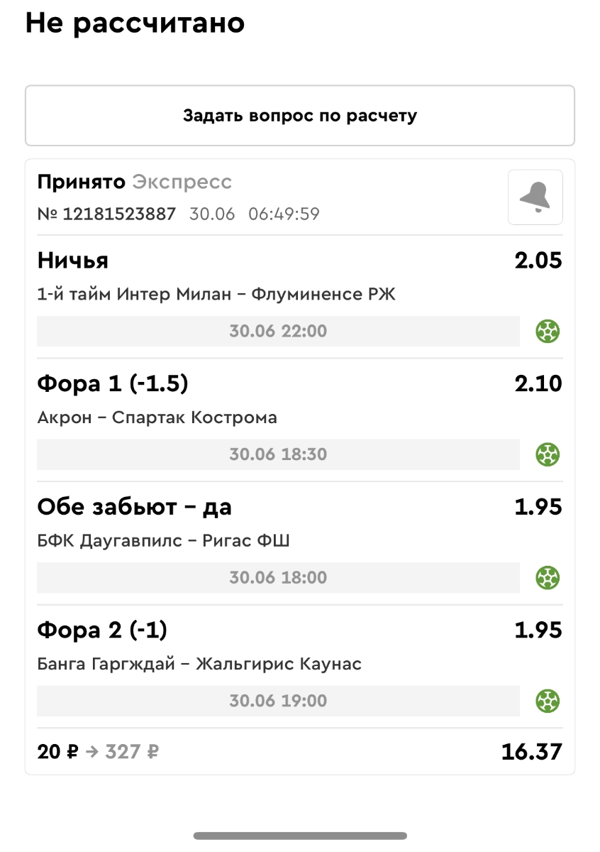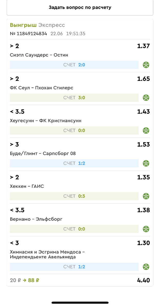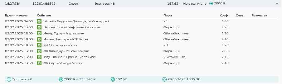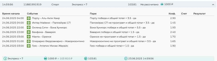 Koyaanisquatsi Hopi 98 Опубликовано 23 июня Автор Поделиться Опубликовано 23 июня Мини экспрессы ежедневные с 16.06.25 по 22.06.25 все проиграли кроме одного мини тотала и двух мини экспрессов8 выиграли с возвратами , их проставляем сегодня! Итого банк -134 ₽ за неделю; +5074₽ +1,48%! Мини экспрессы на эту неделю с 23.06.25 по 29.05.25 Цитата Ссылка на комментарий https://brcbet.com/topic/429498-master-klass-po-razdevaniyu-bukmekera-tolko-fevral/page/23/#findComment-508429 Поделиться на другие сайты Поделиться