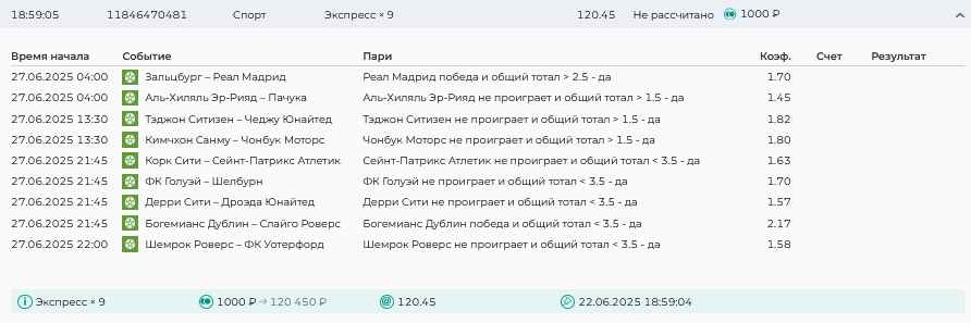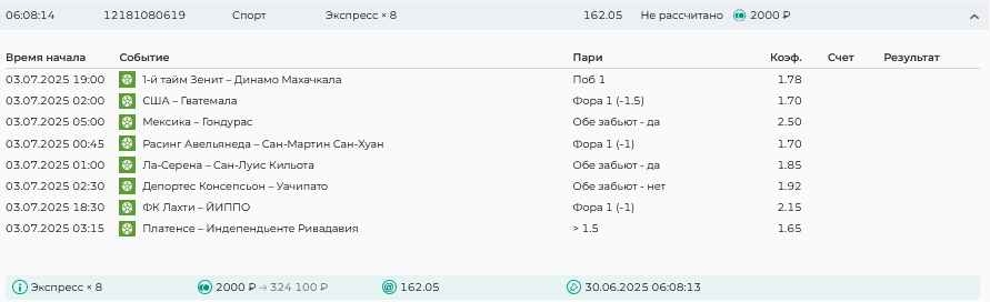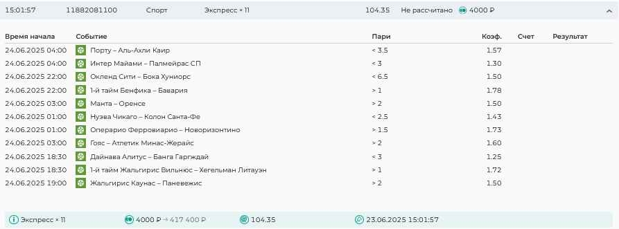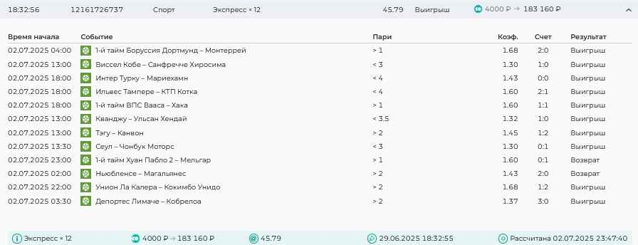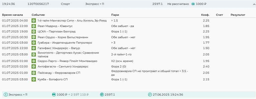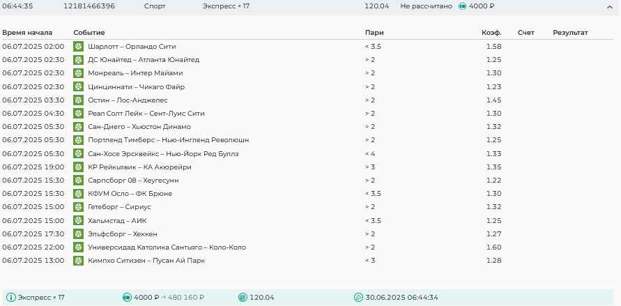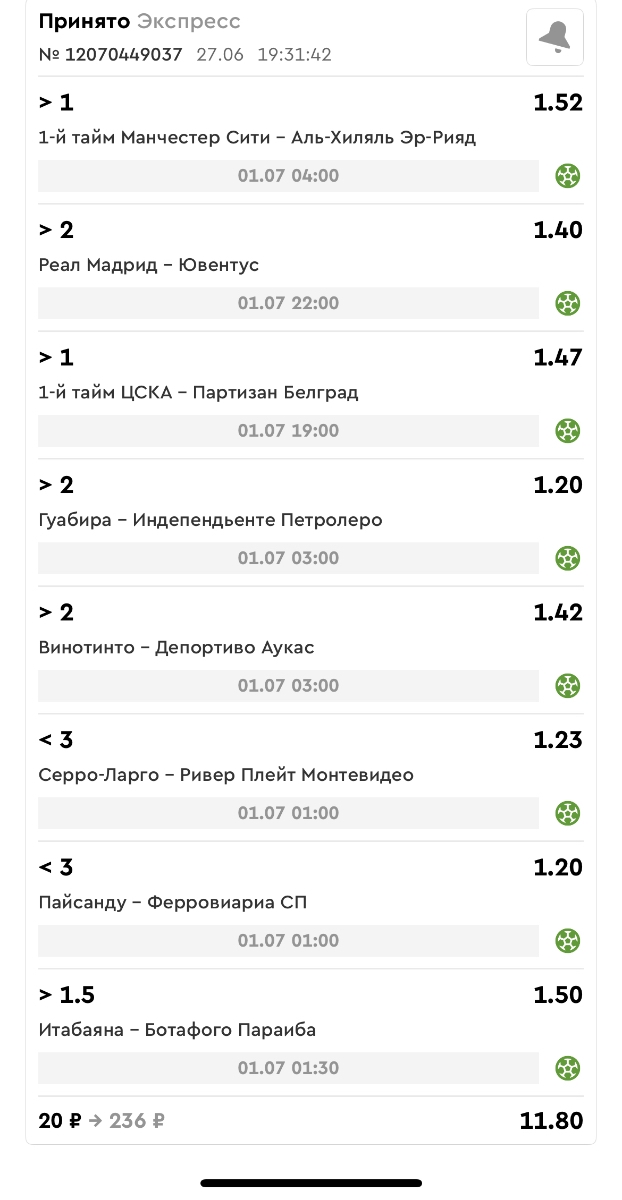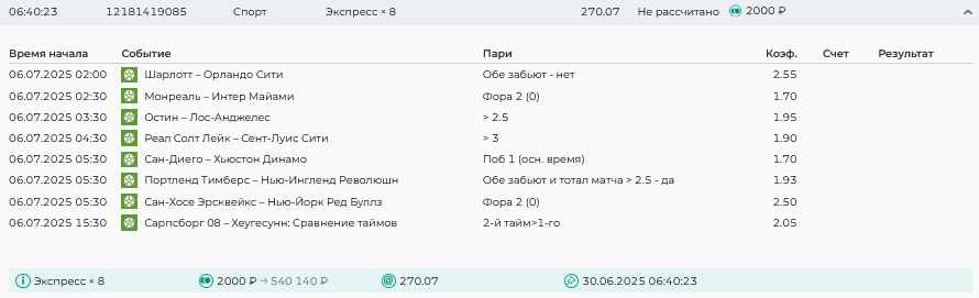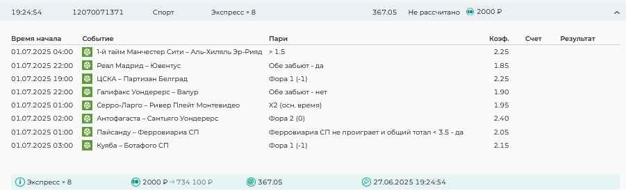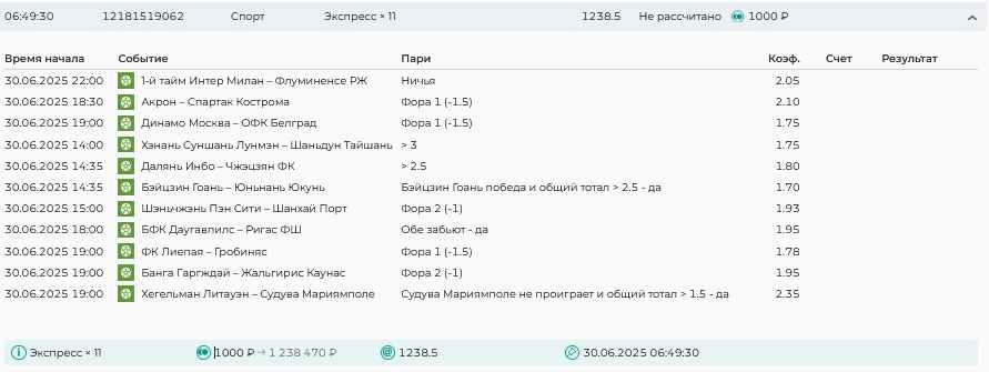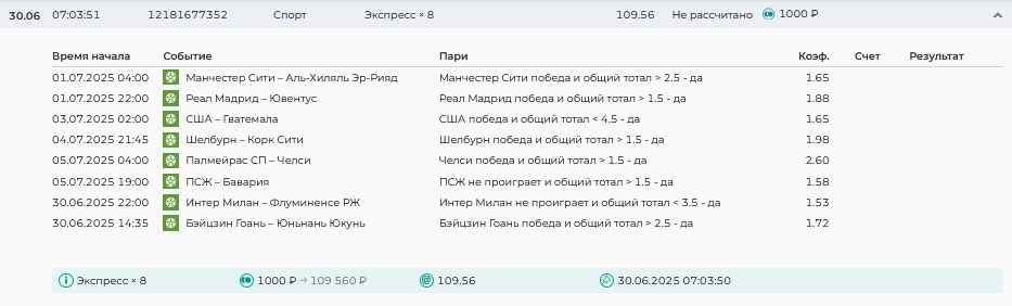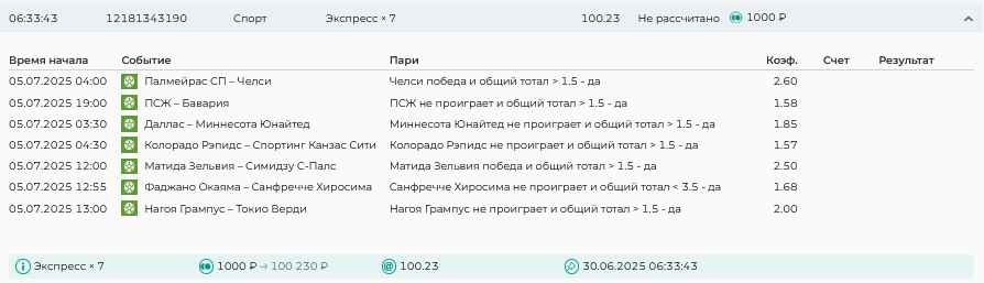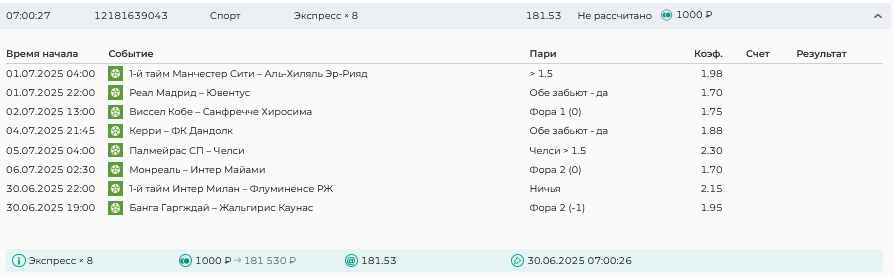 Koyaanisquatsi Hopi 98 Опубликовано 30 июня Автор Поделиться Опубликовано 30 июня На прошлой неделе все экспрессы проиграны за неделю - 60 000, за год по экспрессам - 544 500 ₽, за июнь - 240 000. Ежедневные экспрессы на неделю с 30.06.25 по 06.07.25! Цитата Ссылка на комментарий https://brcbet.com/topic/429498-master-klass-po-razdevaniyu-bukmekera-tolko-fevral/page/23/#findComment-508624 Поделиться на другие сайты Поделиться