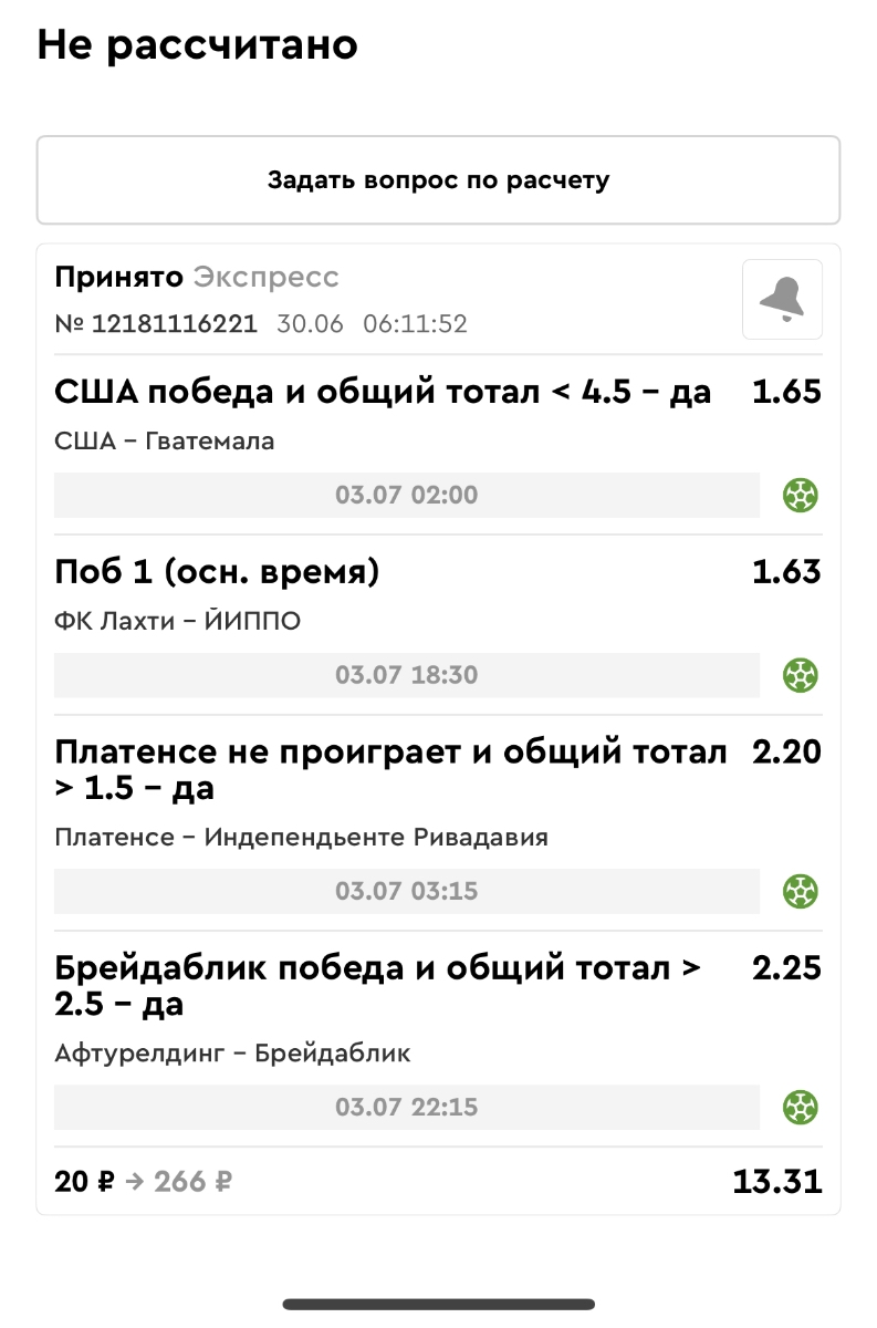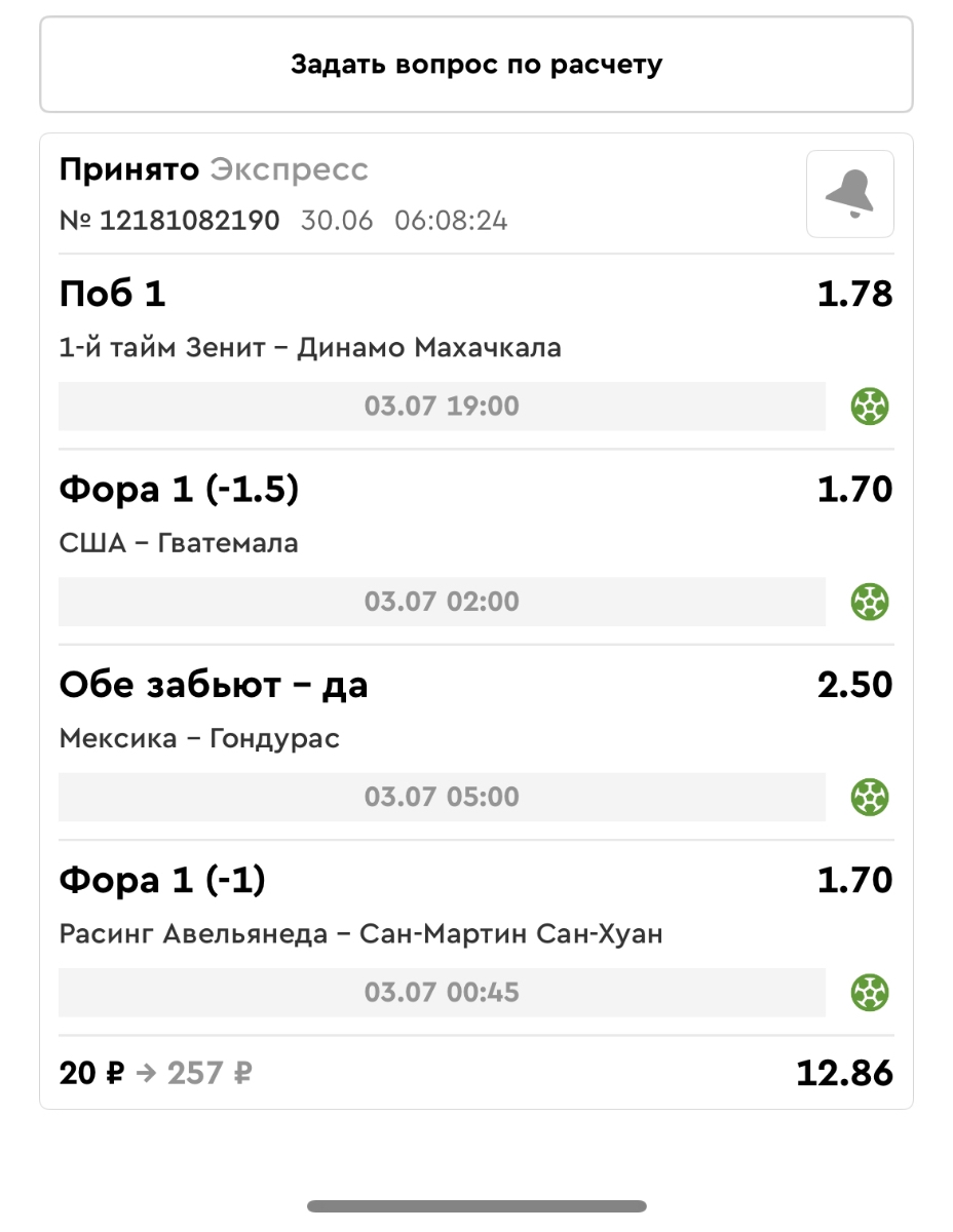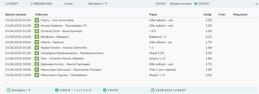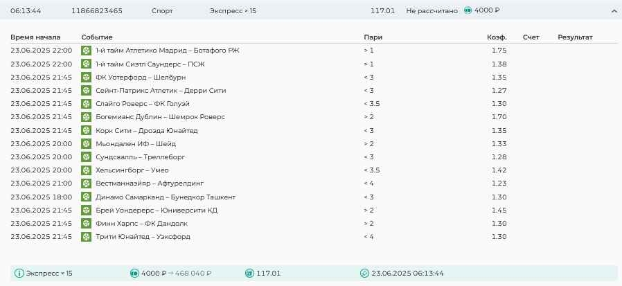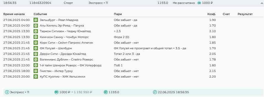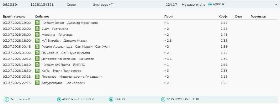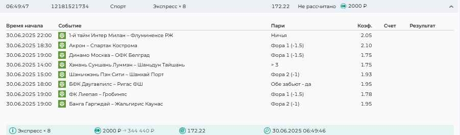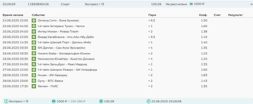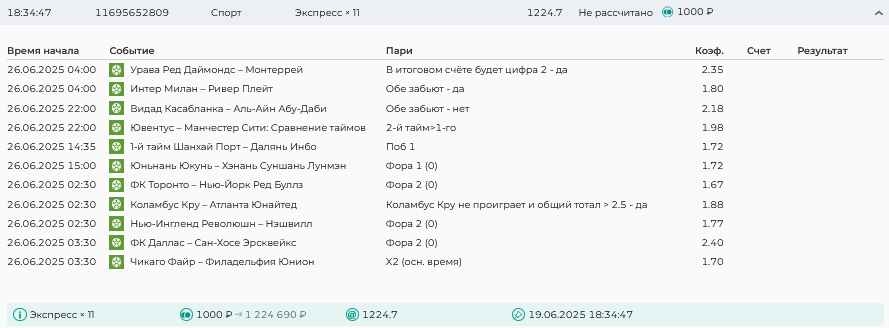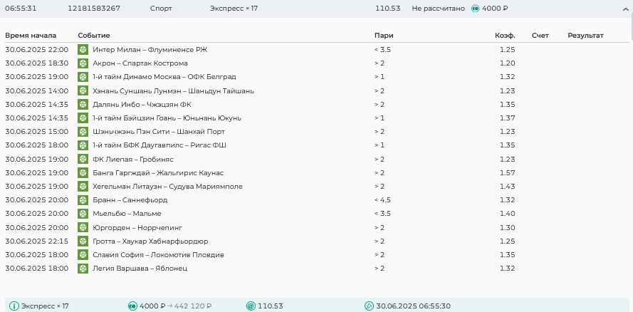 Koyaanisquatsi Hopi 98 Опубликовано 30 июня Автор Поделиться Опубликовано 30 июня На прошлой неделе все экспрессы проиграны за неделю - 60 000, за год по экспрессам - 544 500 ₽, за июнь - 240 000. Ежедневные экспрессы на неделю с 30.06.25 по 06.07.25! Цитата Ссылка на комментарий https://brcbet.com/topic/429498-master-klass-po-razdevaniyu-bukmekera-tolko-fevral/page/23/#findComment-508624 Поделиться на другие сайты Поделиться