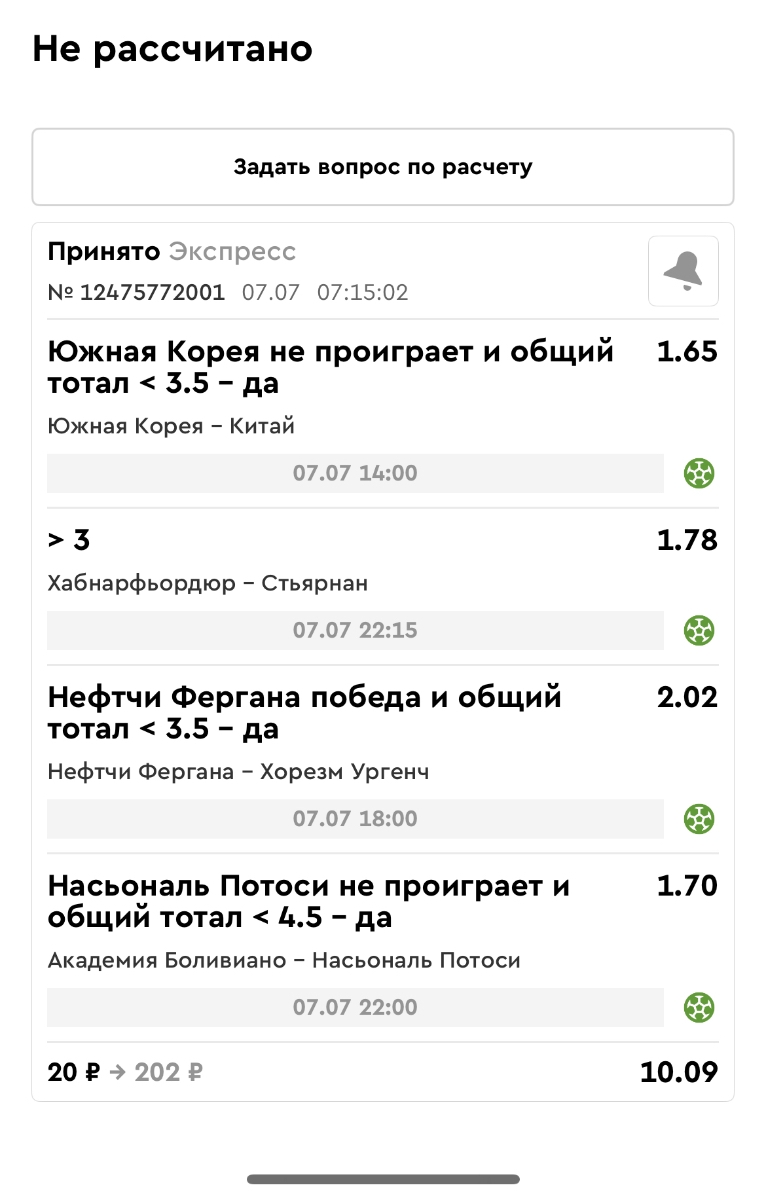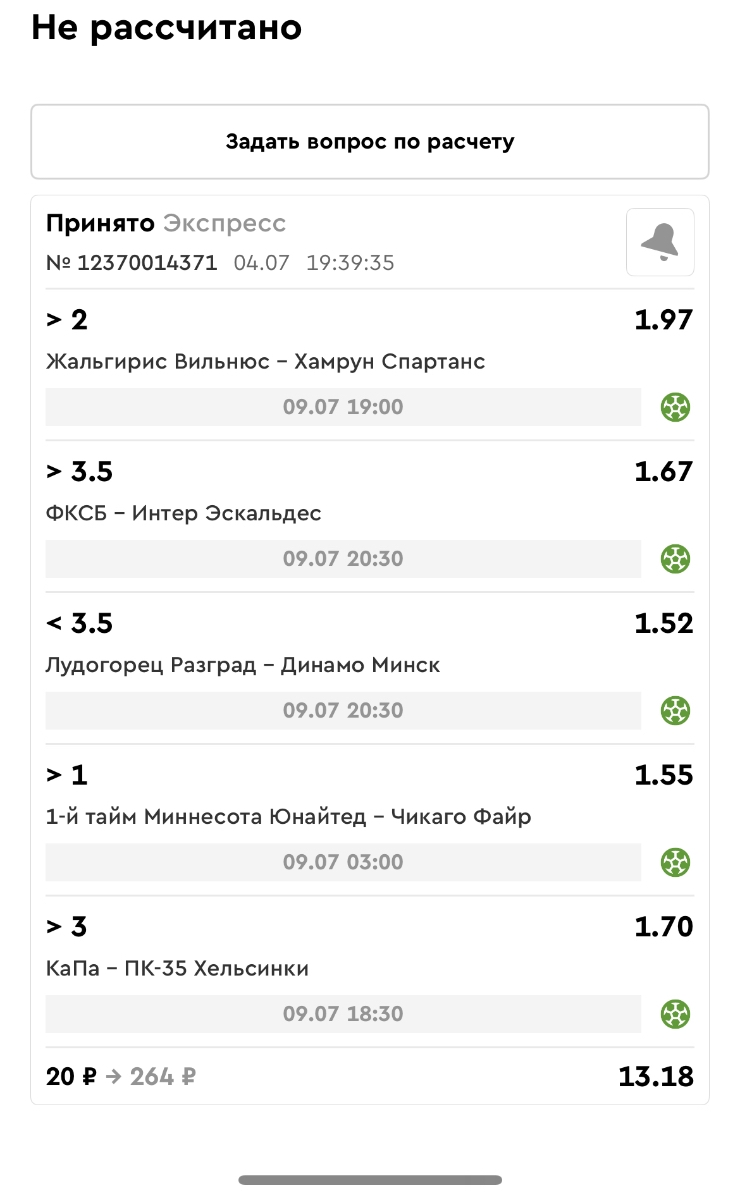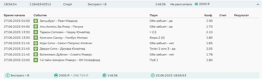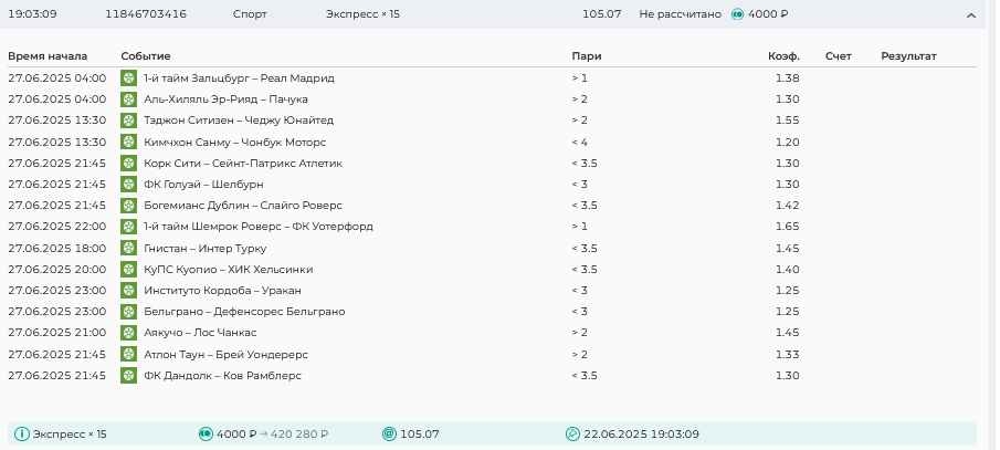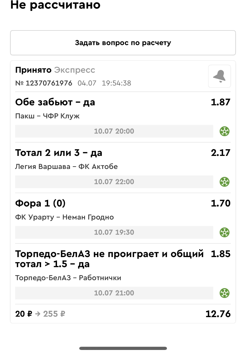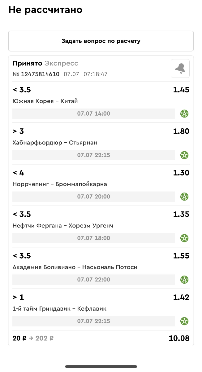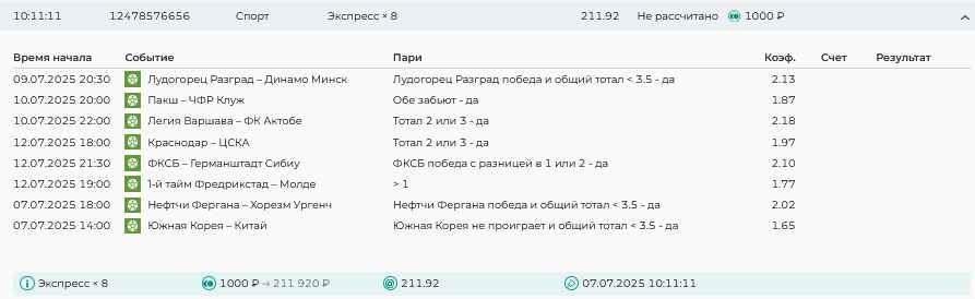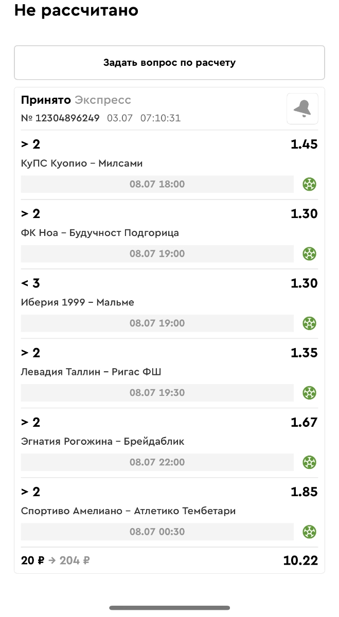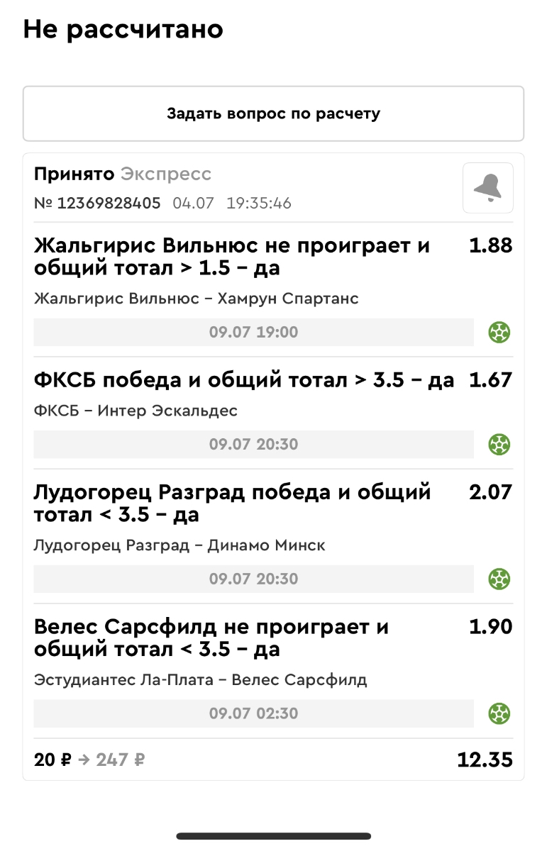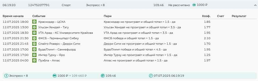 Koyaanisquatsi Hopi 98 Опубликовано 30 июня Автор Поделиться Опубликовано 30 июня Мини экспрессы недели на эту неделю ! С 22.06.25 по 29.06.25 все проиграли,кроме тотала, по нему выигрыш с возвратами, разгоняем его дальше.Итого Банк - 40₽, -12,8% от банка, 4360 ₽.Мини экспрессы недели на эту неделю ! С 30.06.25 по 06.07.25 Цитата Ссылка на комментарий https://brcbet.com/topic/429498-master-klass-po-razdevaniyu-bukmekera-tolko-fevral/page/23/#findComment-508620 Поделиться на другие сайты Поделиться