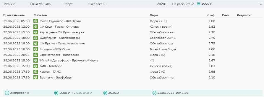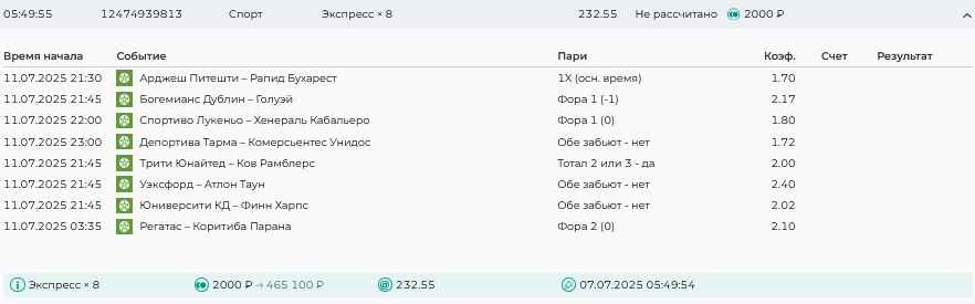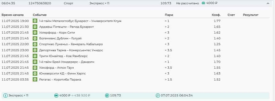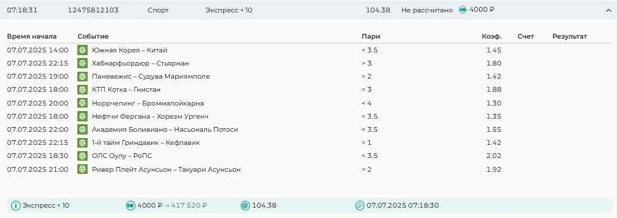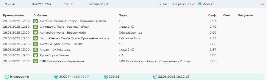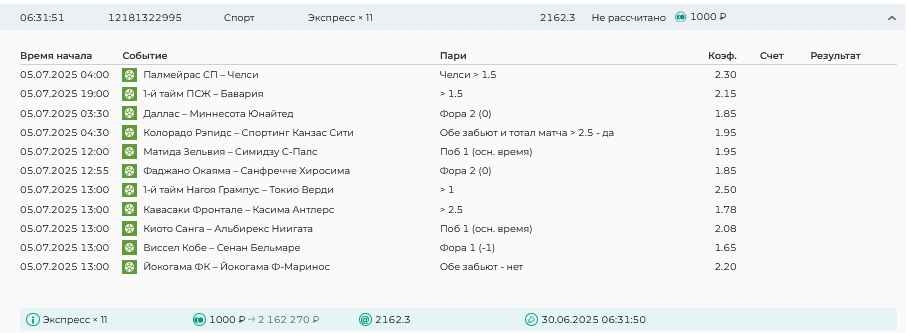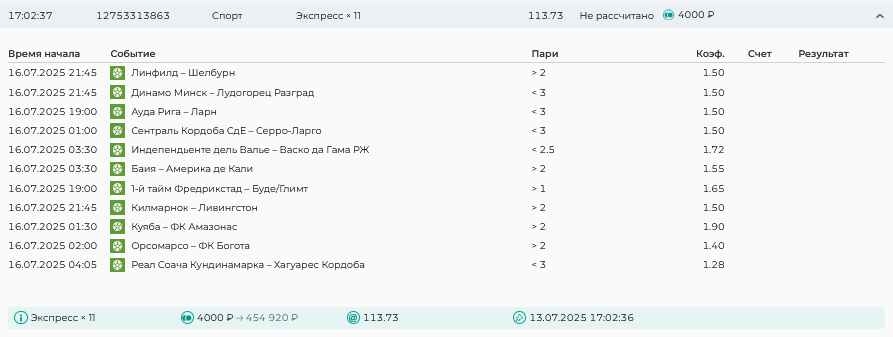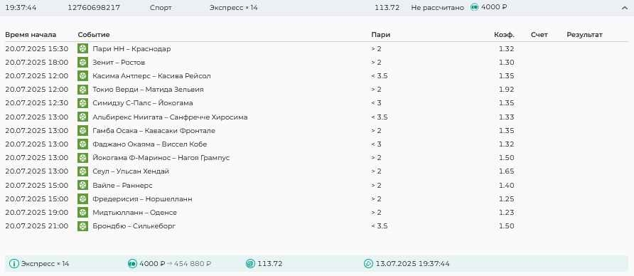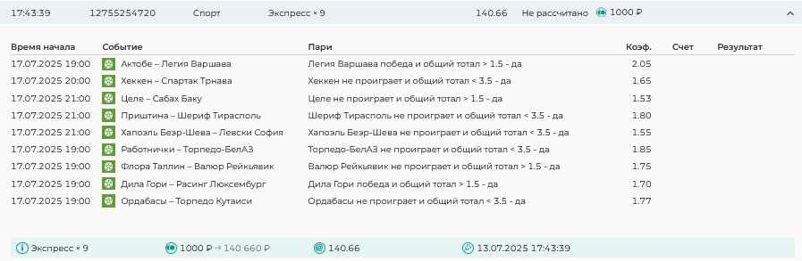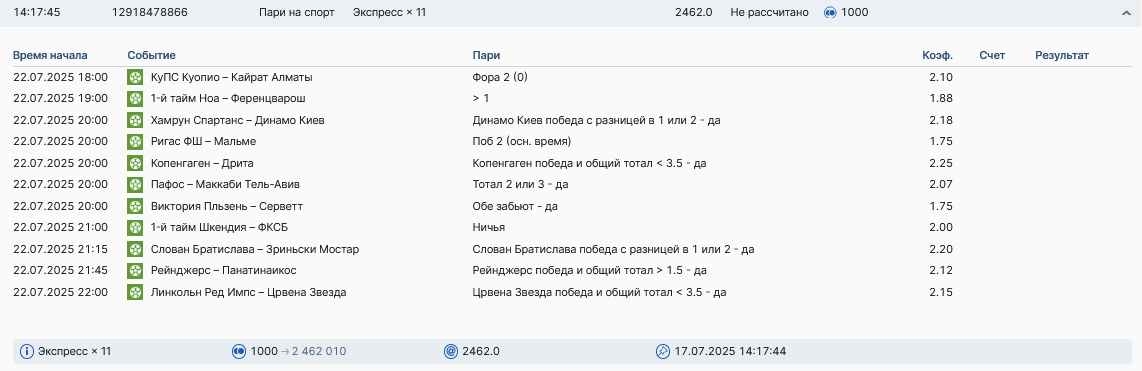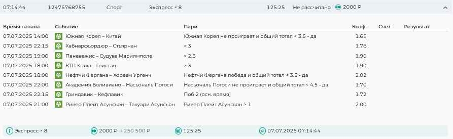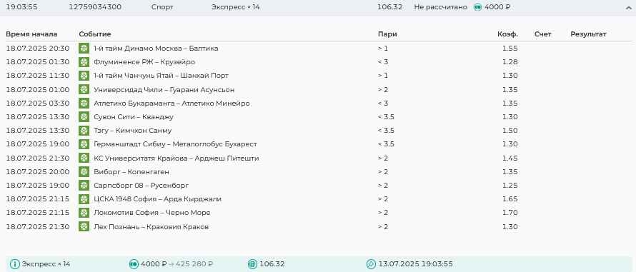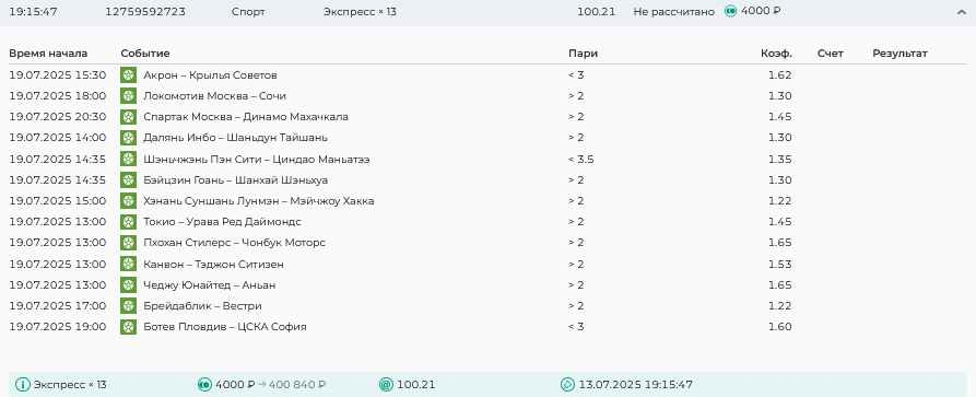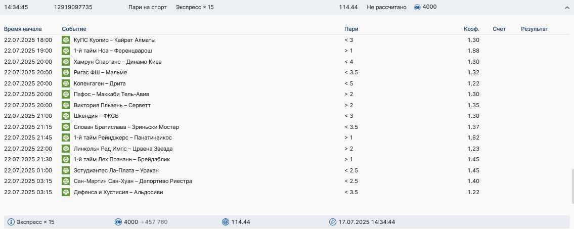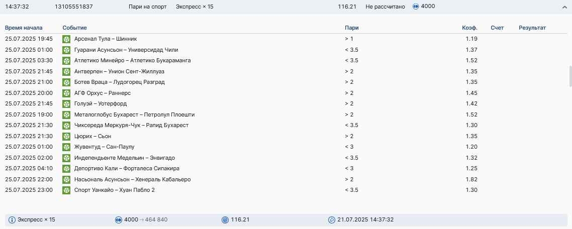 Koyaanisquatsi Hopi 98 Опубликовано 14 июля Автор Поделиться Опубликовано 14 июля На прошлой неделе все экспрессы проиграны, за неделю - 61 000, за год по экспрессам - 658 500 ₽, за июль - 125 000. Ежедневные экспрессы на неделю с 14.07.25 по 20.07.25! Цитата Ссылка на комментарий https://brcbet.com/topic/429498-master-klass-po-razdevaniyu-bukmekera-tolko-fevral/page/23/#findComment-508976 Поделиться на другие сайты Поделиться