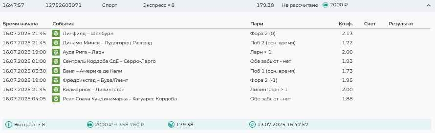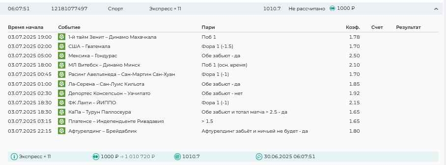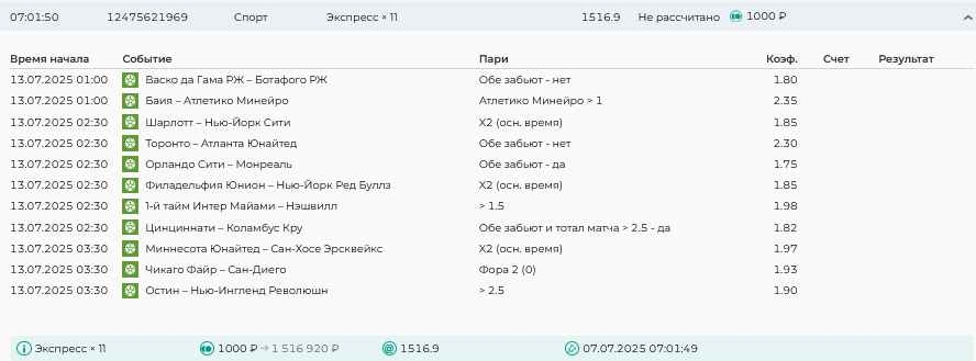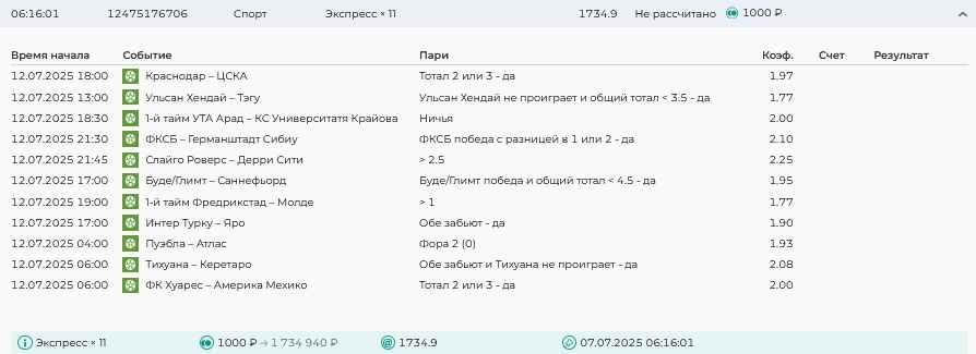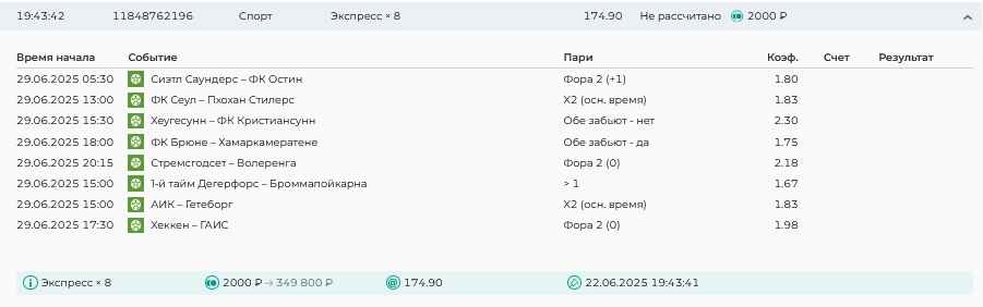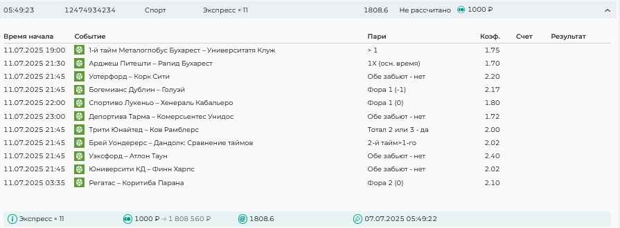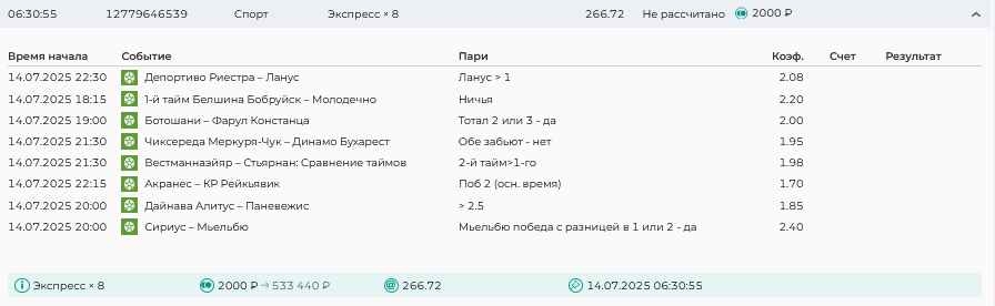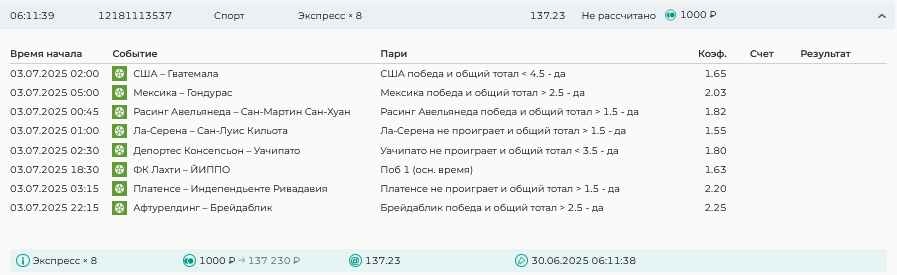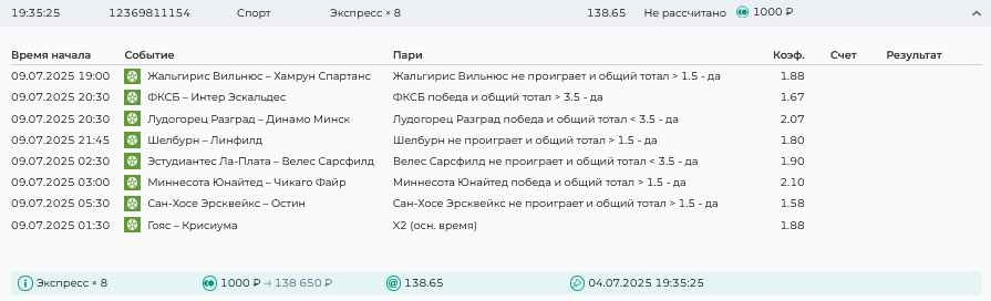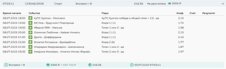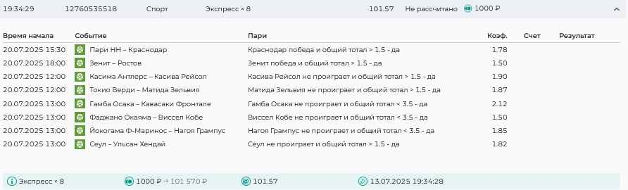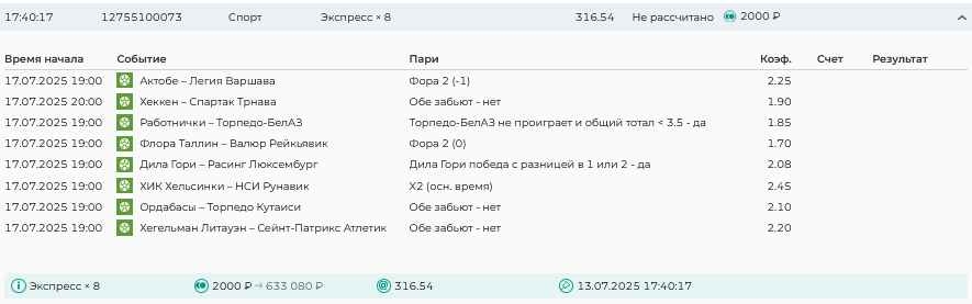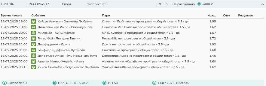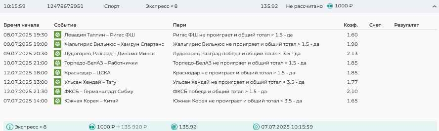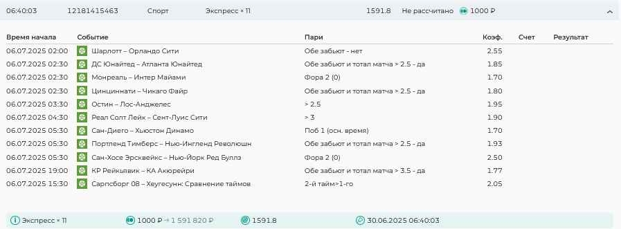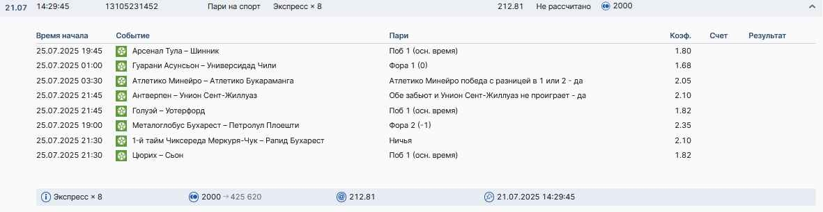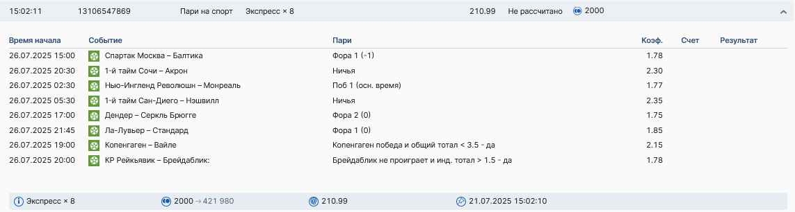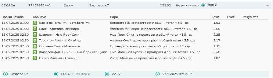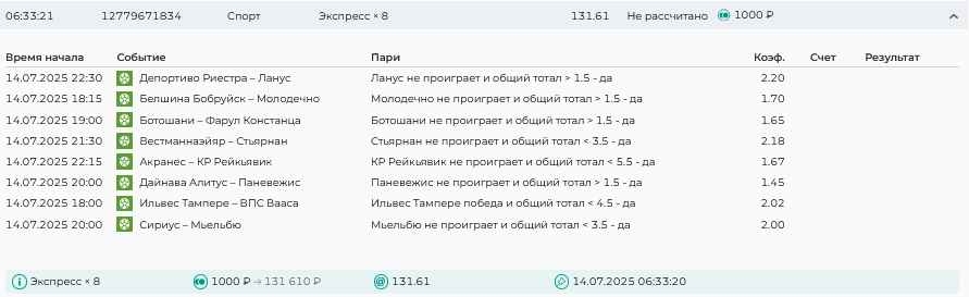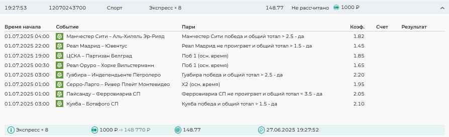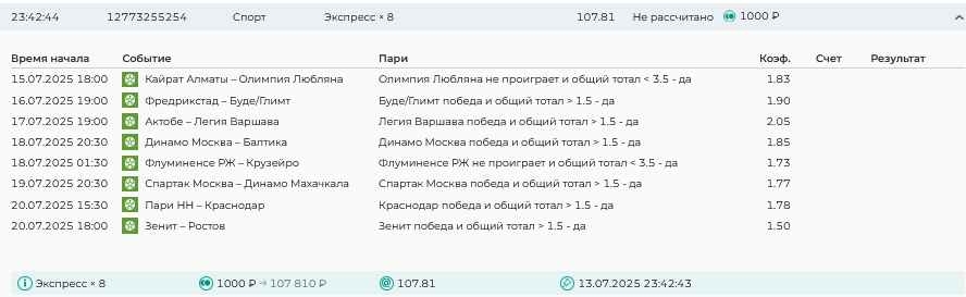 Koyaanisquatsi Hopi 98 Опубликовано 7 июля Автор Поделиться Опубликовано 7 июля На прошлой неделе все экспрессы проиграны, кроме одного экспресса 8, по нему был возврат и экспресс тотал зашел с возвратами, его разгоняем дальше до кф 100+. за неделю - 54 000, за год по экспрессам - 598 500 ₽, за июль - 54 000. Ежедневные экспрессы на неделю с 07.07.25 по 13.07.25! Цитата Ссылка на комментарий https://brcbet.com/topic/429498-master-klass-po-razdevaniyu-bukmekera-tolko-fevral/page/23/#findComment-508740 Поделиться на другие сайты Поделиться