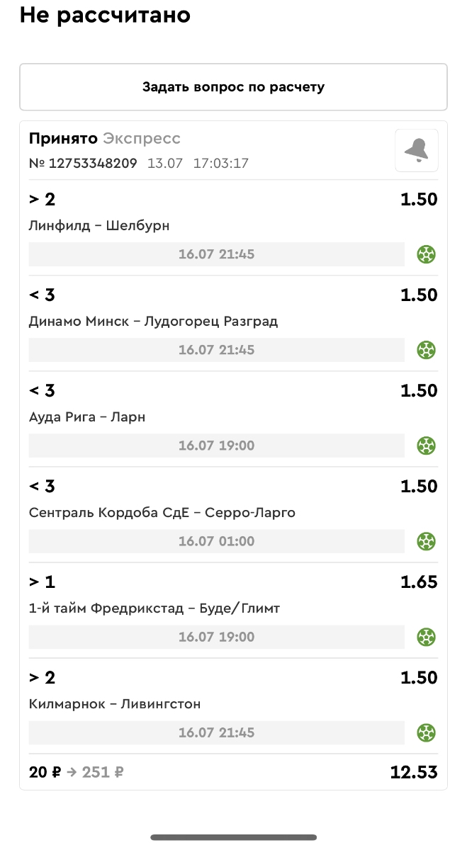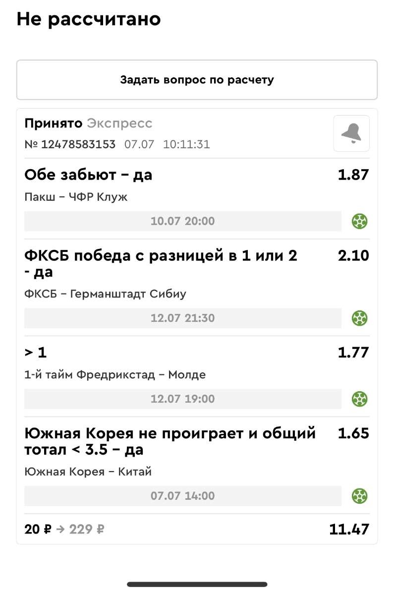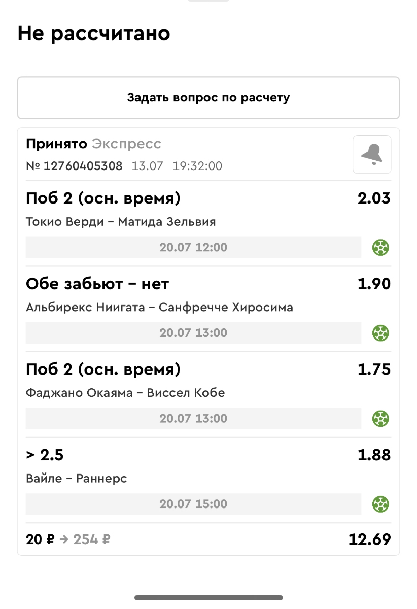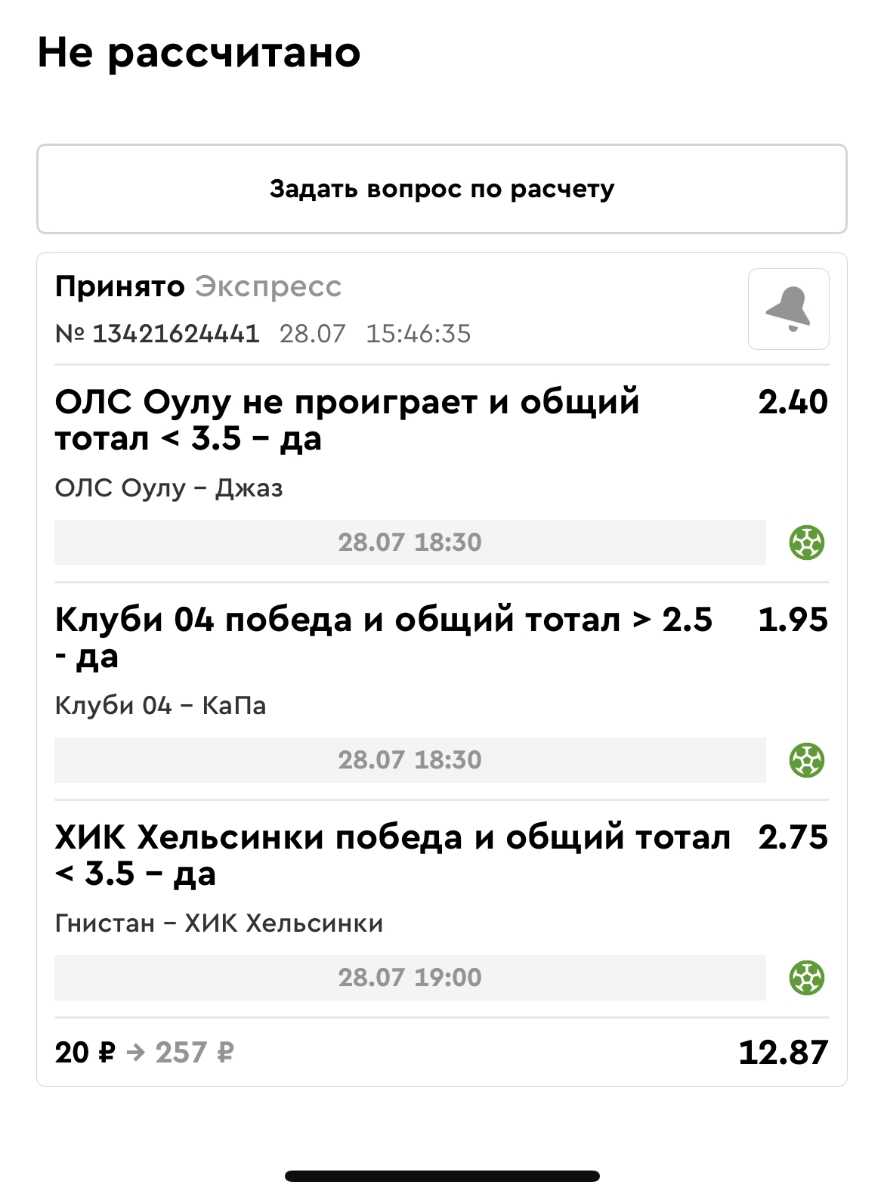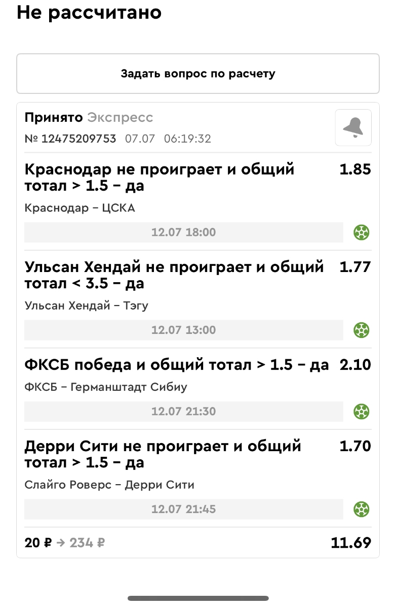 Koyaanisquatsi Hopi 98 Опубликовано 14 июля Автор Поделиться Опубликовано 14 июля Мини экспрессы ежедневные с 07.07.25 по 13.07.25 все проиграли кроме одного Тотал+исход, он зашел полностью. Итого банк -253 ₽ за неделю; Банк 4437₽ -11,26%! Мини экспрессы на эту неделю с 04.07.25 по 20.07.25 Цитата Ссылка на комментарий https://brcbet.com/topic/429498-master-klass-po-razdevaniyu-bukmekera-tolko-fevral/page/23/#findComment-508974 Поделиться на другие сайты Поделиться
