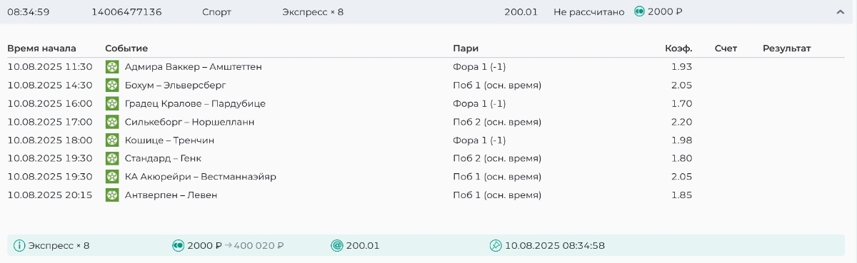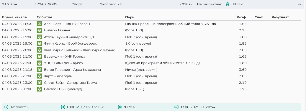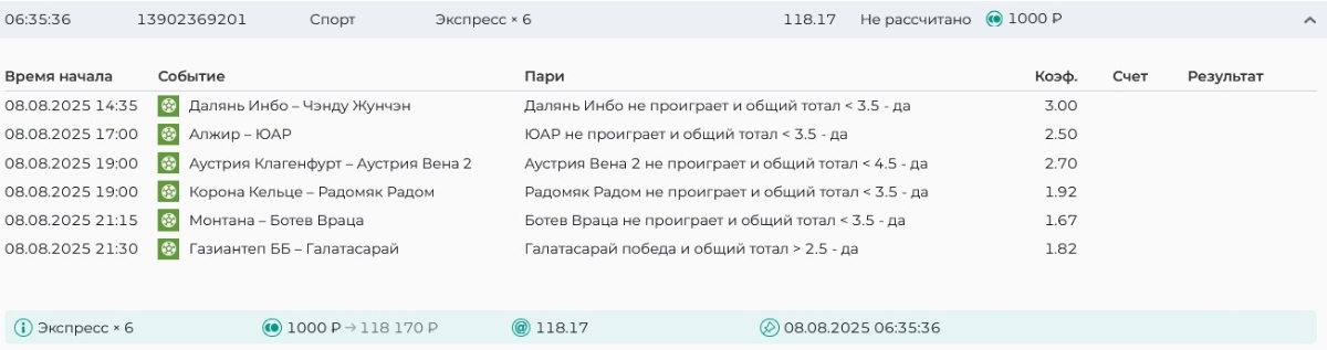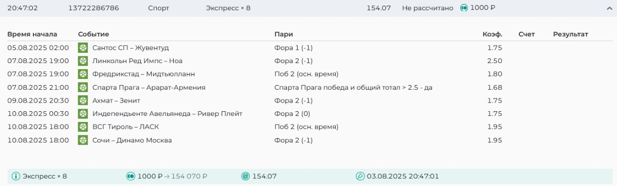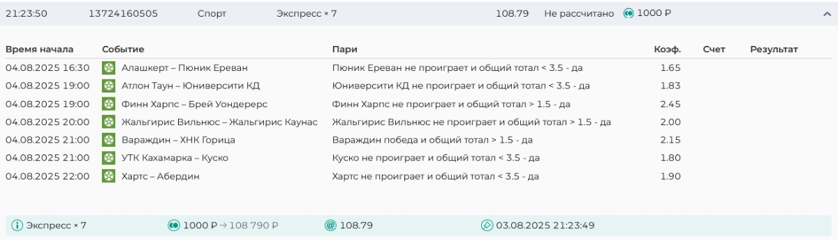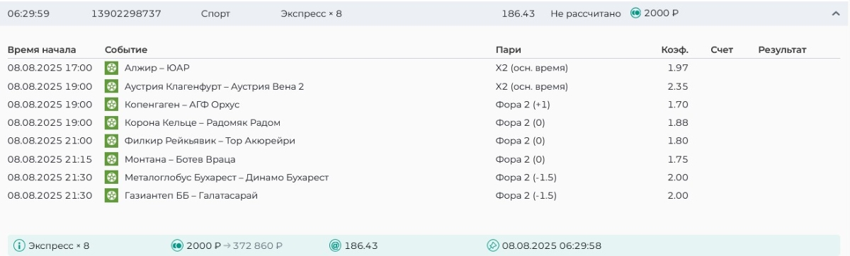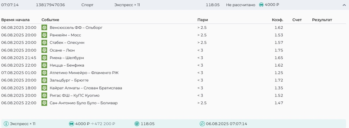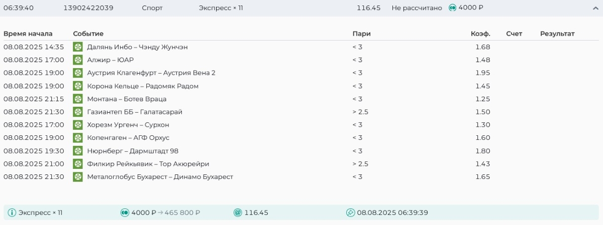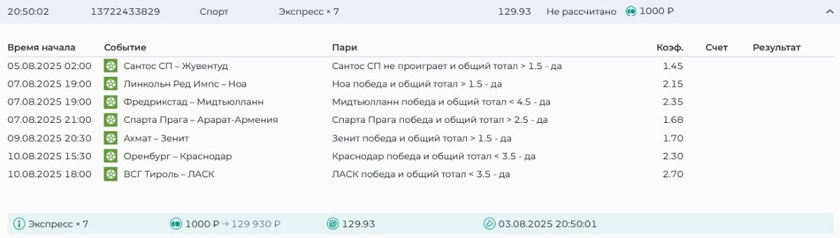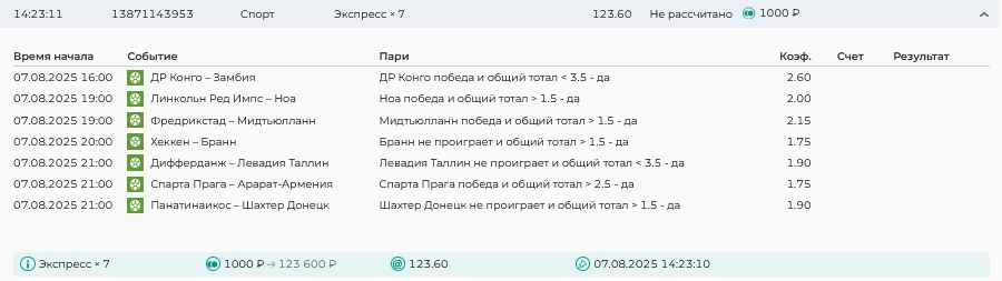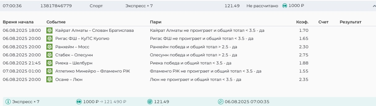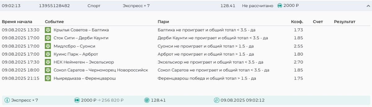 Ежедневные экспрессы за 07.08.25 все проиграли! Итого за день - 8 000р.  Итого за год по экспрессам - 867 500 ₽, за август - 58 000 р. Экспрессы на 08.08.25. Очень неплохо на самом деле идут дела,  если не смотреть на конечный результат пока что) последнюю неделю заходы значительно возросли и постоянно не хватает одного - двух события,  думаю в ближайшее время все придет.