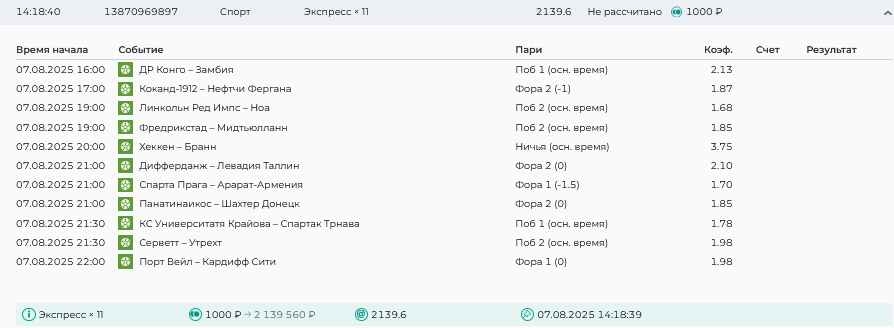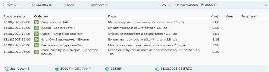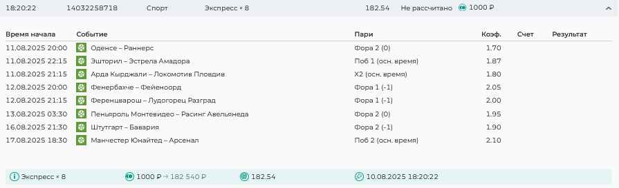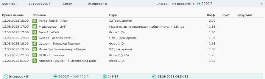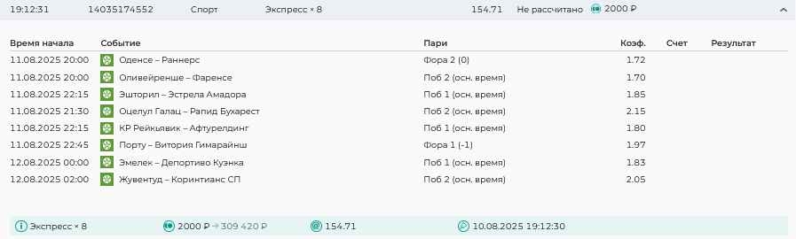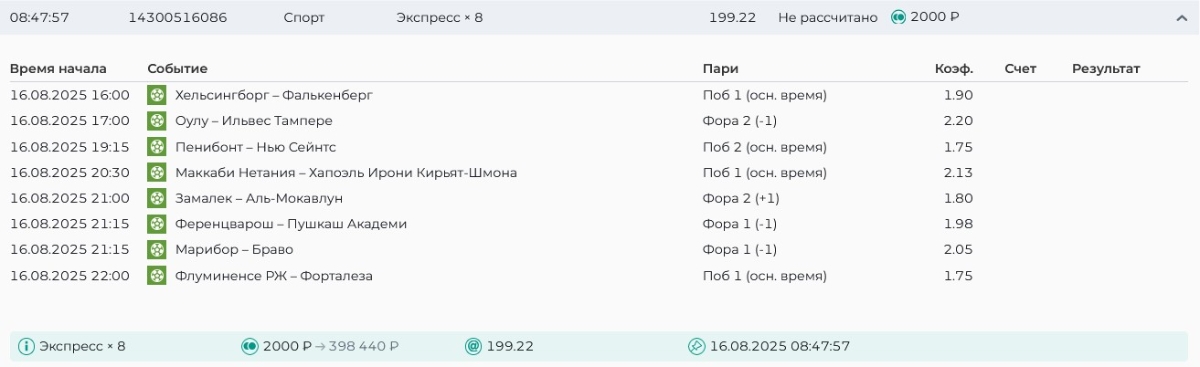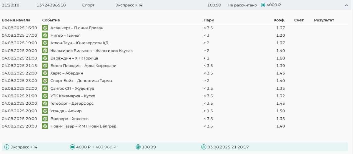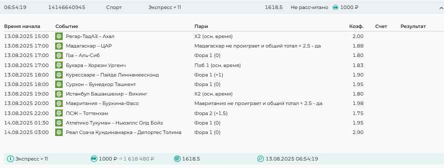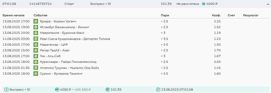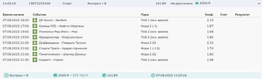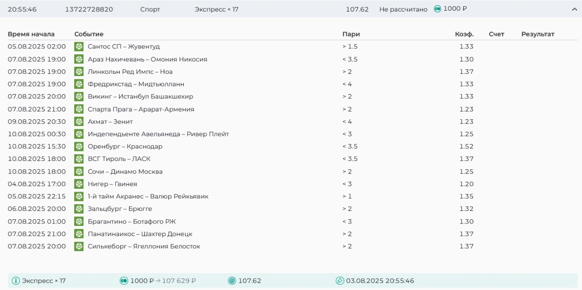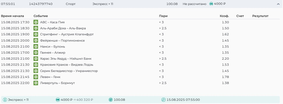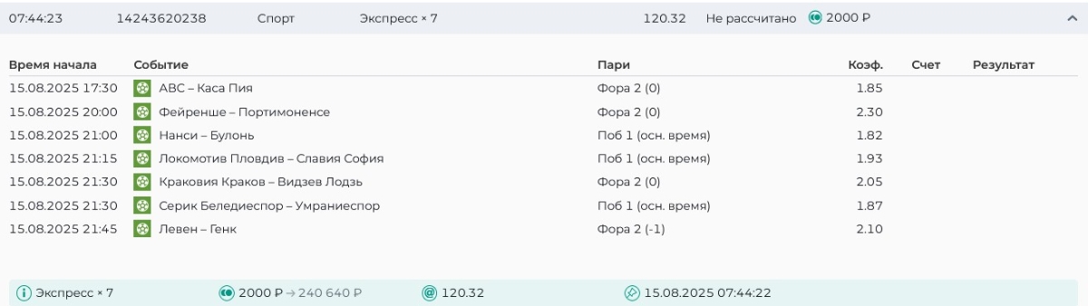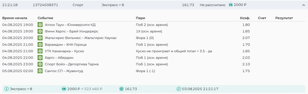 Ежедневные экспрессы за 07.08.25 все проиграли! Итого за день - 8 000р.  Итого за год по экспрессам - 867 500 ₽, за август - 58 000 р. Экспрессы на 08.08.25. Очень неплохо на самом деле идут дела,  если не смотреть на конечный результат пока что) последнюю неделю заходы значительно возросли и постоянно не хватает одного - двух события,  думаю в ближайшее время все придет.