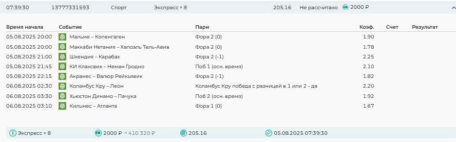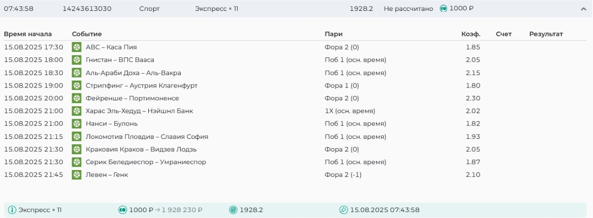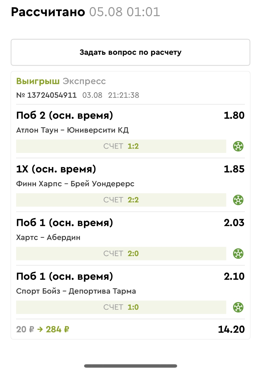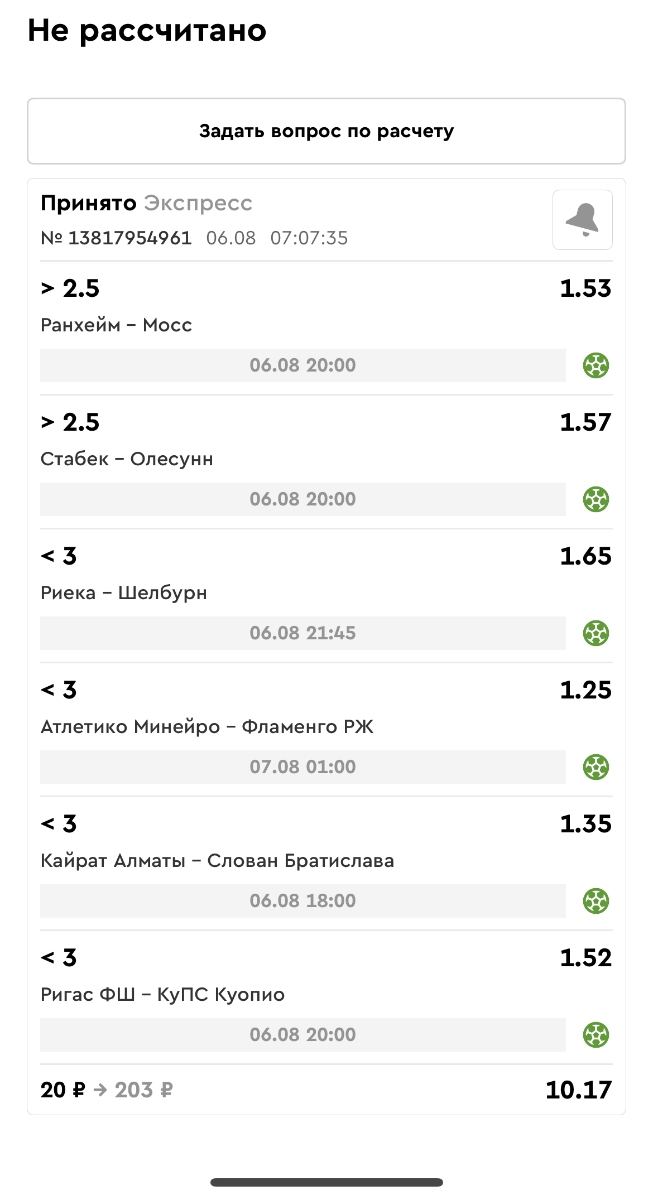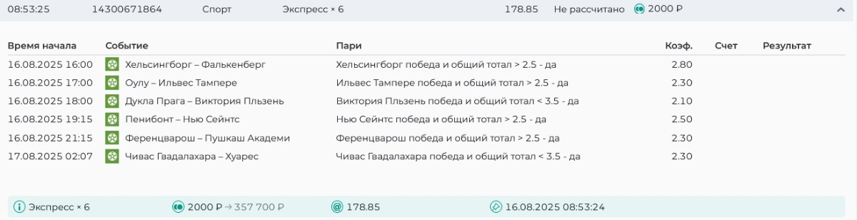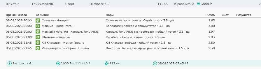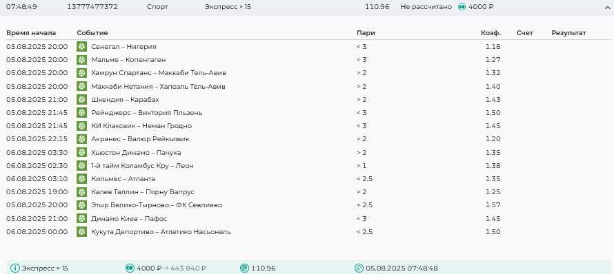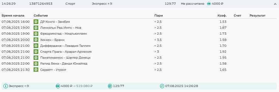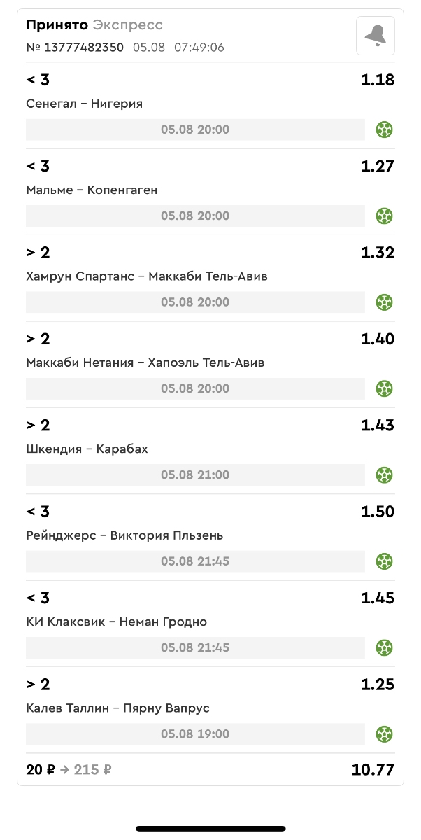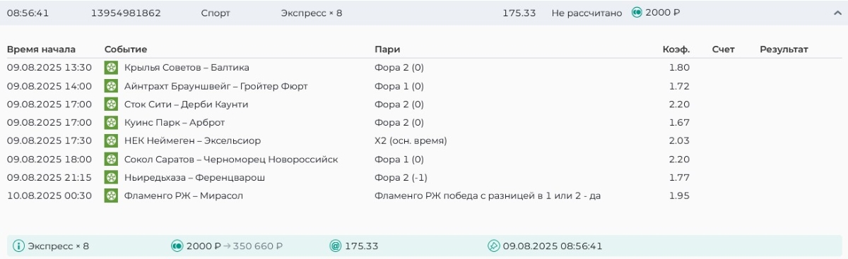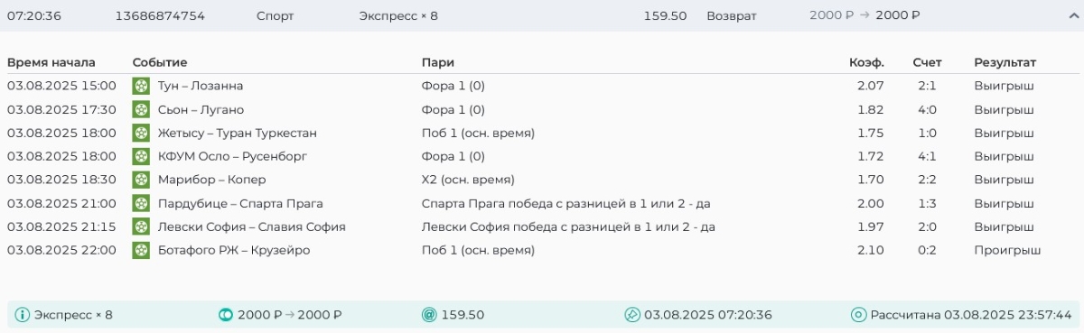 Ежедневные экспрессы за 07.08.25 все проиграли! Итого за день - 8 000р.  Итого за год по экспрессам - 867 500 ₽, за август - 58 000 р. Экспрессы на 08.08.25. Очень неплохо на самом деле идут дела,  если не смотреть на конечный результат пока что) последнюю неделю заходы значительно возросли и постоянно не хватает одного - двух события,  думаю в ближайшее время все придет.