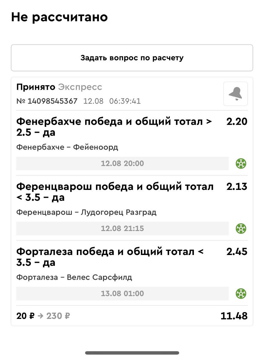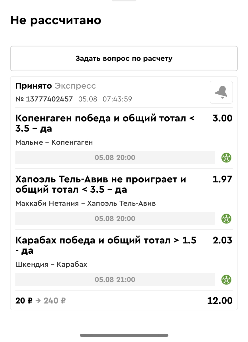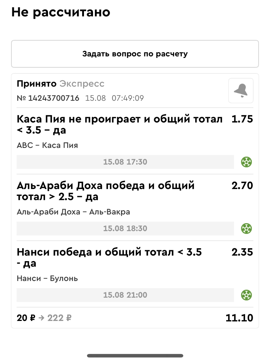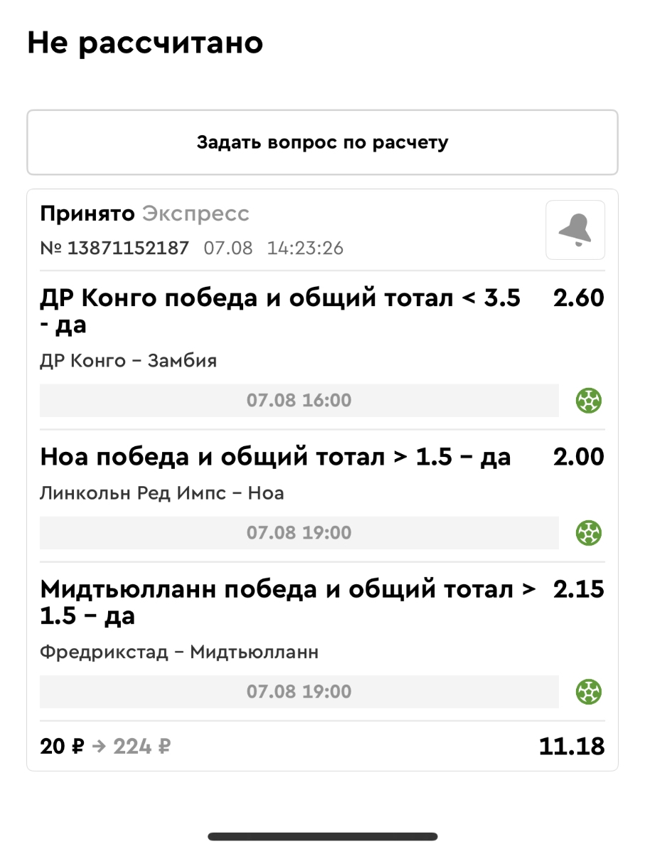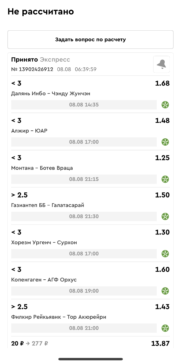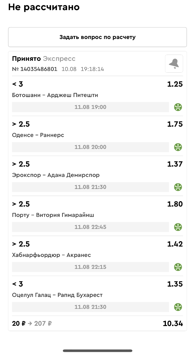 Ежедневные экспрессы за 07.08.25 все проиграли! Итого за день - 8 000р.  Итого за год по экспрессам - 867 500 ₽, за август - 58 000 р. Экспрессы на 08.08.25. Очень неплохо на самом деле идут дела,  если не смотреть на конечный результат пока что) последнюю неделю заходы значительно возросли и постоянно не хватает одного - двух события,  думаю в ближайшее время все придет.