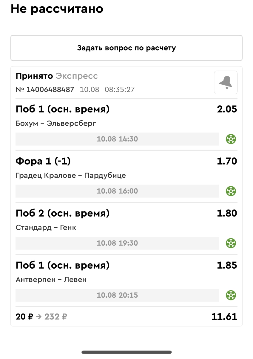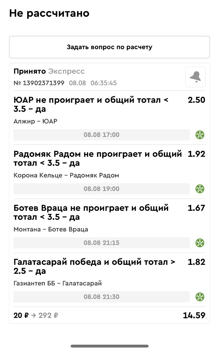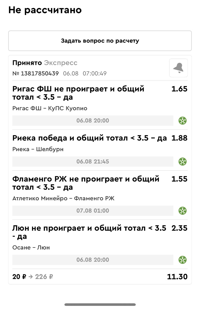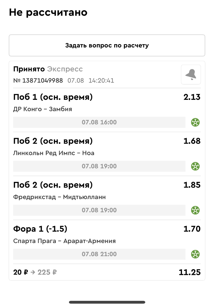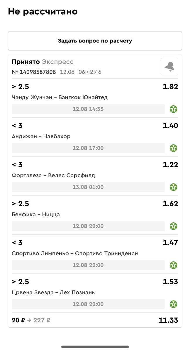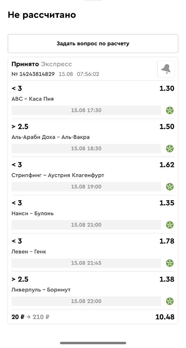 Ежедневные экспрессы за 07.08.25 все проиграли! Итого за день - 8 000р.  Итого за год по экспрессам - 867 500 ₽, за август - 58 000 р. Экспрессы на 08.08.25. Очень неплохо на самом деле идут дела,  если не смотреть на конечный результат пока что) последнюю неделю заходы значительно возросли и постоянно не хватает одного - двух события,  думаю в ближайшее время все придет.