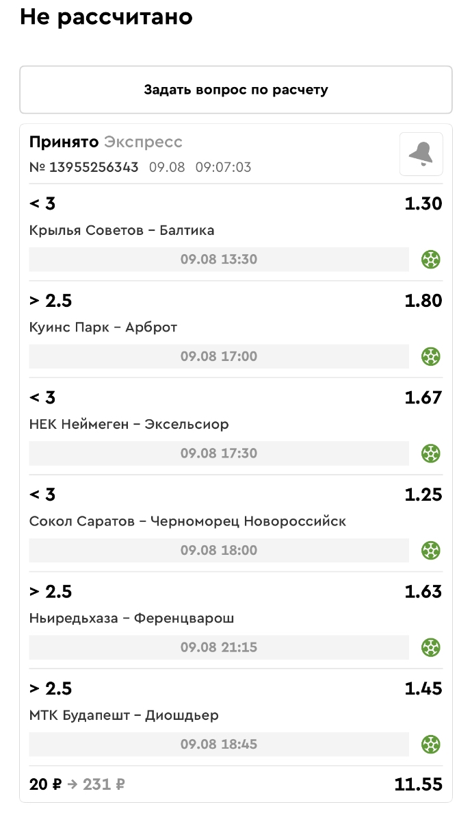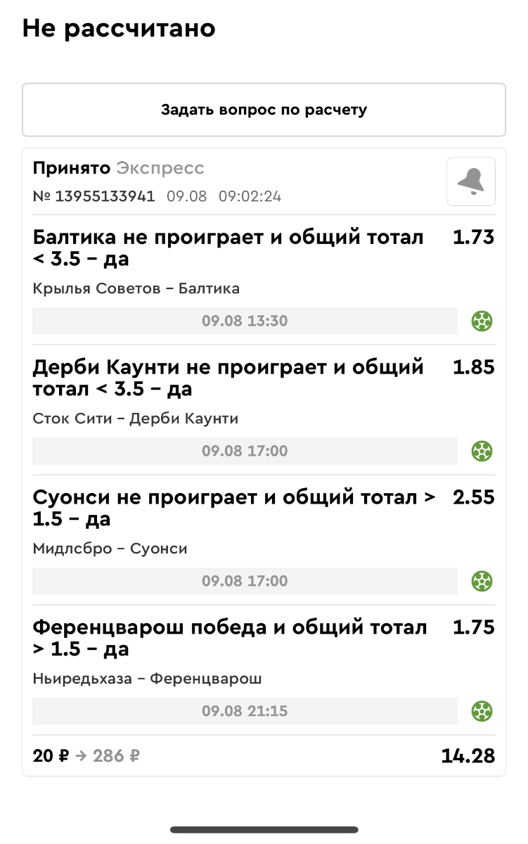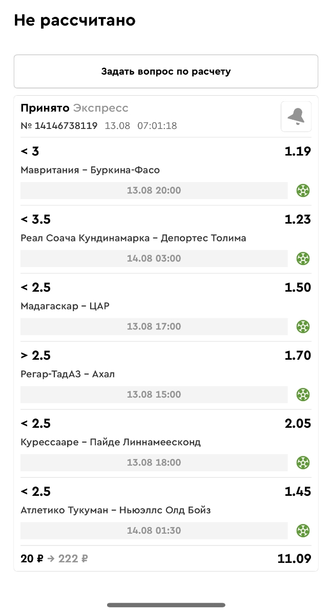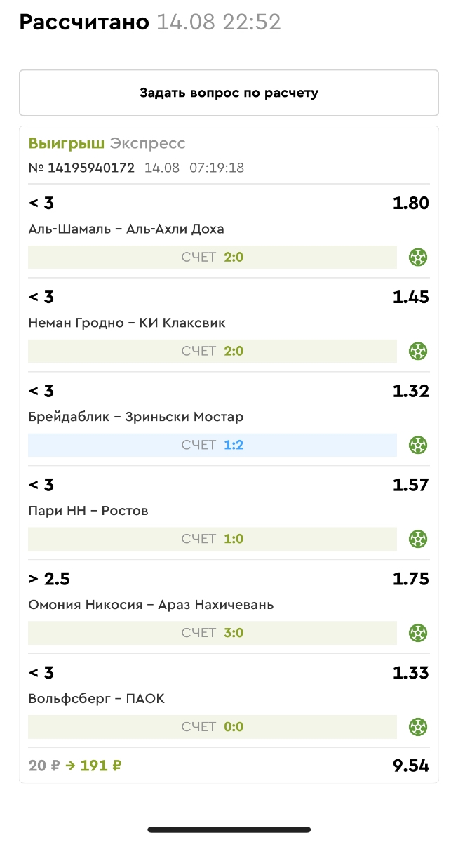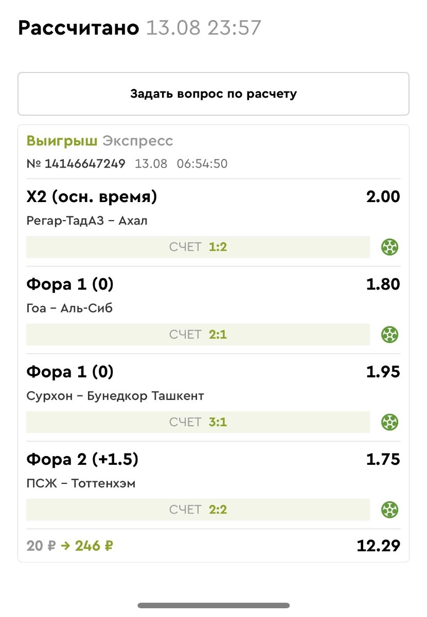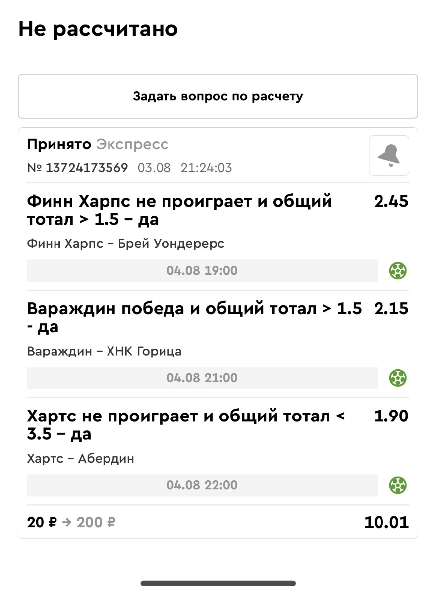 Ежедневные экспрессы за 07.08.25 все проиграли! Итого за день - 8 000р.  Итого за год по экспрессам - 867 500 ₽, за август - 58 000 р. Экспрессы на 08.08.25. Очень неплохо на самом деле идут дела,  если не смотреть на конечный результат пока что) последнюю неделю заходы значительно возросли и постоянно не хватает одного - двух события,  думаю в ближайшее время все придет.