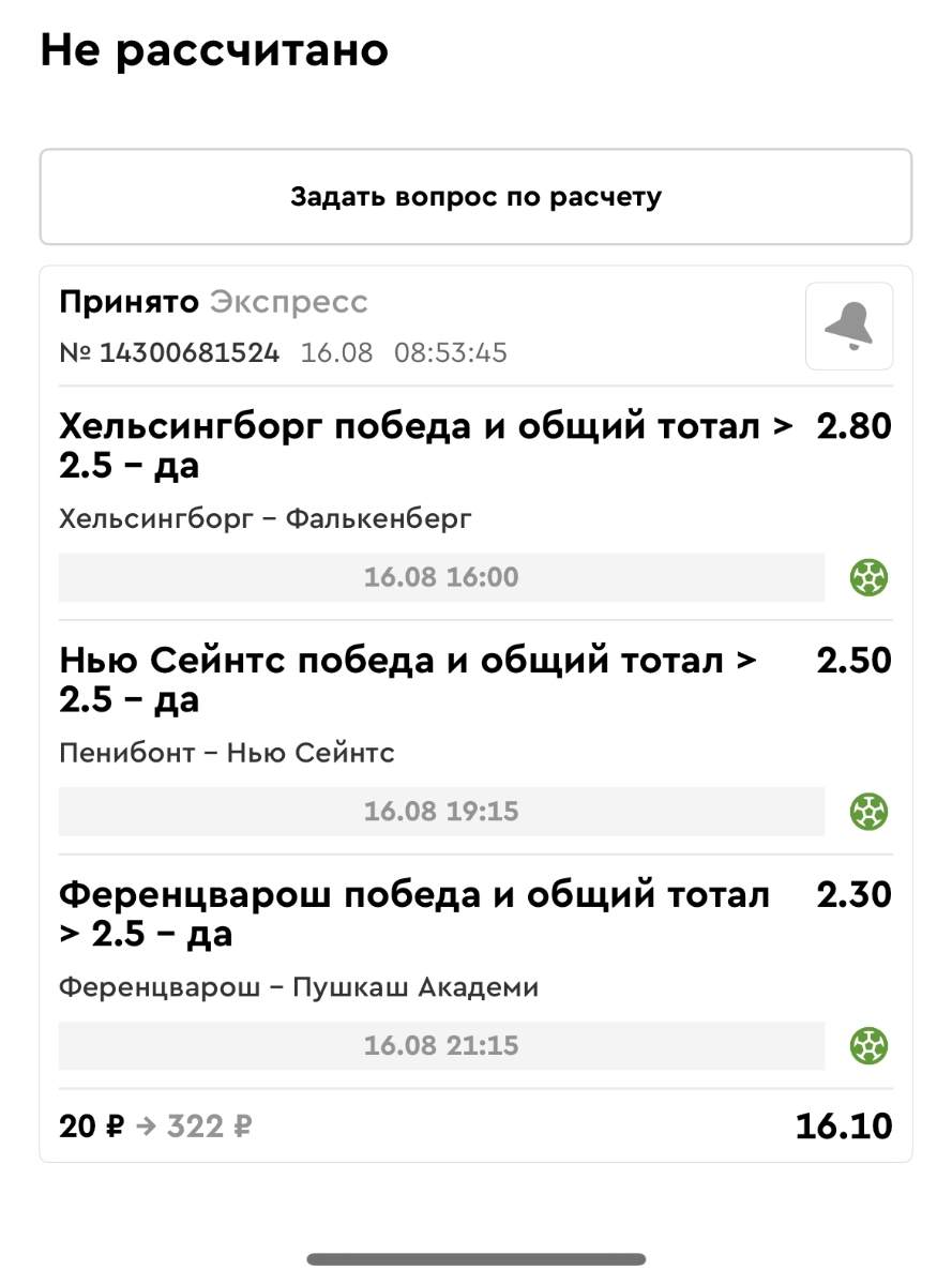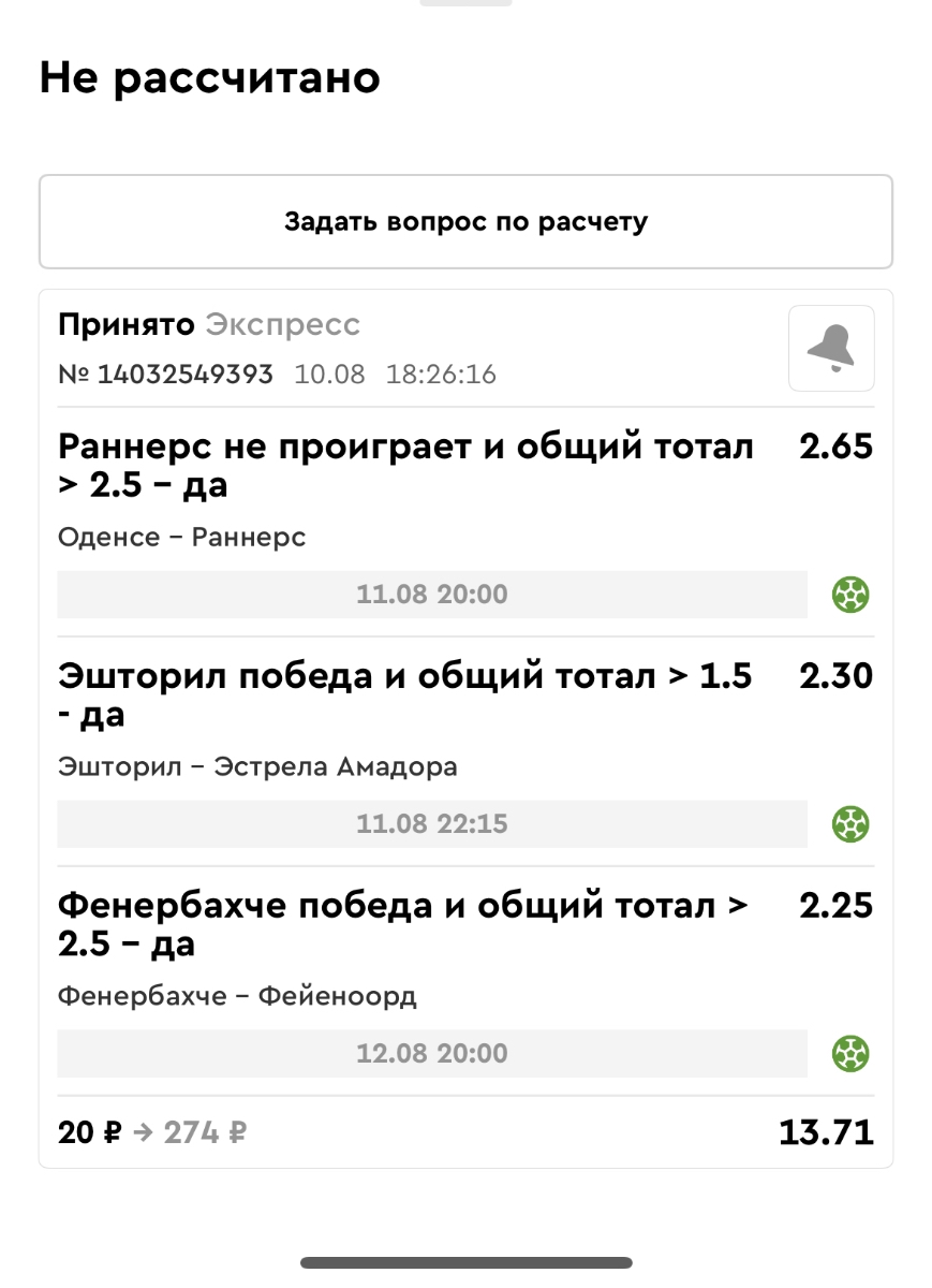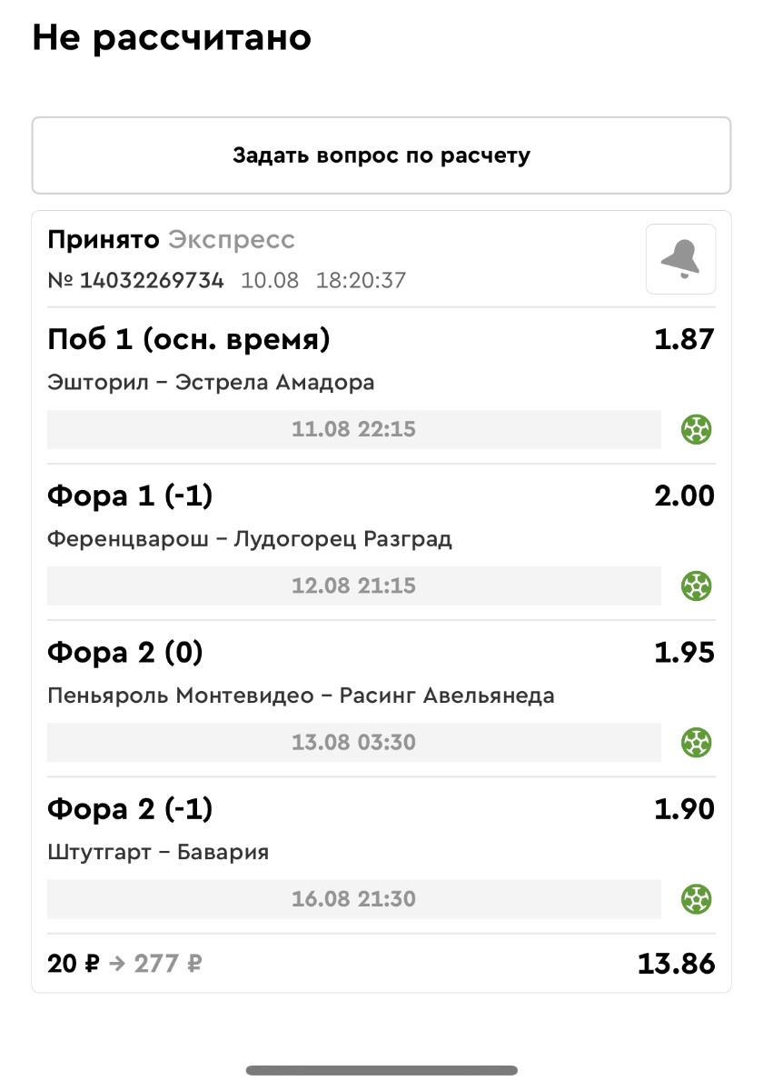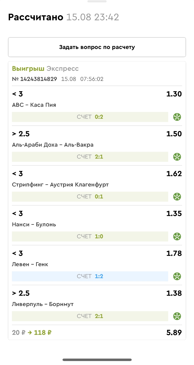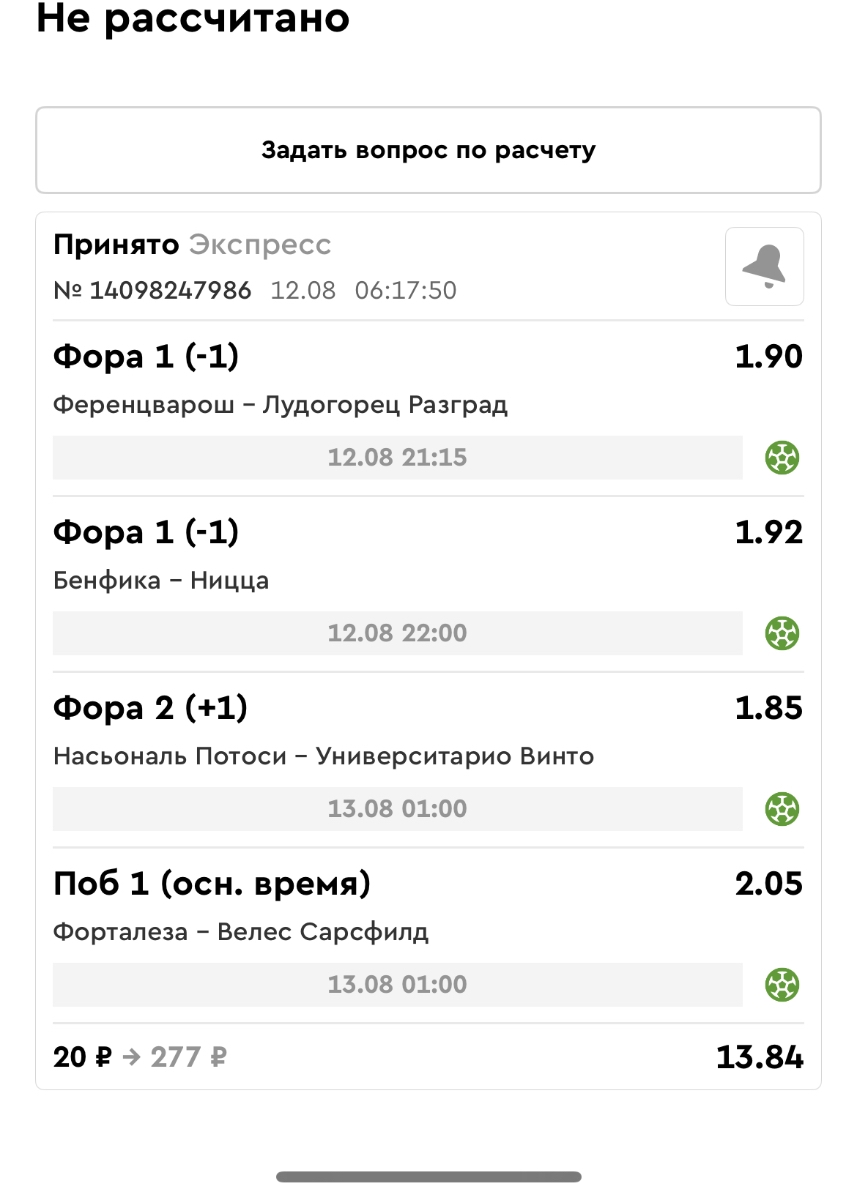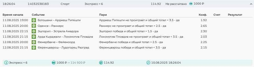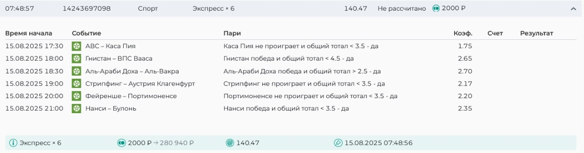 Мини экспрессы ежедневные за 15.08.25 все проиграли, кроме Тотал, он выиграл с возвратами, разгоняем его дальше. Итого банк -40 ₽ Банк 4119 ₽ -17,62%! Мини экспрессы на сегодня 16.08.25