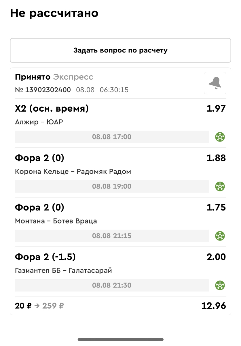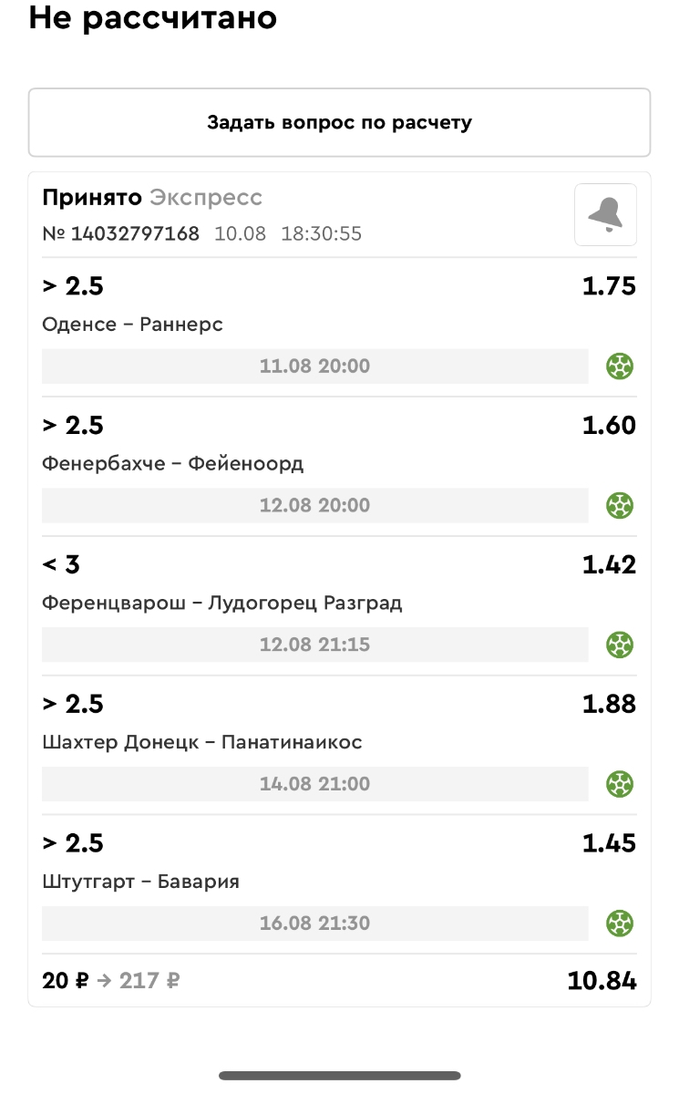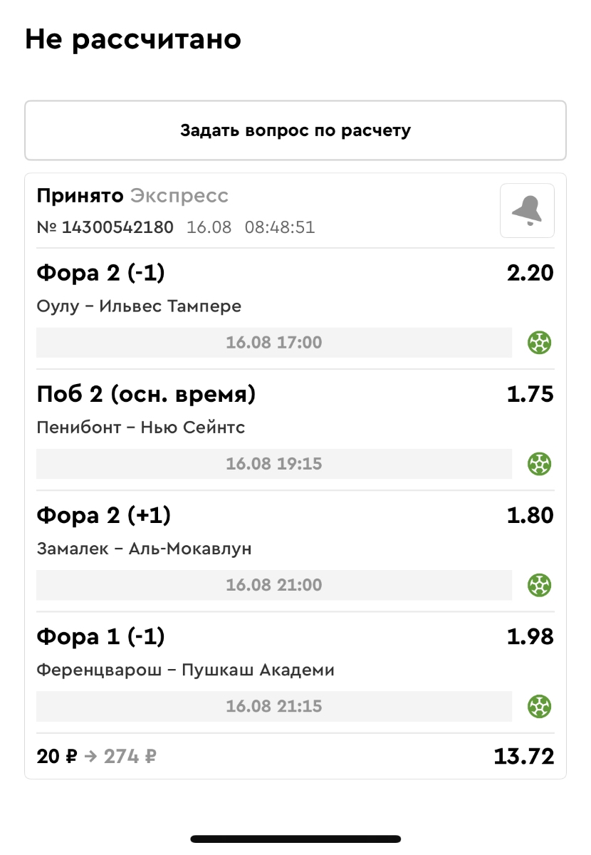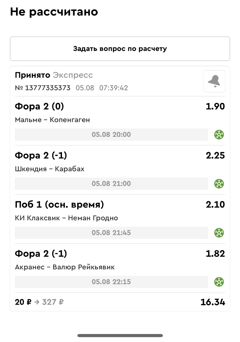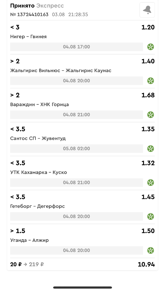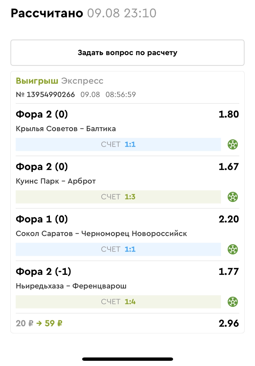 Мини экспрессы ежедневные за 15.08.25 все проиграли, кроме Тотал, он выиграл с возвратами, разгоняем его дальше. Итого банк -40 ₽ Банк 4119 ₽ -17,62%! Мини экспрессы на сегодня 16.08.25