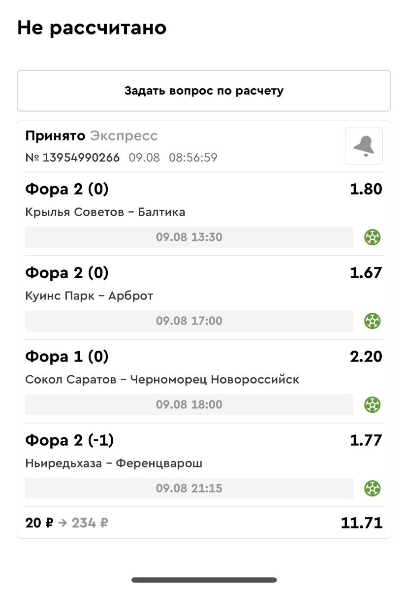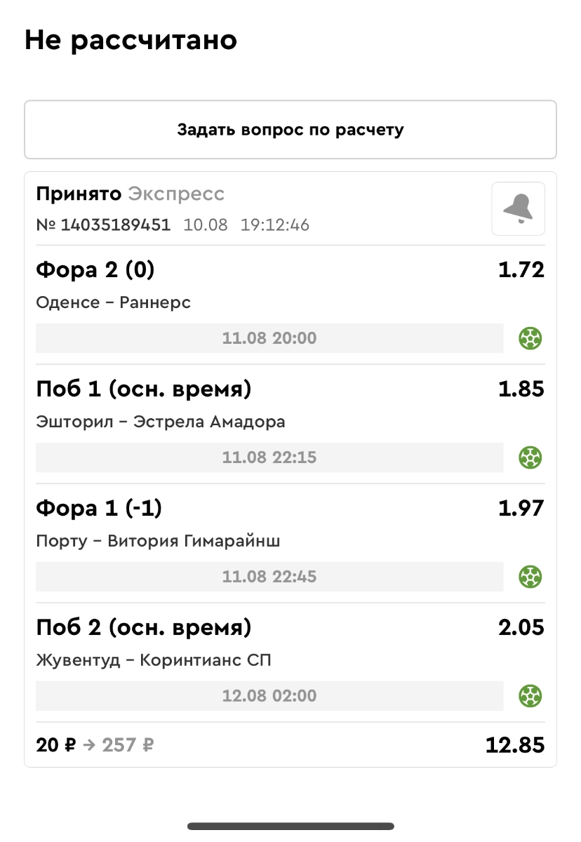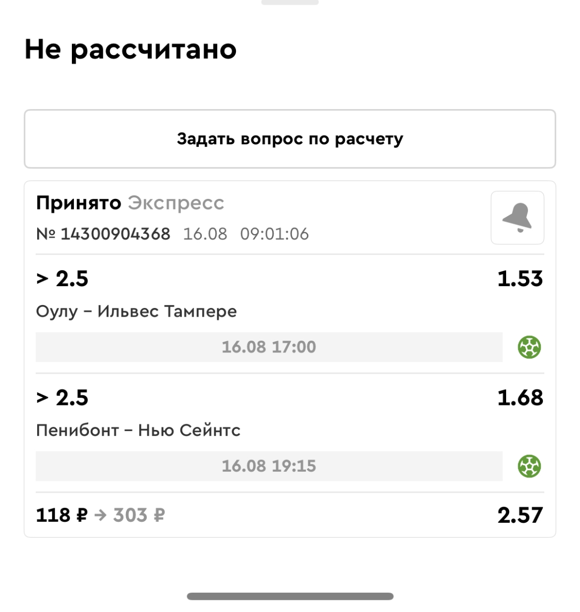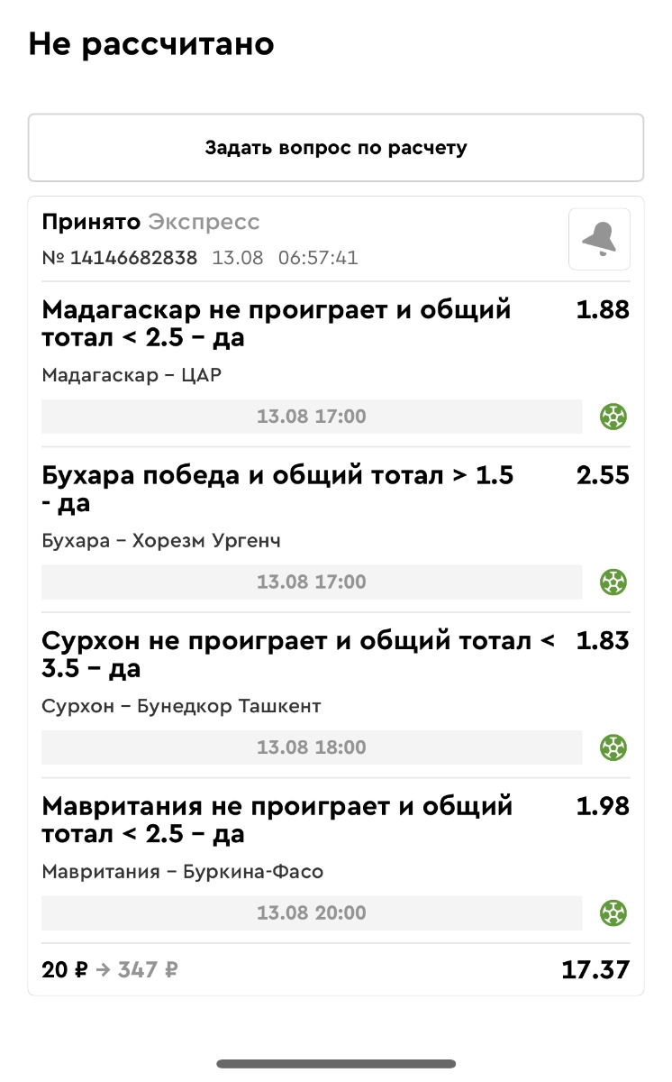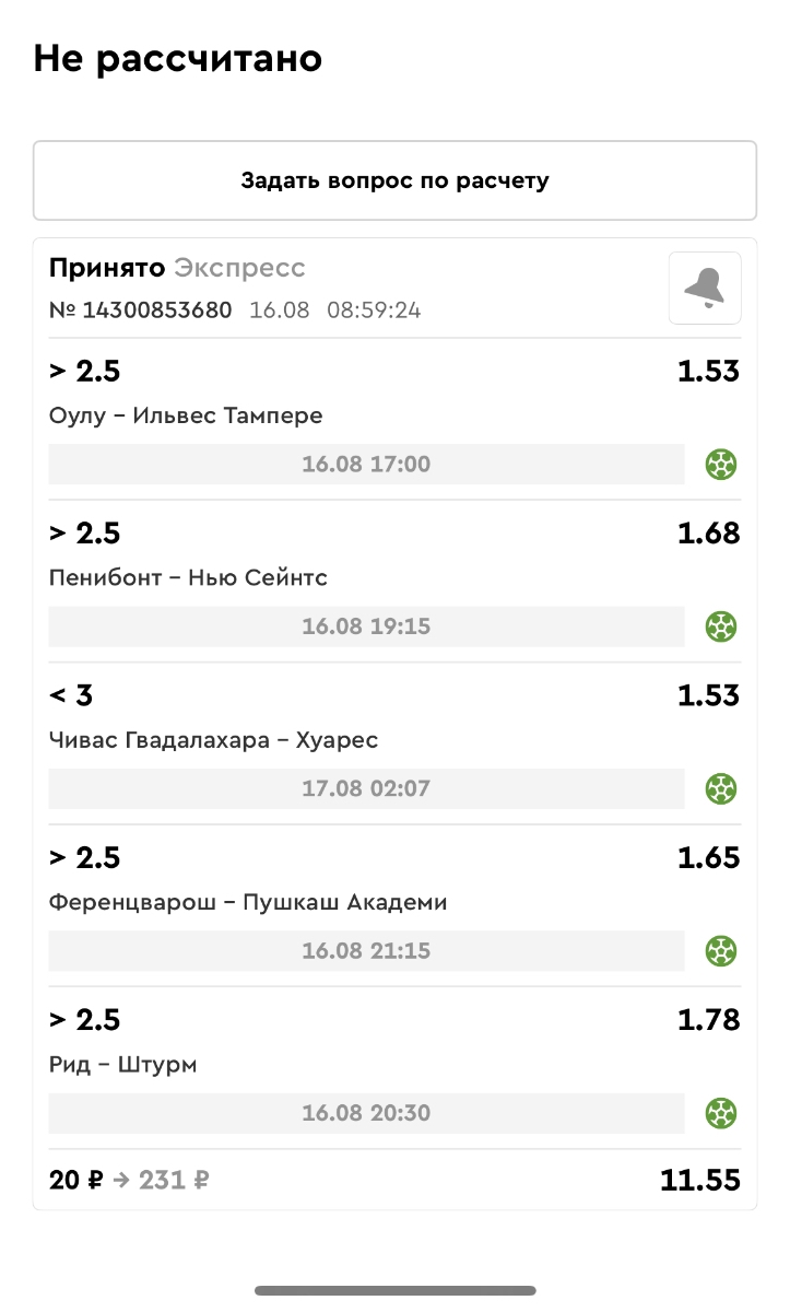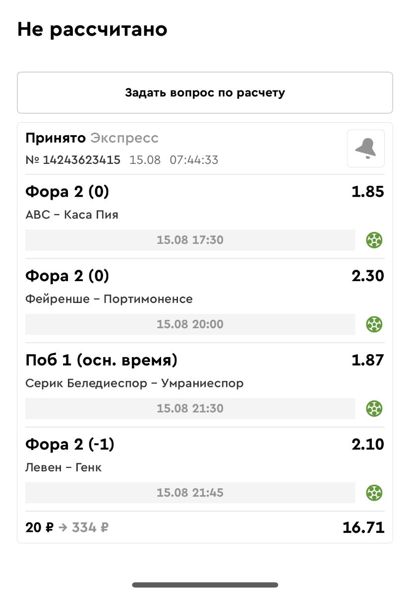 Мини экспрессы ежедневные за 15.08.25 все проиграли, кроме Тотал, он выиграл с возвратами, разгоняем его дальше. Итого банк -40 ₽ Банк 4119 ₽ -17,62%! Мини экспрессы на сегодня 16.08.25