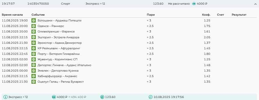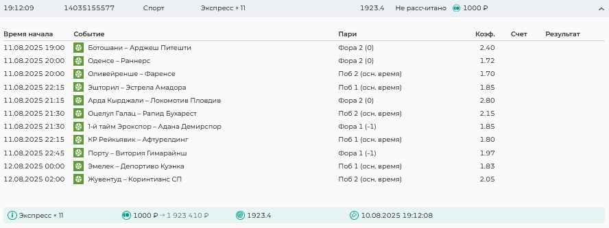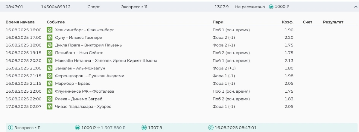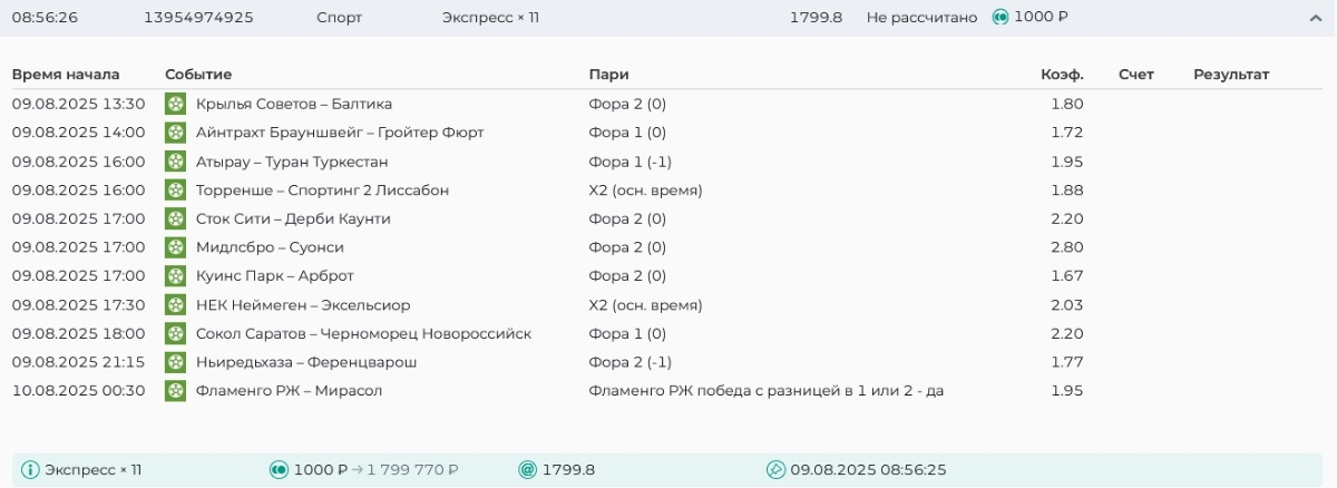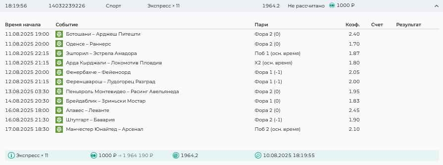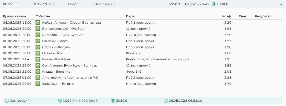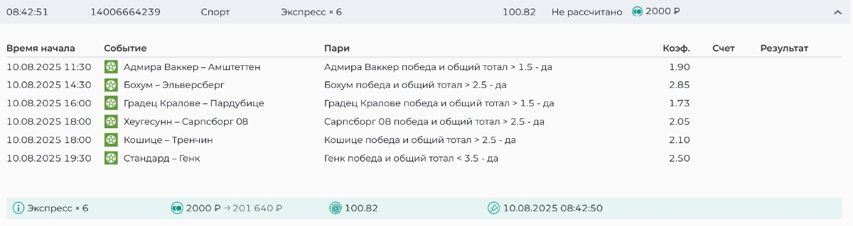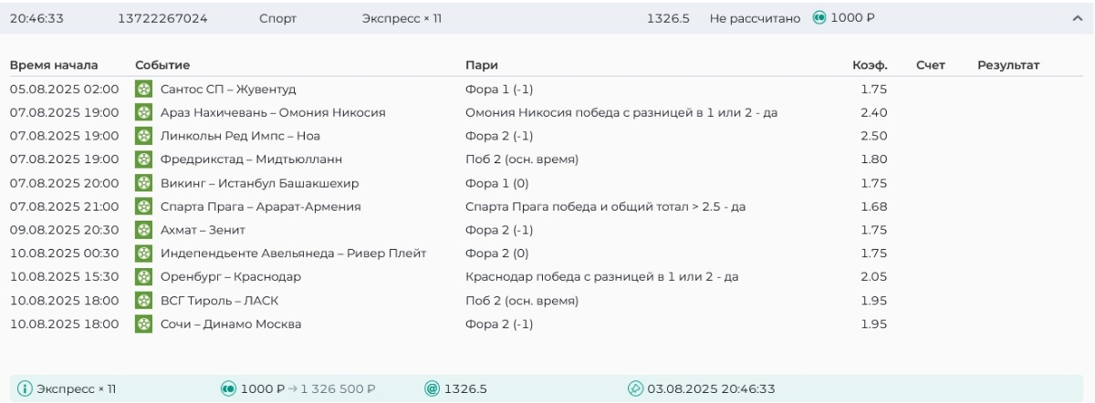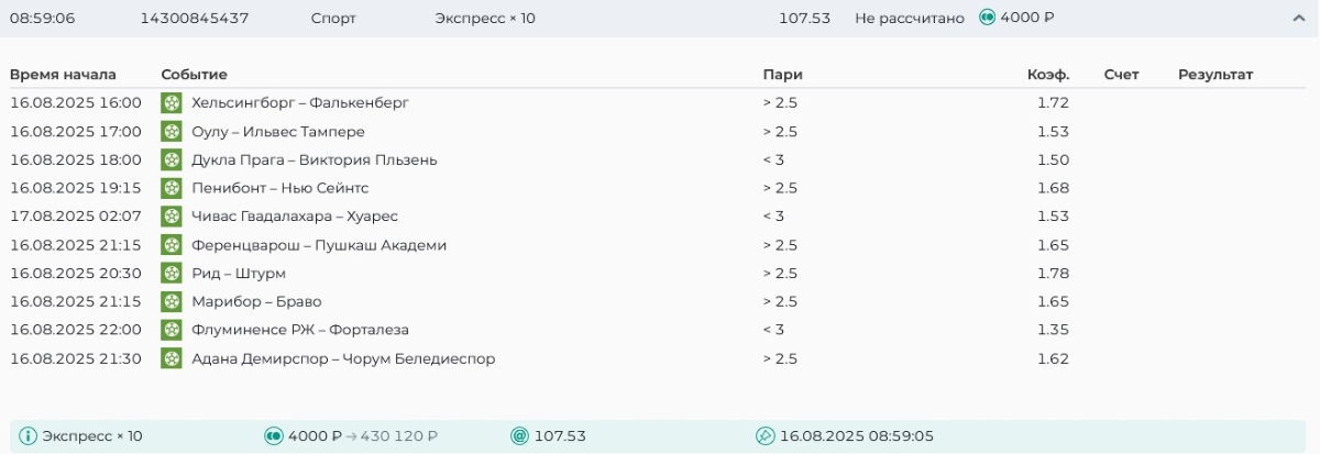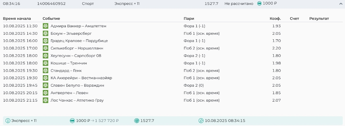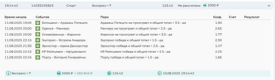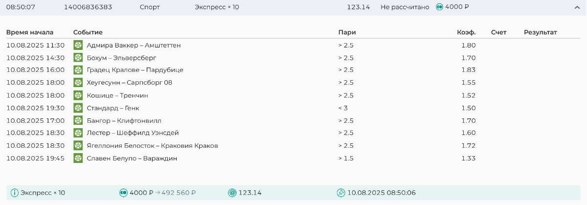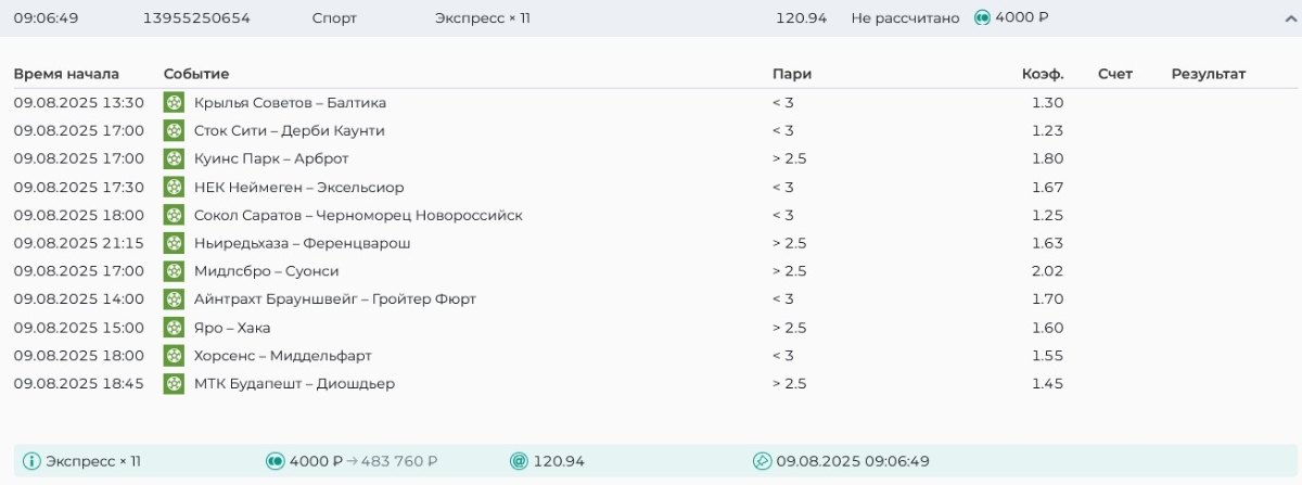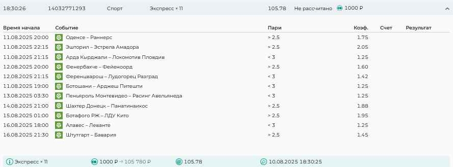 Ежедневные экспрессы за 10.08.25 все проиграли! Итого за день - 9 000р. Экспрессы на 11.08.25. Еженедельные экспрессы все проиграли , итого за неделю -4000 р Итого за год по экспрессам - 897 500 ₽, за август - 88 000 р.