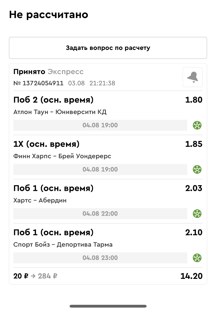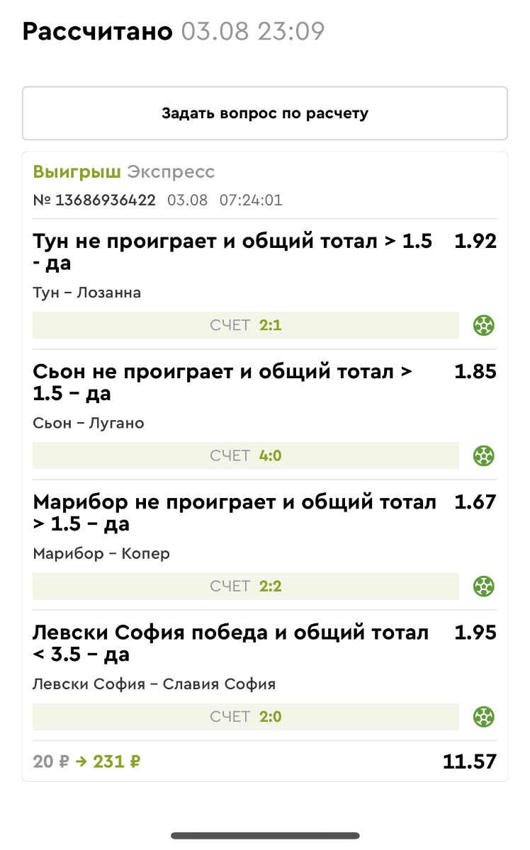 Ежедневные экспрессы за 03.08.25 все проиграли кроме экспресс8 ,  по нему возврат! Итого за день - 6 000р. Еженедельные экспрессы все проиграли за прошлую неделю - 4000 р. Итого за год по экспрессам - 835 500 ₽, за август - 26 000 р. Экспрессы на 04.08.25,  а так же недельные экспрессы с 04.08.25-10.08.25. Удача  на минус 100=) за эту неделю результаты сильно улучшились,  не зашли 3 экспресса из-за одного события,  однако они все таки не зашли.