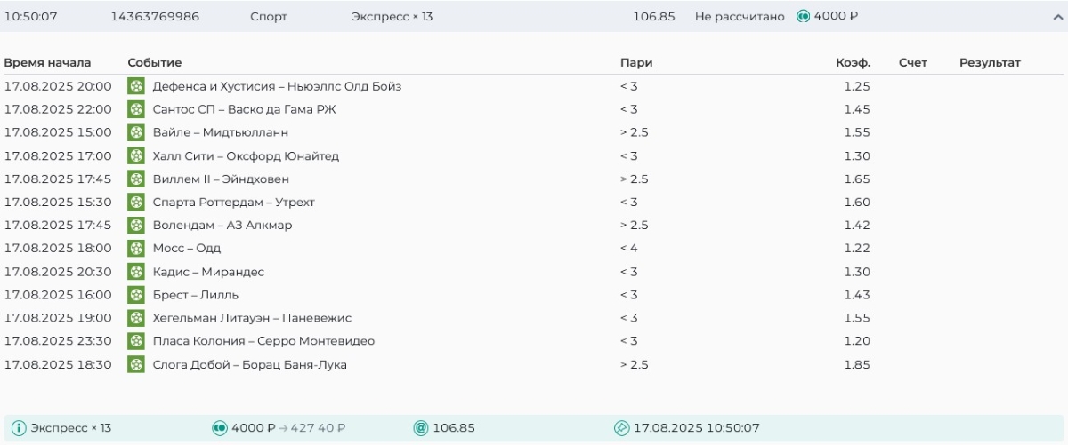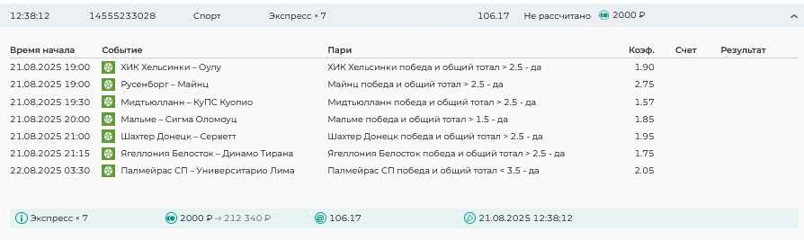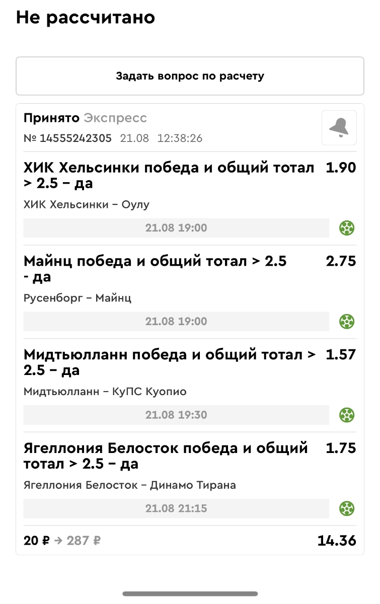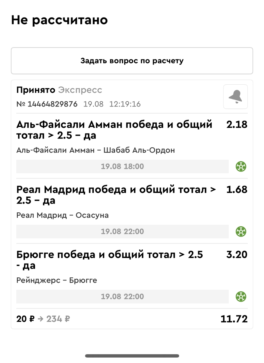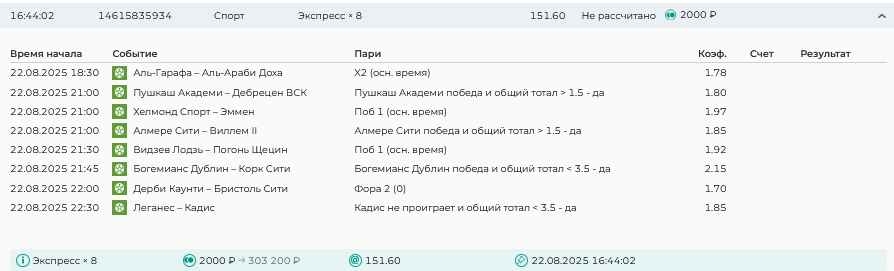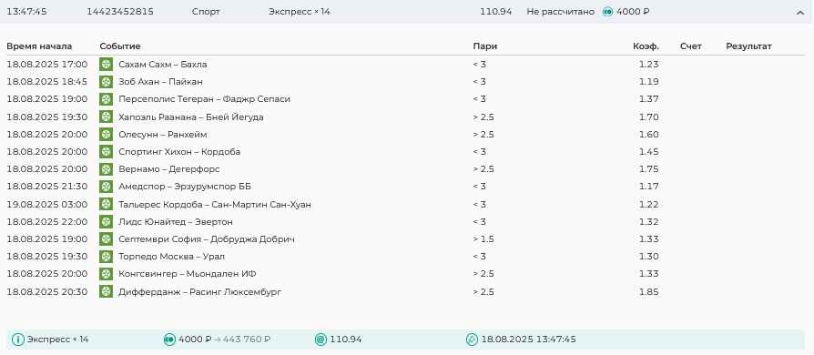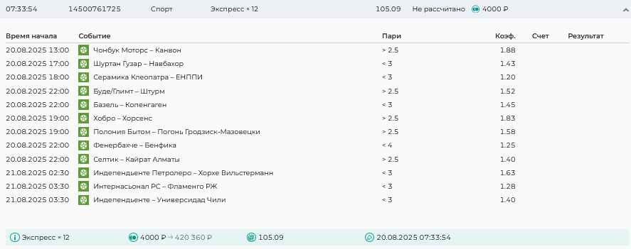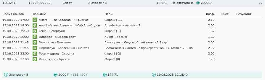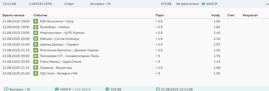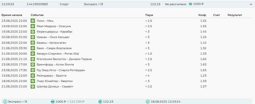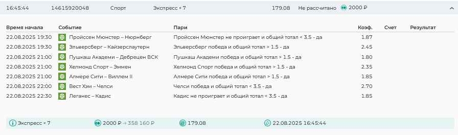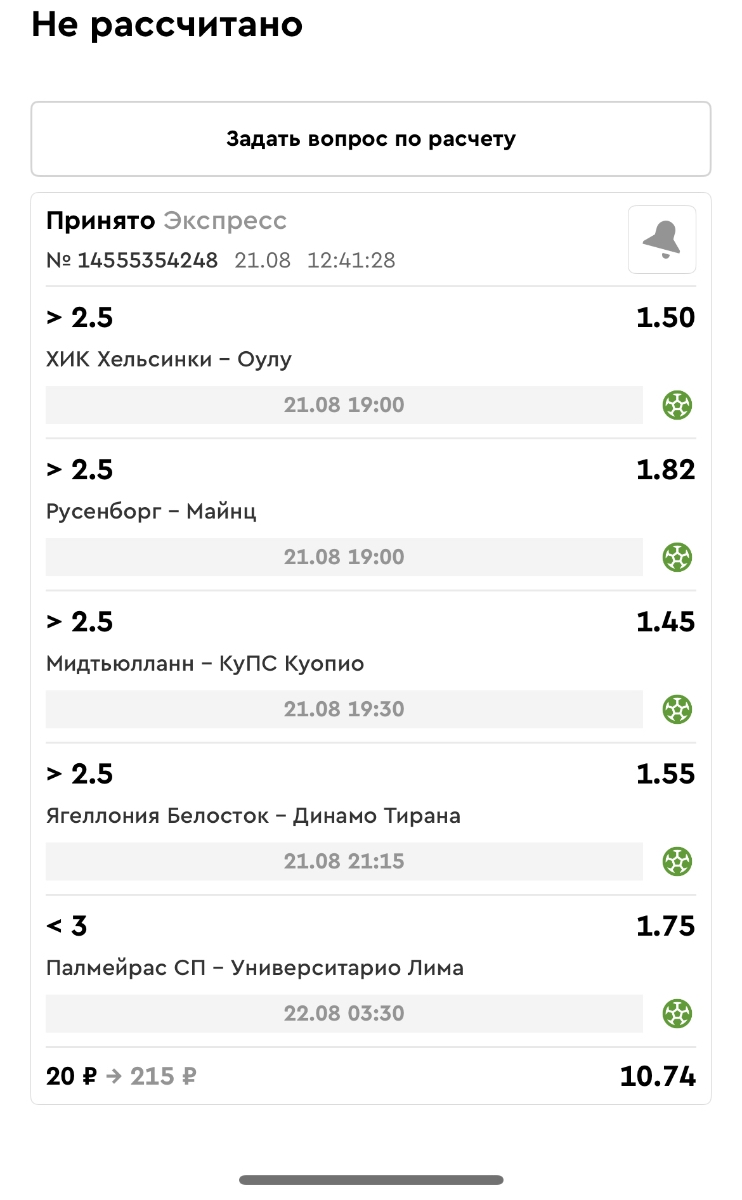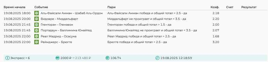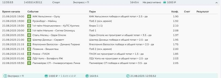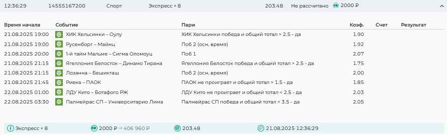 Koyaanisquatsi Hopi 98 Опубликовано 21 августа Автор Поделиться Опубликовано 21 августа Ежедневные экспрессы за 20.08.25 все проиграли. Итого за день - 9 000р. Экспрессы на 21.08.25 Итого за год по экспрессам - 990 500 ₽, за август - 182 000 р. Цитата Ссылка на комментарий https://brcbet.com/topic/429498-master-klass-po-razdevaniyu-bukmekera-tolko-fevral/page/26/#findComment-511209 Поделиться на другие сайты Поделиться