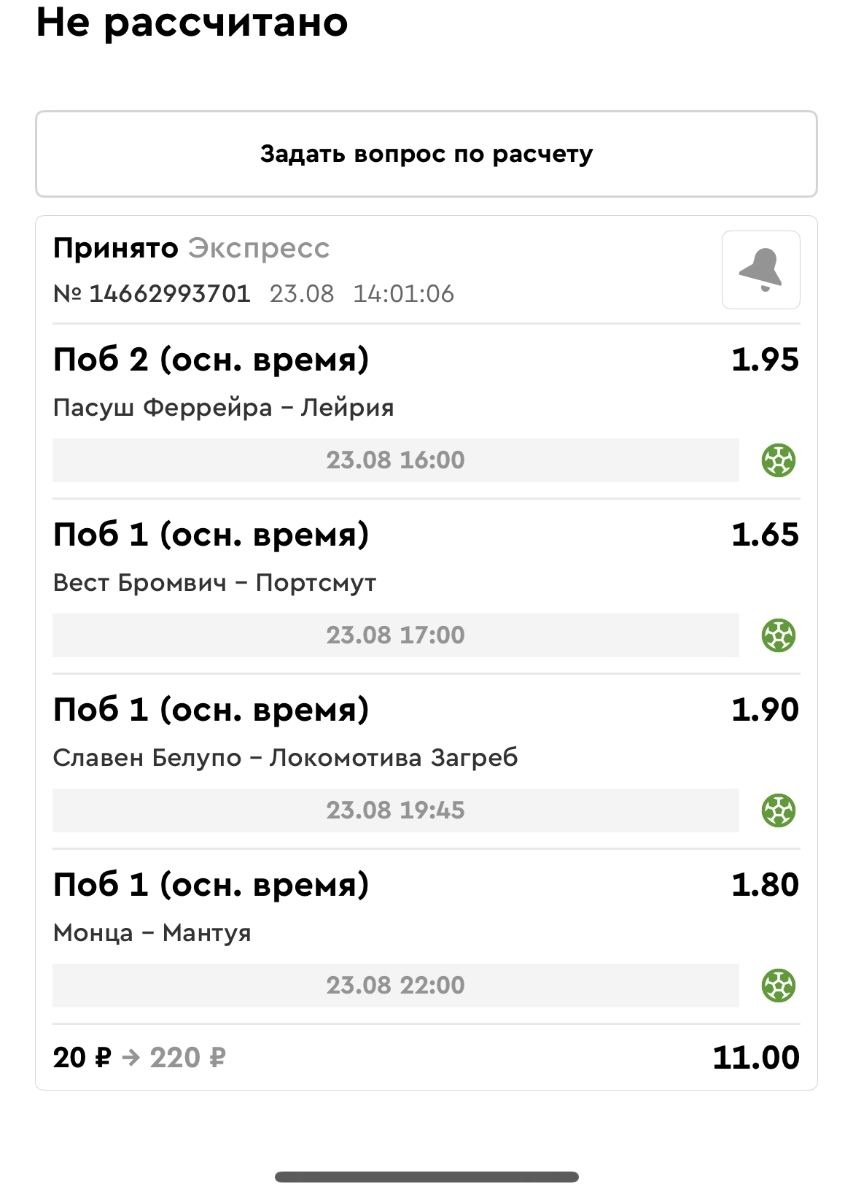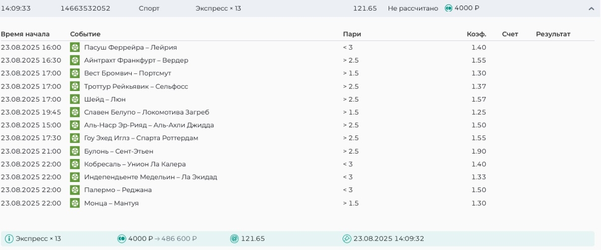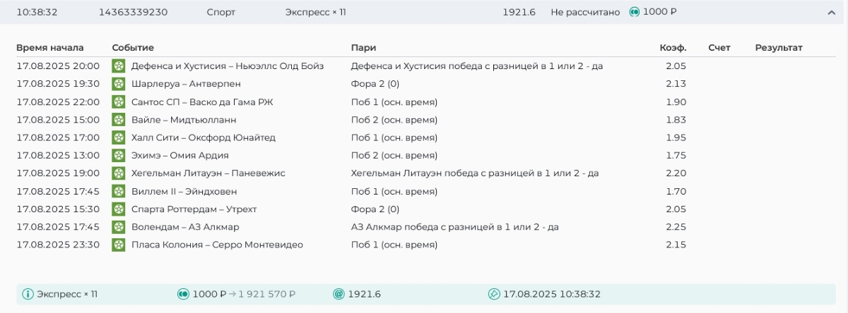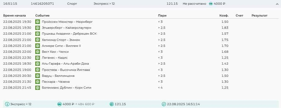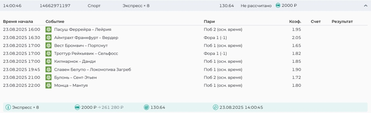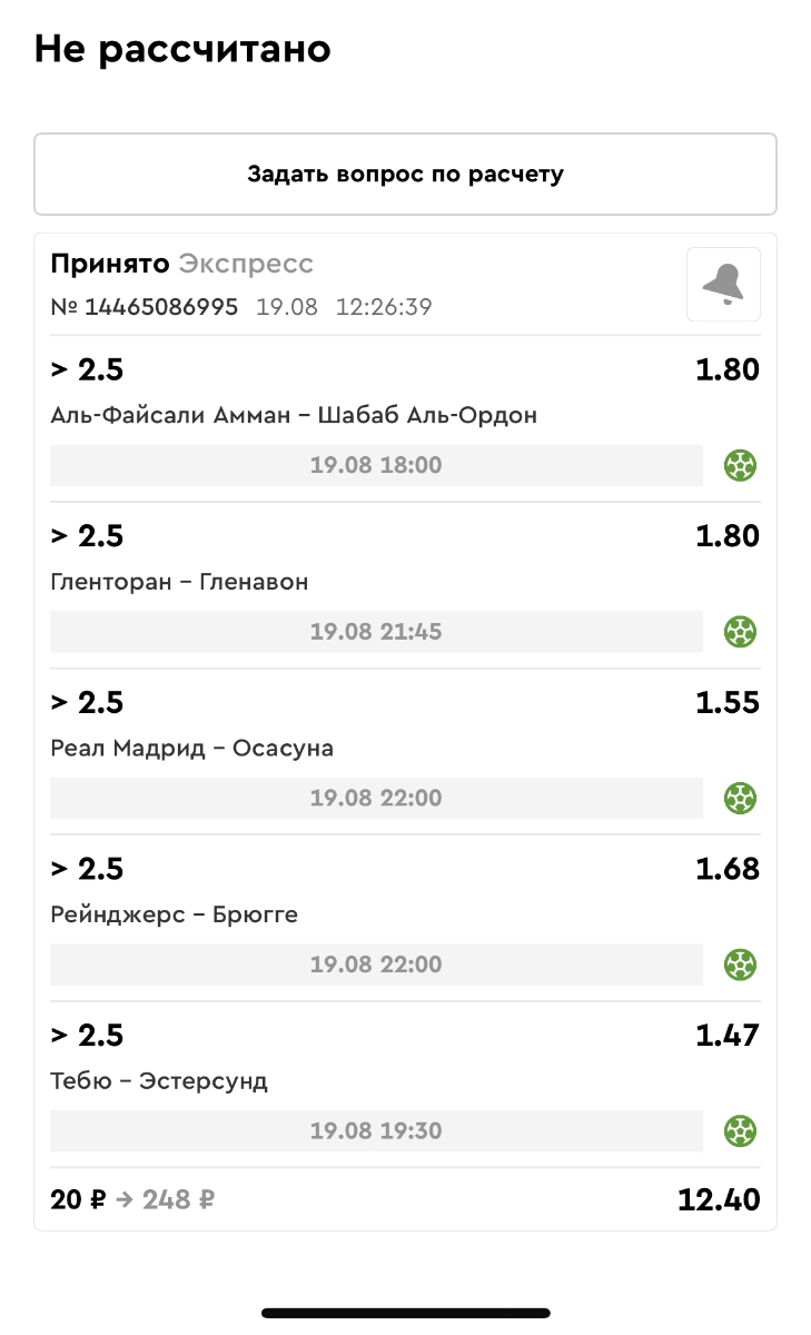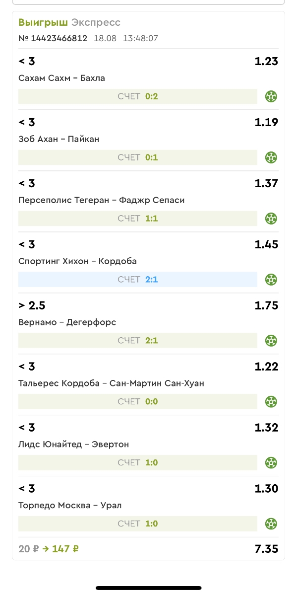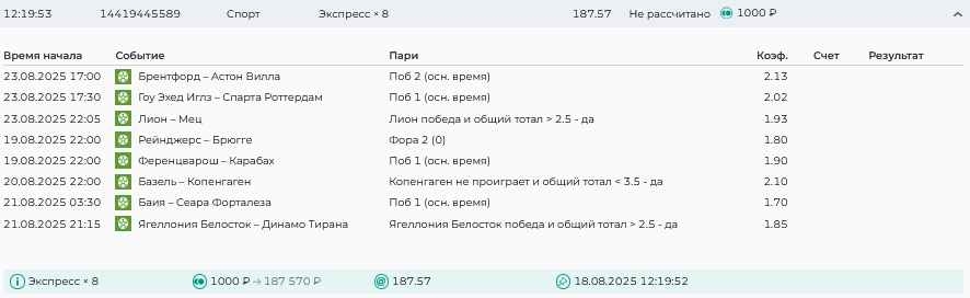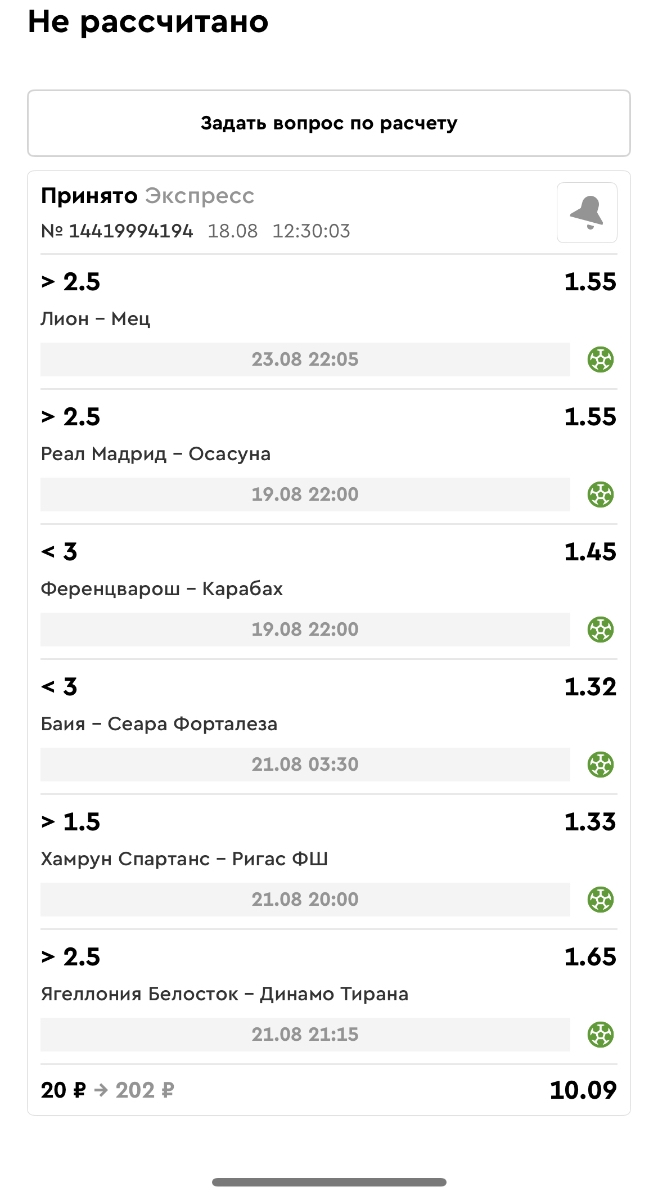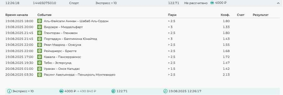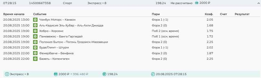 Koyaanisquatsi Hopi 98 Опубликовано 21 августа Автор Поделиться Опубликовано 21 августа Ежедневные экспрессы за 20.08.25 все проиграли. Итого за день - 9 000р. Экспрессы на 21.08.25 Итого за год по экспрессам - 990 500 ₽, за август - 182 000 р. Цитата Ссылка на комментарий https://brcbet.com/topic/429498-master-klass-po-razdevaniyu-bukmekera-tolko-fevral/page/26/#findComment-511209 Поделиться на другие сайты Поделиться