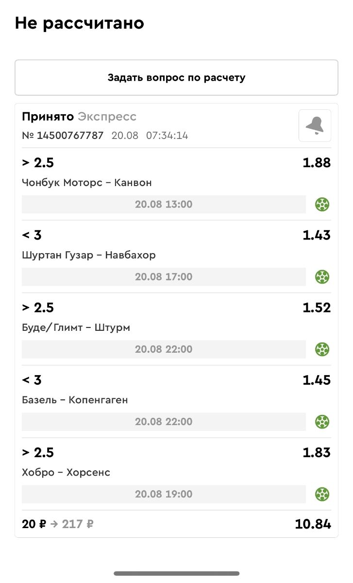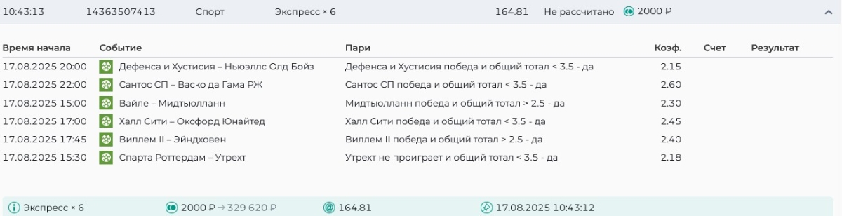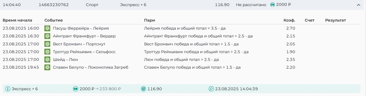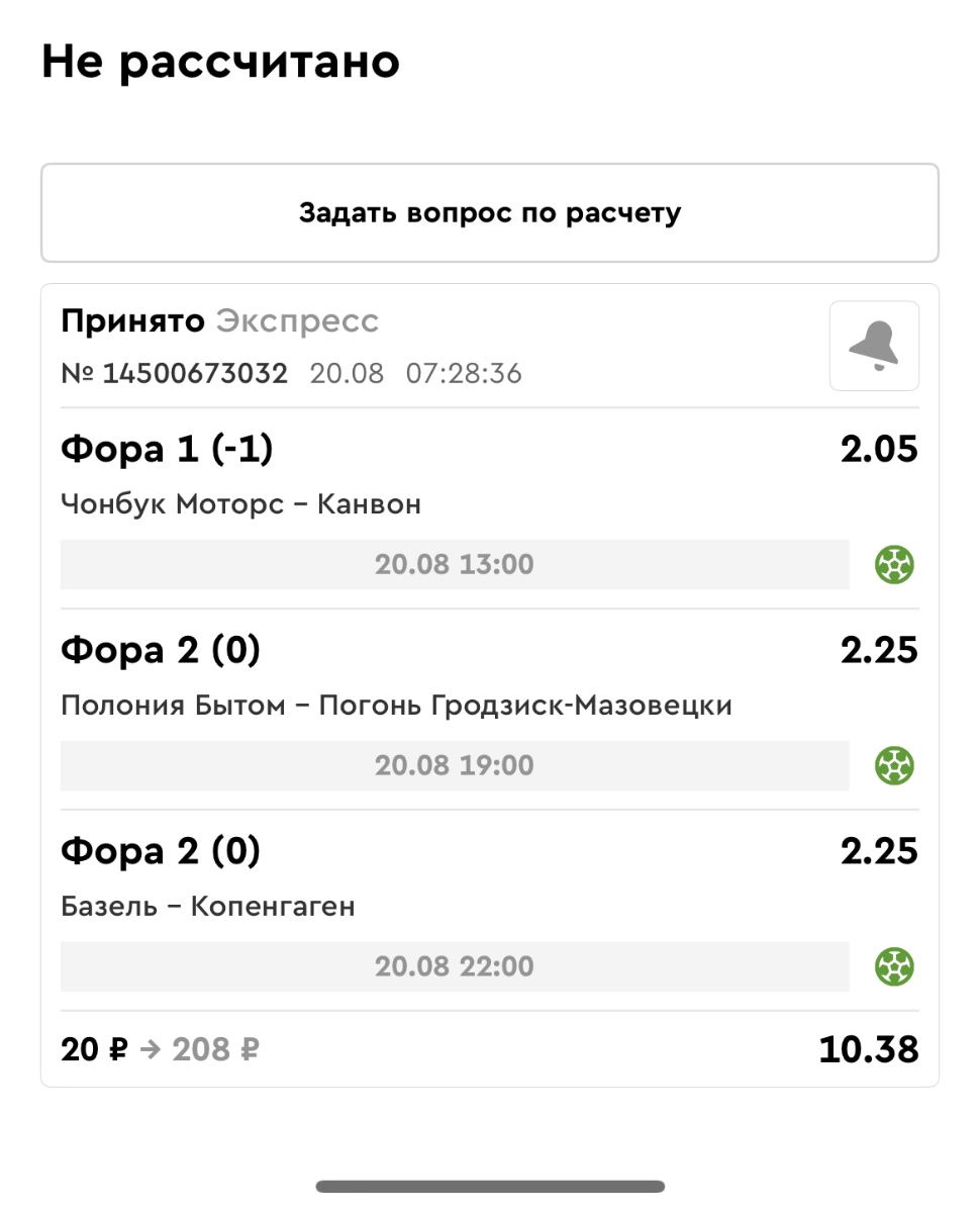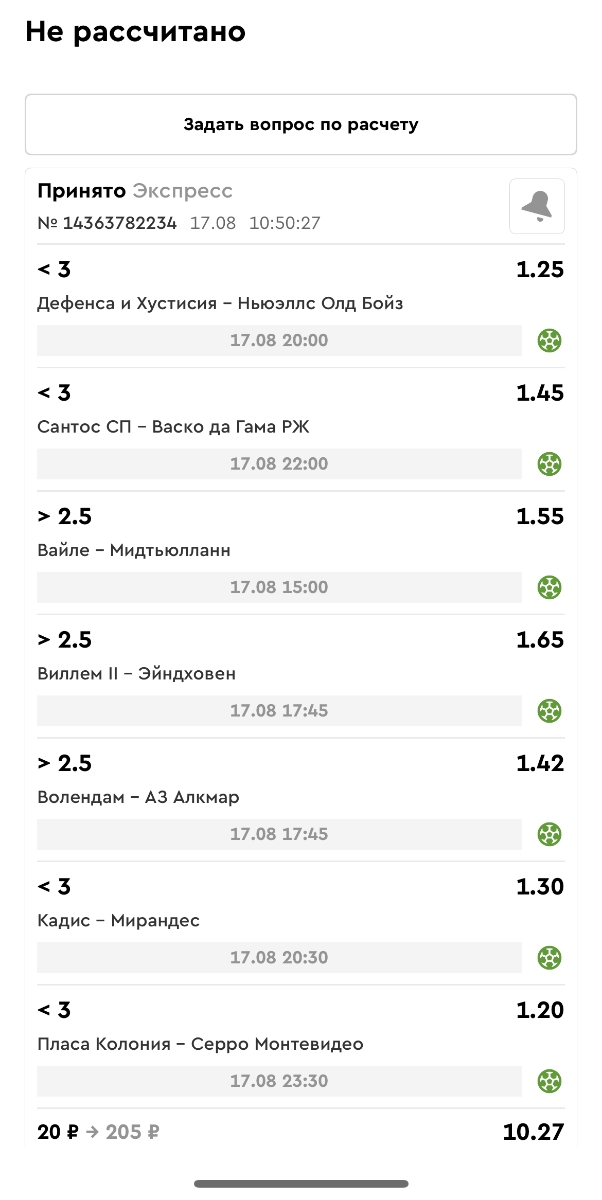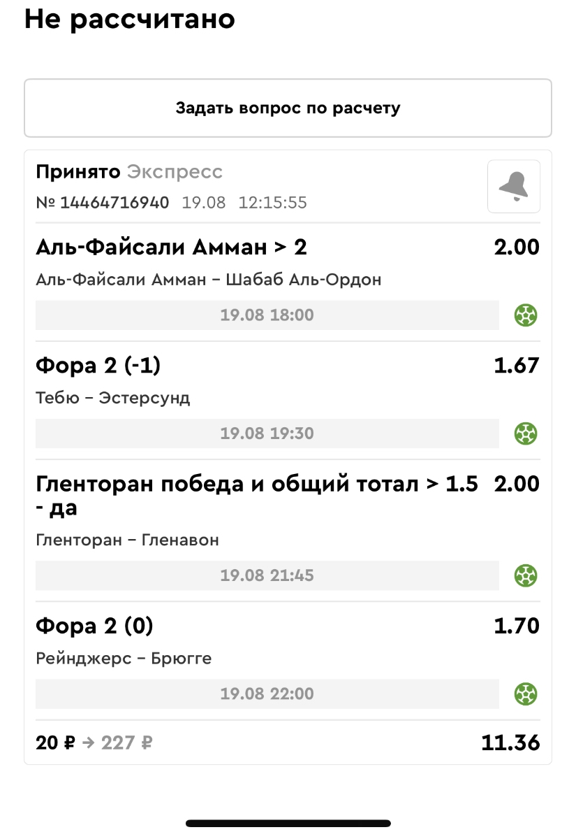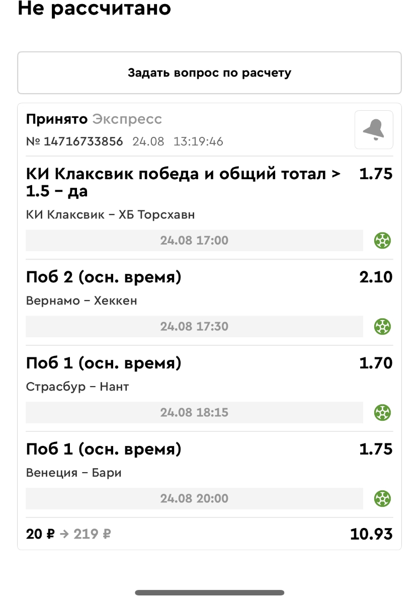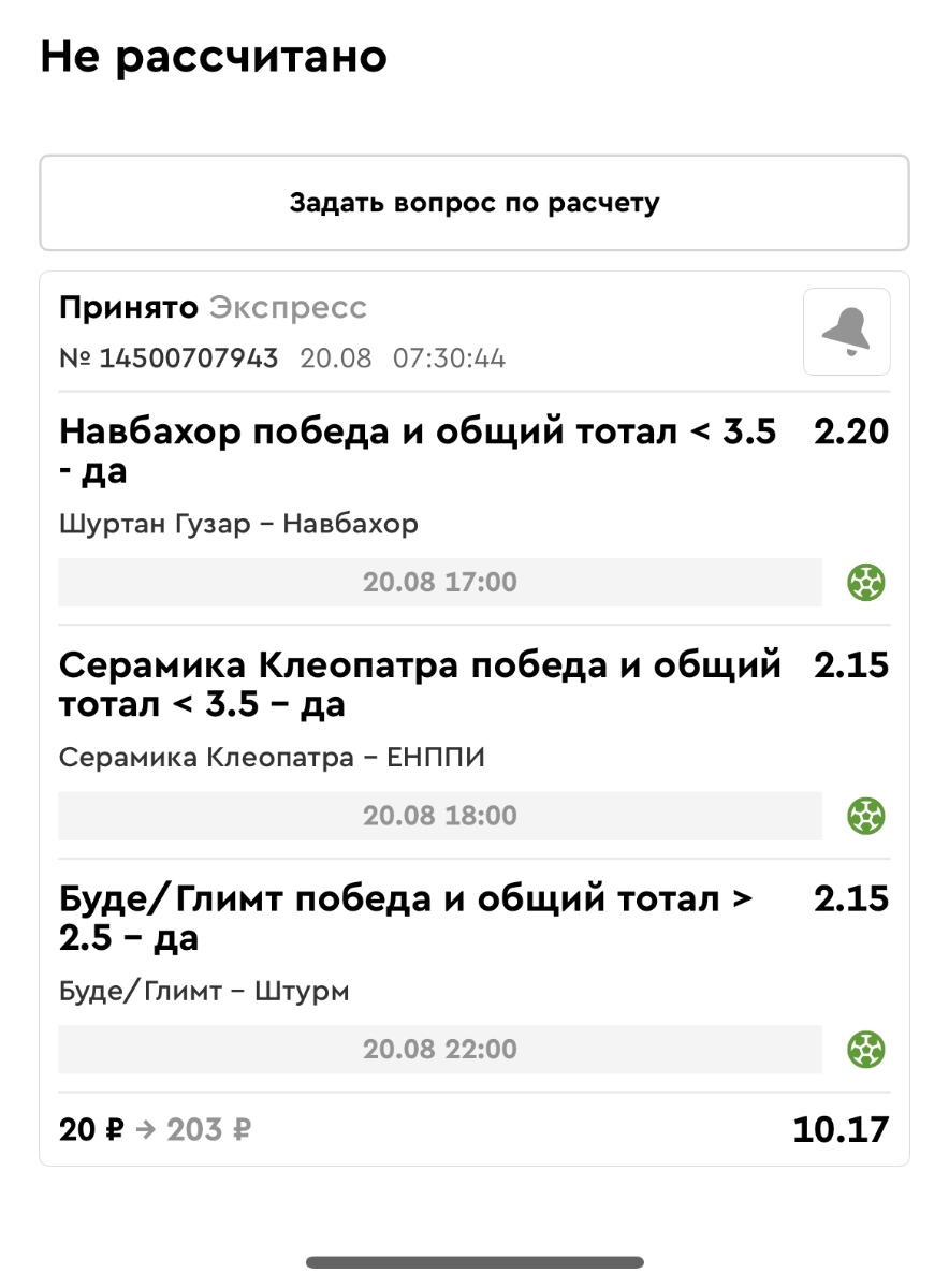 Koyaanisquatsi Hopi 98 Опубликовано 21 августа Автор Поделиться Опубликовано 21 августа Ежедневные экспрессы за 20.08.25 все проиграли. Итого за день - 9 000р. Экспрессы на 21.08.25 Итого за год по экспрессам - 990 500 ₽, за август - 182 000 р. Цитата Ссылка на комментарий https://brcbet.com/topic/429498-master-klass-po-razdevaniyu-bukmekera-tolko-fevral/page/26/#findComment-511209 Поделиться на другие сайты Поделиться