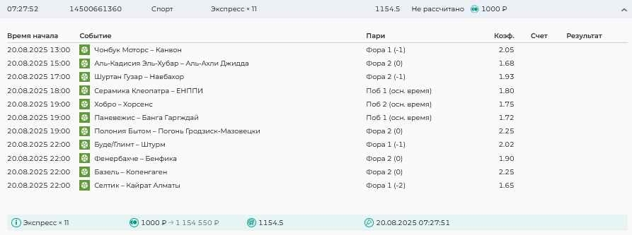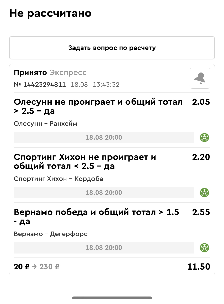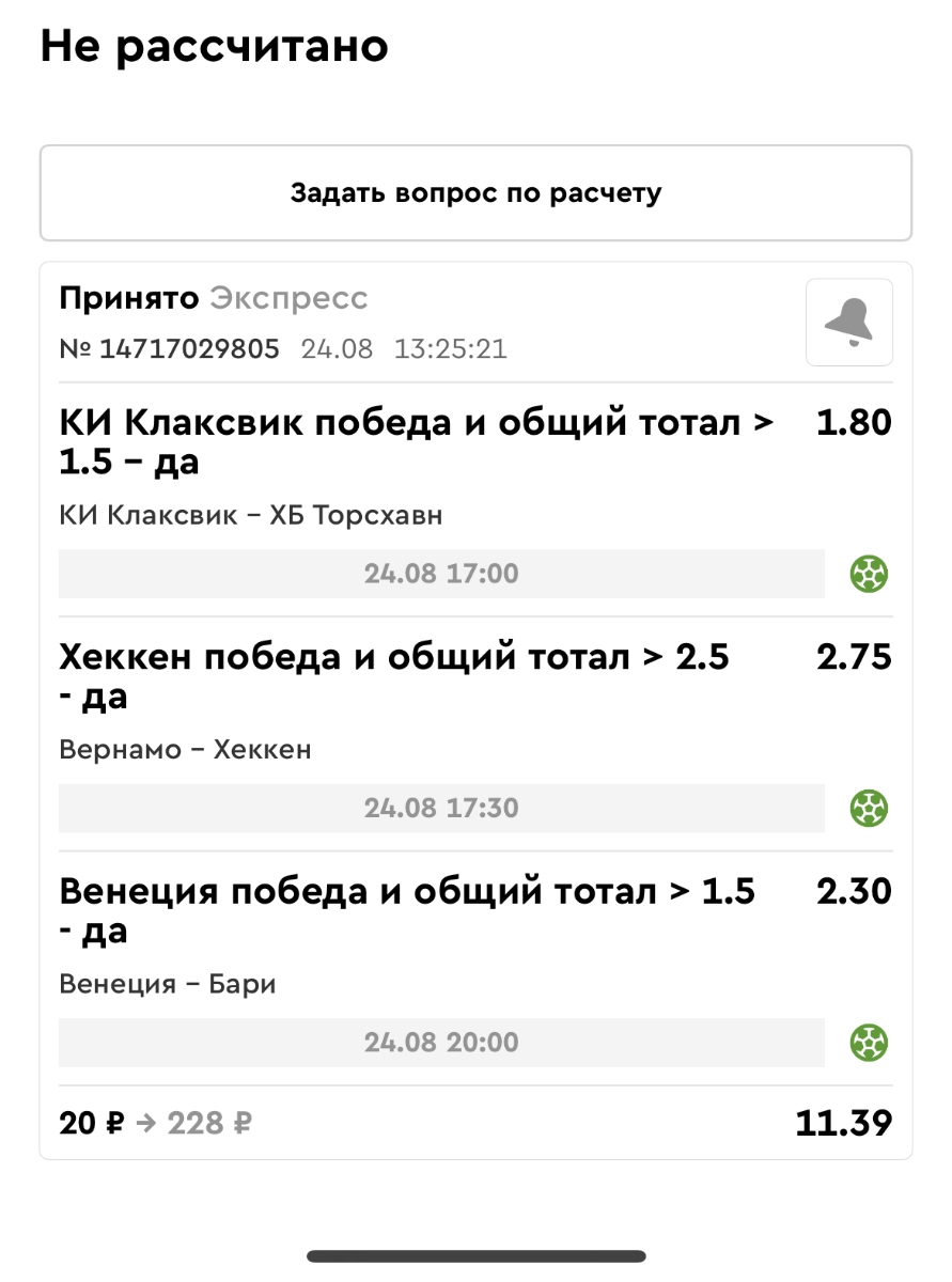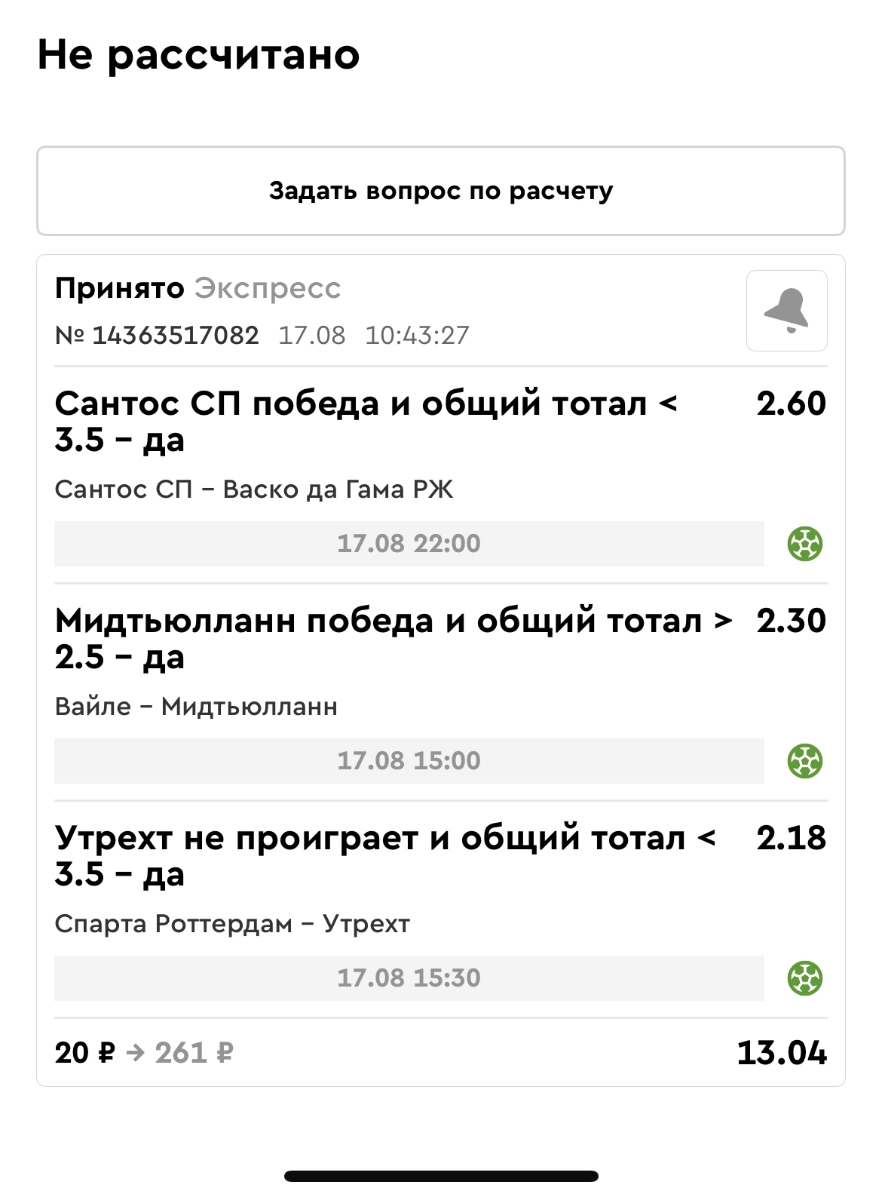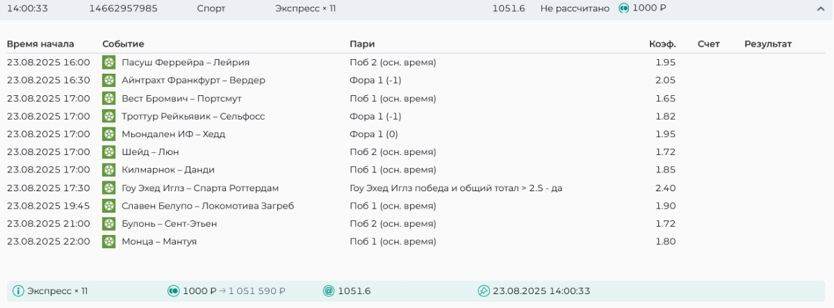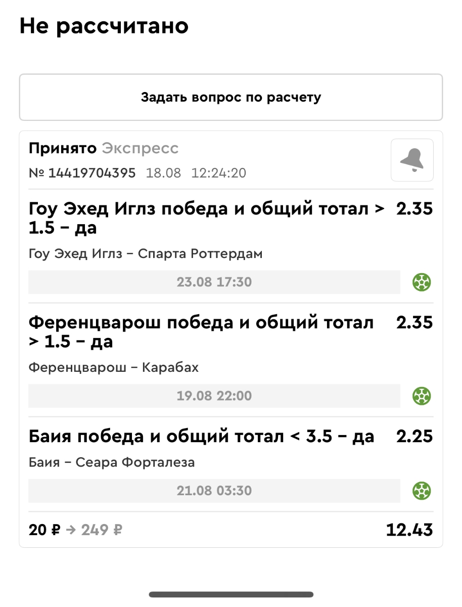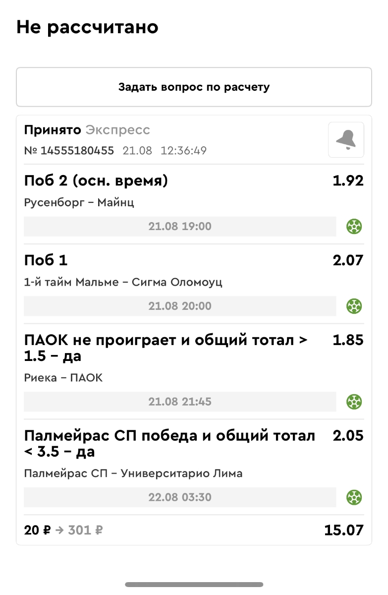 Koyaanisquatsi Hopi 98 Опубликовано 21 августа Автор Поделиться Опубликовано 21 августа Ежедневные экспрессы за 20.08.25 все проиграли. Итого за день - 9 000р. Экспрессы на 21.08.25 Итого за год по экспрессам - 990 500 ₽, за август - 182 000 р. Цитата Ссылка на комментарий https://brcbet.com/topic/429498-master-klass-po-razdevaniyu-bukmekera-tolko-fevral/page/26/#findComment-511209 Поделиться на другие сайты Поделиться