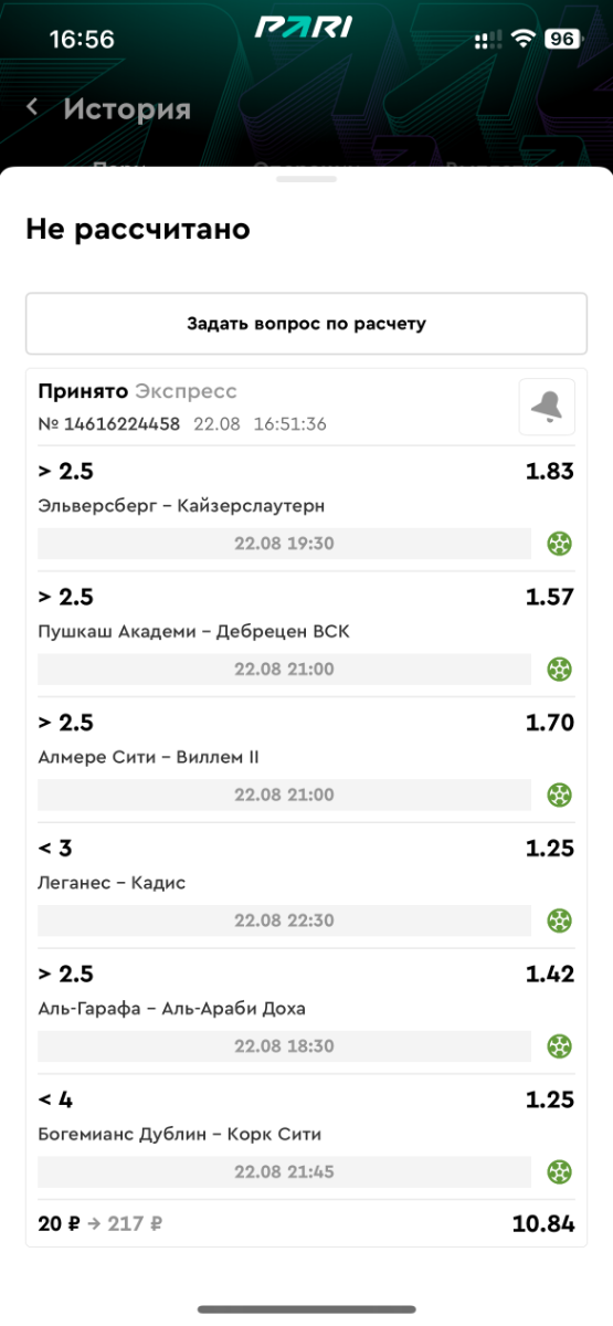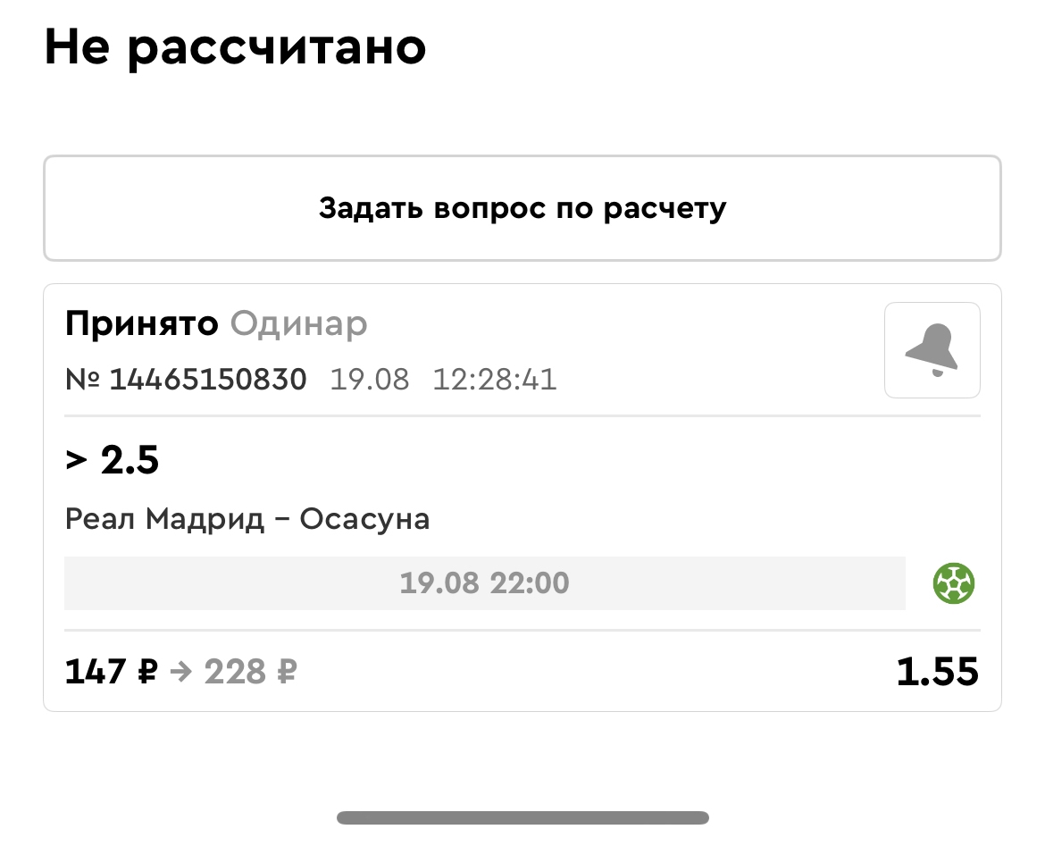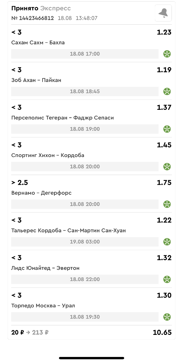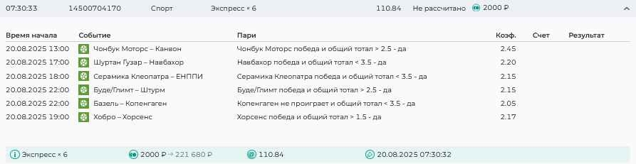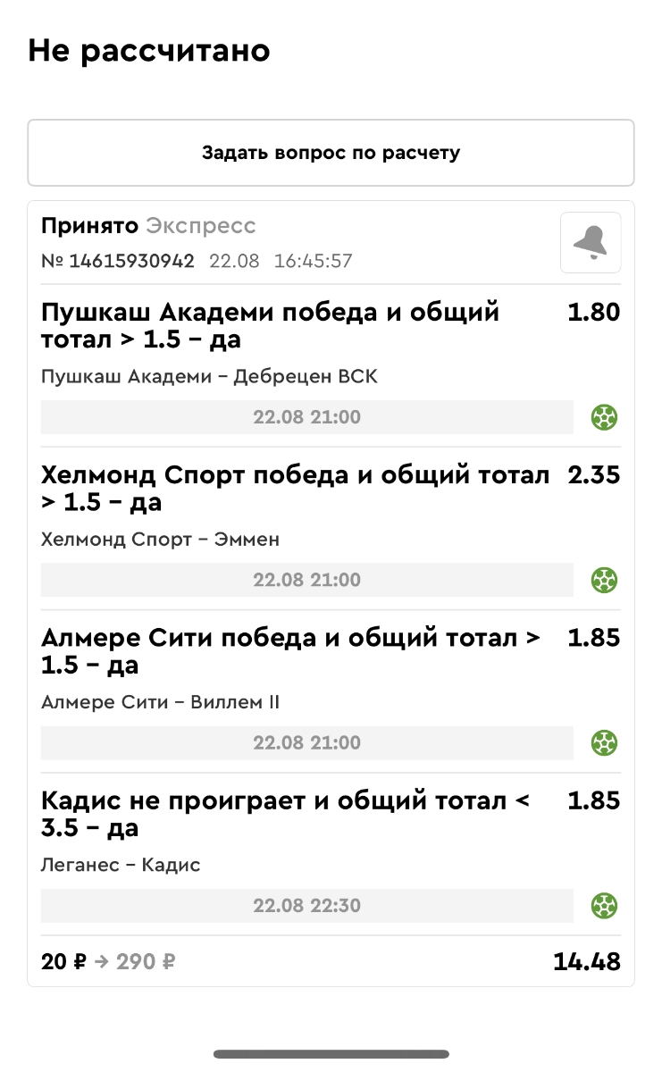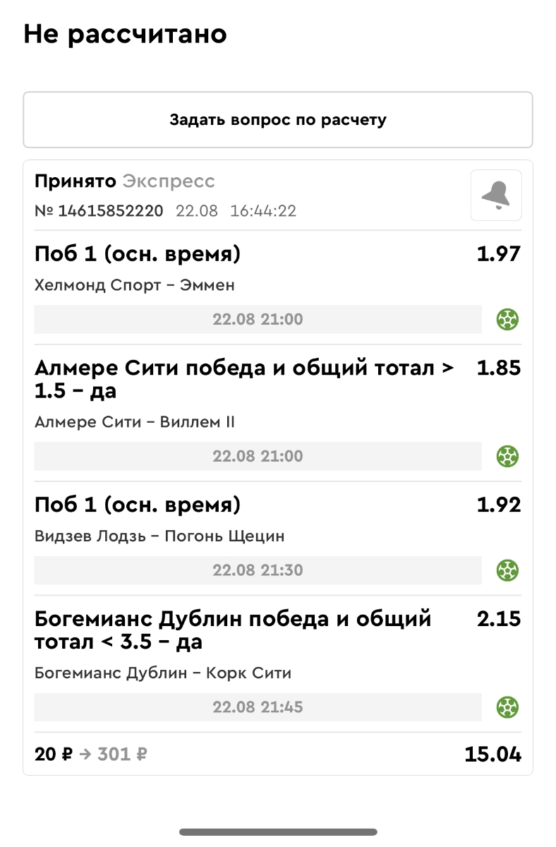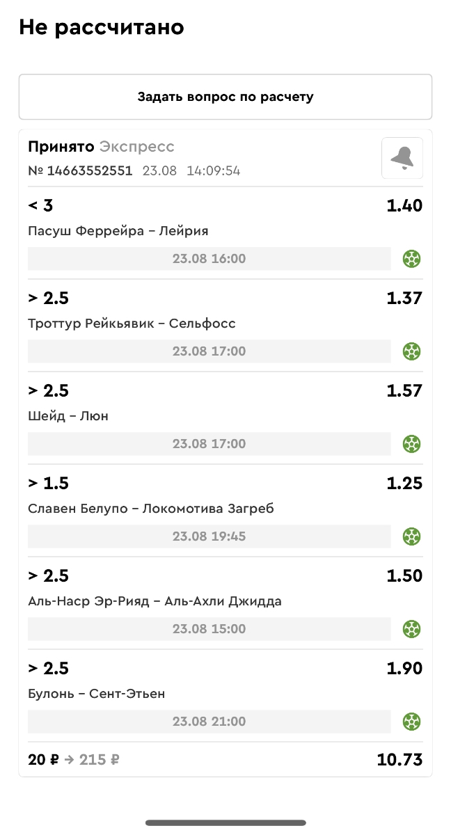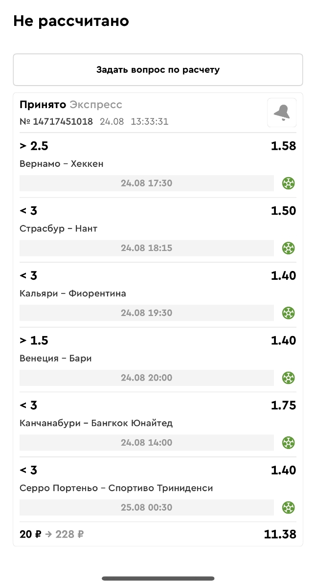 Koyaanisquatsi Hopi 98 Опубликовано 21 августа Автор Поделиться Опубликовано 21 августа Ежедневные экспрессы за 20.08.25 все проиграли. Итого за день - 9 000р. Экспрессы на 21.08.25 Итого за год по экспрессам - 990 500 ₽, за август - 182 000 р. Цитата Ссылка на комментарий https://brcbet.com/topic/429498-master-klass-po-razdevaniyu-bukmekera-tolko-fevral/page/26/#findComment-511209 Поделиться на другие сайты Поделиться