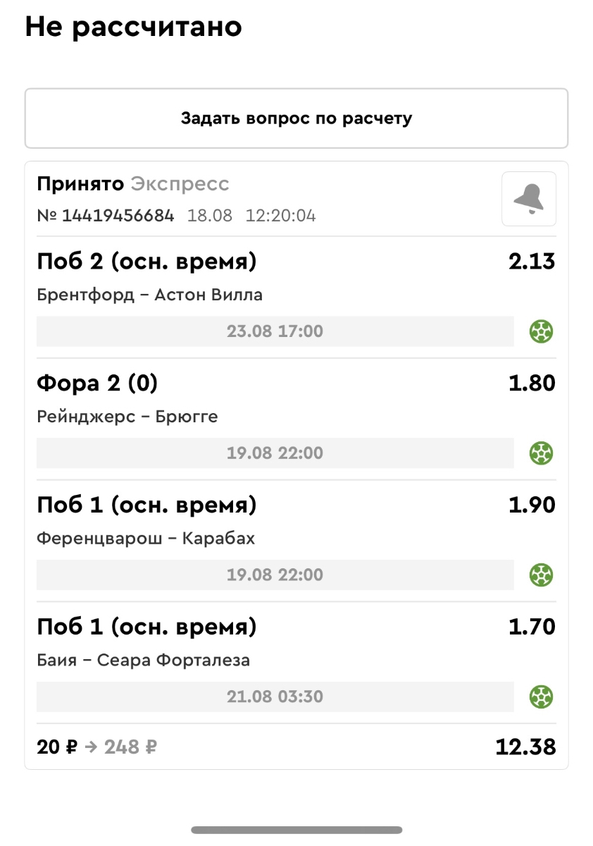 Koyaanisquatsi Hopi 98 Опубликовано 20 августа Автор Поделиться Опубликовано 20 августа Ежедневные экспрессы за 19.08.25 все проиграли. Итого за день - 9 000р. Экспрессы на 20.08.25 Итого за год по экспрессам - 981 500 ₽, за август - 173 000 р Цитата Ссылка на комментарий https://brcbet.com/topic/429498-master-klass-po-razdevaniyu-bukmekera-tolko-fevral/page/26/#findComment-511144 Поделиться на другие сайты Поделиться