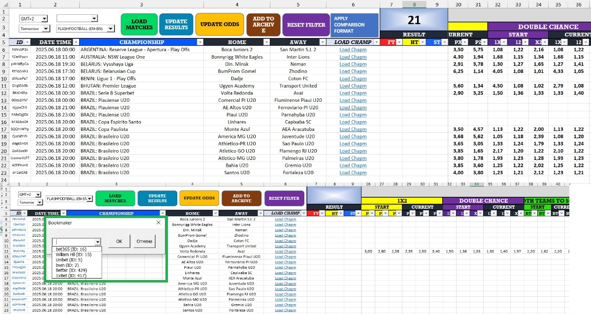 Denis221 102 Опубликовано 15 июня Поделиться Опубликовано 15 июня 23 часа назад, Druskoking777 сказал: Я хотел сказать, что я не очень хорош в программировании и кодировании, но после поиска помощи мне удалось добавить возможность выбора временного диапазона в файл. Как вы можете видеть на изображении, в ячейках F1 и G1 мы можем добавить временной диапазон. На изображении-примере я выбрал загрузку только матчей, которые начинаются между 00:00 и 03:00. И это, кажется, работает. Я хочу подчеркнуть и прояснить, что я не хочу присваивать себе никаких заслуг; я просто хотел внести свой вклад и сделать свою часть, как говорится. Я делюсь файлом здесь. Сначала я настроил таблицу турниров и чемпионатов, и она зависит от чемпионатов, выбранных каждым пользователем. В данном случае завтра между 00:00 и 03:00 пройдут матчи тех, которые я выбрал, но в зависимости от конфигурации таблицы чемпионатов, после завершения загрузки может не быть загружено ни одного матча. MACBETH_v3.2_(3 in 1)_14.06.25.xlsb 402.78 kB · 17 загрузок Там было две CB21 одну пропустил. Исправил,а то вдруг где КФ не тот будет MACBETH_v3.2_(3 in 1)_15.06.25.xlsb 1 Цитата Ссылка на комментарий https://brcbet.com/topic/429568-masterskaya-sashiaktualnye-tablitsy-posle-sboev/page/5/#findComment-508078 Поделиться на другие сайты Поделиться