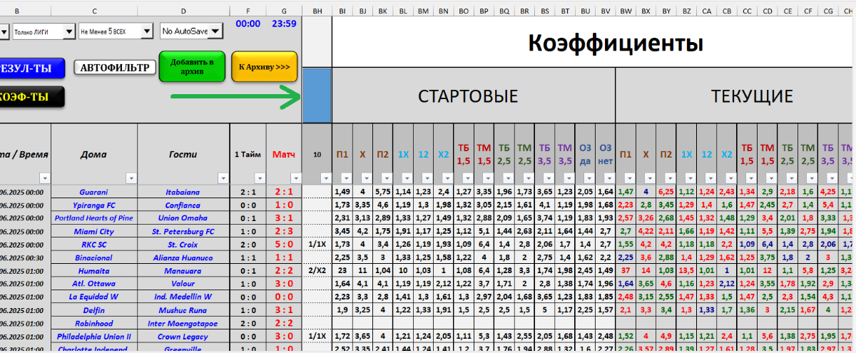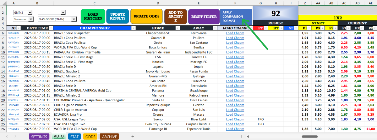 Druskoking777 627 Опубликовано 16 июня Поделиться Опубликовано 16 июня В 13.06.2025 в 16:48, Shurik91 сказал: обновил файлы, исправил опечатку в коде, спасибо Denis221 скачать нужно всем!! AltadarODDS_11.06.25.xlsb 567.11 kB · 37 загрузок MACBETH_v3.2_(3 in 1)_13.06.25.xlsb 339.44 kB · 39 загрузок Это тот же файл Altadar, который был опубликован и распространен Shurik91 Я добавил ту же опцию, что и в файле Macbeth Когда текущие коэффициенты уменьшаются относительно начальных коэффициентов, он меняет цвет на зеленый. Когда текущие коэффициенты увеличиваются относительно начальных коэффициентов, он меняет цвет на красный. Когда текущие коэффициенты равны начальным коэффициентам, он меняет цвет на синий. После загрузки игры вам нужно кликнуть мышкой по синему полю с надписью APPLY COMPARISON FORMAT На изображении это обозначено зеленой стрелкой. Как я уже говорил в файле Macbeth, желательно нажать на синюю кнопку после загрузки матчей... а также после обновления коэффициентов. AltadarODDS_16.06.25.xlsb 3 Цитата Ссылка на комментарий https://brcbet.com/topic/429568-masterskaya-sashiaktualnye-tablitsy-posle-sboev/page/5/#findComment-508138 Поделиться на другие сайты Поделиться