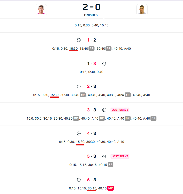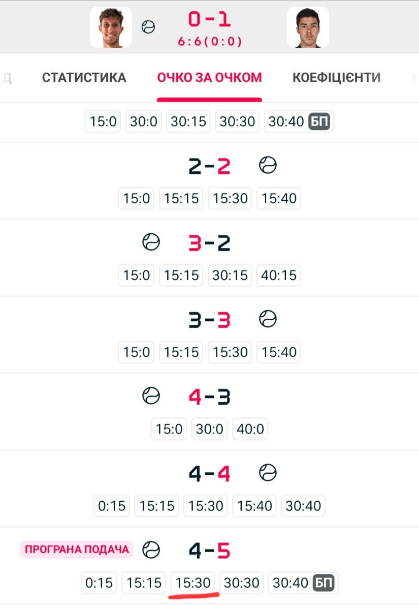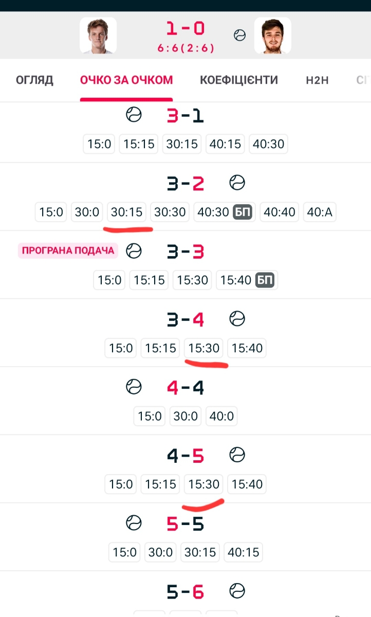2. Ждем подачу фаворита, если он проигрывает свою первую подачу т.е счет 0:15 не в его пользу, ставим быстренько на то что он выиграет 3 очко, кф примерно от 1.4-1.6 с вероятностью 90℅ ставка заходит.