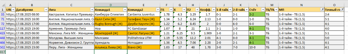 mihailopolya 95 Опубликовано 20 августа, 2025 Автор Поделиться Опубликовано 20 августа, 2025 6 минут назад, Кирилл Клейменов сказал: Для отбора - на ТБ2,5 - проверку которого задумывался парсер - всего достаточно... Возможно - если будут дополнения - для других прогнозов-отборов - нужна будет погода или другие даные... а пока - для начала теста - всё есть. Погода нужна, еще что? Порядок колонок устраивает? Цитата Ссылка на комментарий https://brcbet.com/topic/429610-parser-na-selenium-nb-net-po-prosbe-kirilla-kleymenova/#findComment-511157 Поделиться на другие сайты Поделиться