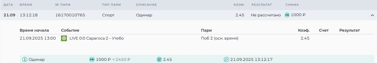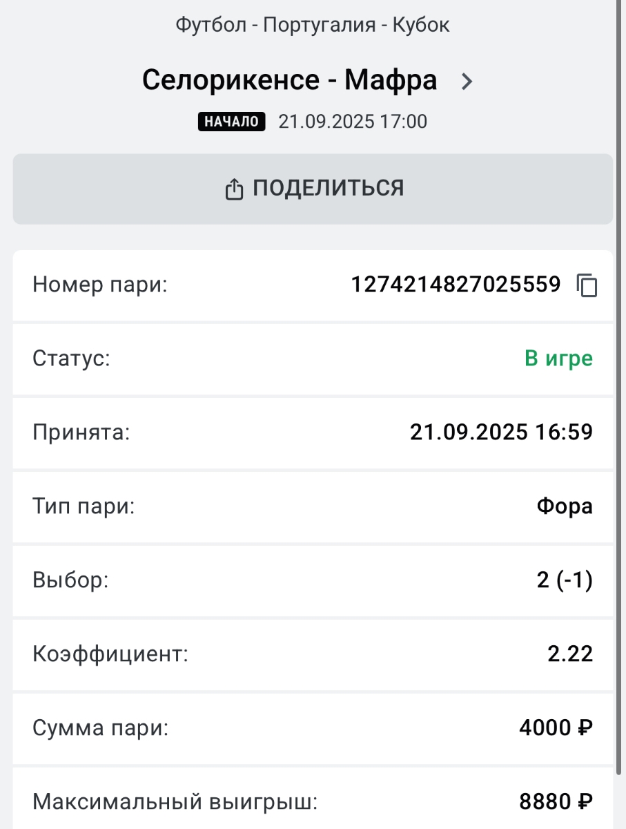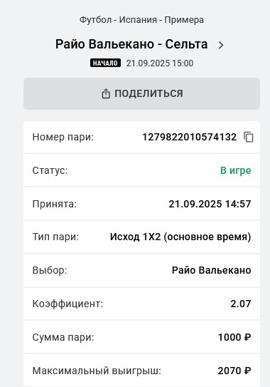 Koyaanisquatsi Hopi 99 Опубликовано 21 сентября, 2025 Автор Поделиться Опубликовано 21 сентября, 2025 Результаты за вчера 20.09.25. Догон 2 выигрыша на втором шаге, по одному на первом и на третьем, начинаем сегодня с первого шага, банк увеличился на 20 766 ₽, итого 543 941₽, +51,94%! Флет лайв 164 матчей, банк уменьшился на 1830 ₽, итого 171 460 ₽, +71,46%! Экспресс 10+ из флета, банк увеличился на 9453 р, итого 196 998 р,+96,998%, 2 экспресса в разгоне на сегодня с прошлого дня! Ссылка на комментарий https://brcbet.com/topic/429623-pereosmyslenie-popytka-nakukanit-buka-2/page/8/#findComment-512962 Поделиться на другие сайты Поделиться