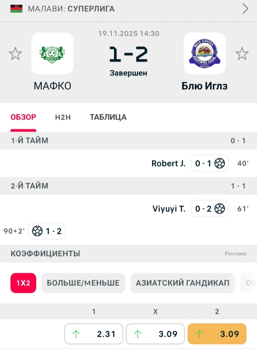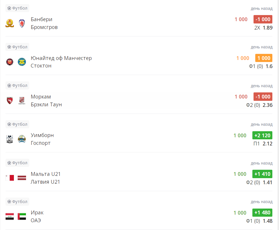 Постоянный Sweet Mask 634 Опубликовано 7 часов назад Автор Постоянный Поделиться Опубликовано 7 часов назад (изменено) 12 часов назад, Sweet Mask сказал: Адмира Ваккер Лиферинг 1 0001 000 П1 1.8 4-0 +++ ------------------------------------------------------------- Калаа Стад Габезьен 1 0001 000 Ф1 (0) 1.83 0-1 --- ------------------------------------------------------------- Нюрнберг II Мемминген 1 0001 000 Ф1 (-1) 1.81 2-0 +++ --------------------------------------------------------------- Ратчабури Патум Юнайтед 1 0001 000 П1 2.04 0-0 --- --------------------------------------------------------------- Дунав Минор Перник 1 0001 000 Ф1 (-1.5) 1.79 2-0 +++ -------------------------------------------------------------- Отрант Грбаль 1 0001 000 Ф1 (-1) 1.9 2-0 +++ --------------------------------------------------------------- Фортуна Дюссельдорф Магдебург 1 0001 000 Ф2 (0) 2.13 2-1 --- ------------------------------------------------------------ Politehnica UTM Бельцы 1 0001 000 П2 1.67 3-1 --- -------------------------------------------------------------- Орша Островец 1 0001 000 Ф2 (-1) 1.89 1-3 +++ Результат не внушает уверенности. Нужно дальше шлифовать) Изменено 6 часов назад пользователем Sweet Mask Цитата Ссылка на комментарий https://brcbet.com/topic/429669-speculum/page/2/#findComment-516880 Поделиться на другие сайты Поделиться