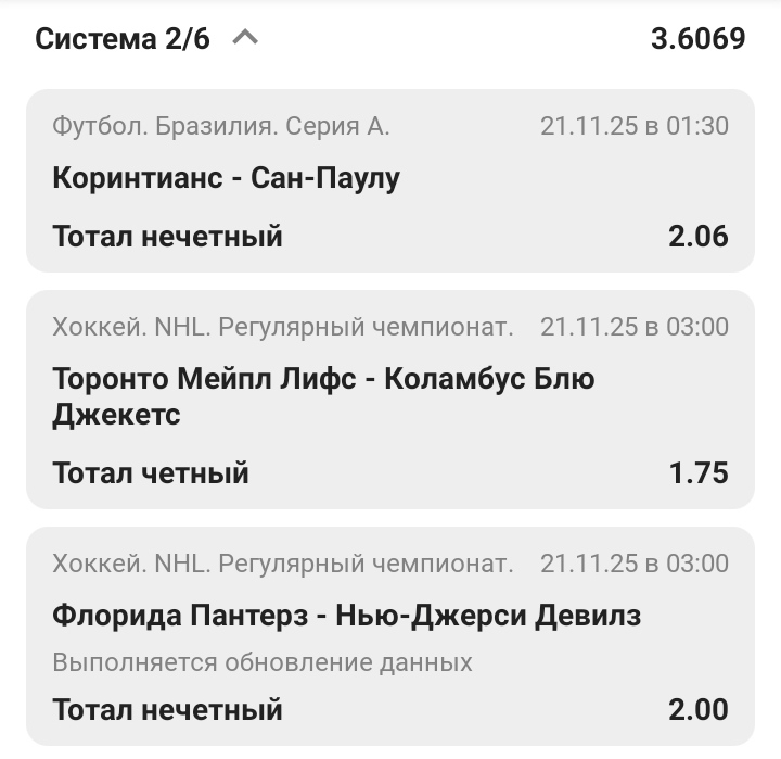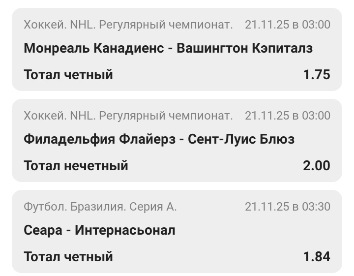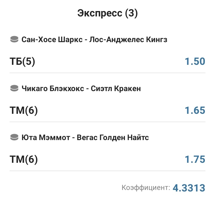 НБА 3 из четырех угадал. Это круто. Хоккей тоталы жду. Чет, нечет тоже есть куда идти. Остальное мусор, не угадал
