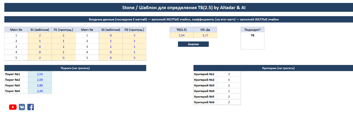 Fiksar 309 Опубликовано 15 декабря, 2025 Поделиться Опубликовано 15 декабря, 2025 13 часов назад, Nazarnineangels сказал: Stone - шаблон из 3 отборов, которые были найдены с помощью нейросети. Проход проверялся на большой истории футбольных матчей и составляет 60-65% со средним коэффициентом 1.75. Инструкция: Нужно ввести по 5 последних матчей обеих команд дома/в гостях, затем коэффициент на ТБ(2.5) и ОЗ: Да, после нажмите «Анализ», если по какому-то критерию подходит матч, то вы увидите «ТБ» в колонке «Подходит?», если матч не подходит, то в этой колонке будет пусто. P.S. Для тех кто хочет проход 100% со средним кф 2, тогда эта тема им не подходит, но те кто понимает что при таких кф с проходом 60-65% это потолок тогда желаю удачи! Stone (RU).xlsb 20.79 kB · 18 загрузок Stone (ENG).xlsb 20.81 kB · 7 загрузок Спасибо большое Назар!!! 3 Цитата Ссылка на комментарий https://brcbet.com/topic/429700-stone-shablon-dlya-opredeleniya-tb25/#findComment-518290 Поделиться на другие сайты Поделиться
